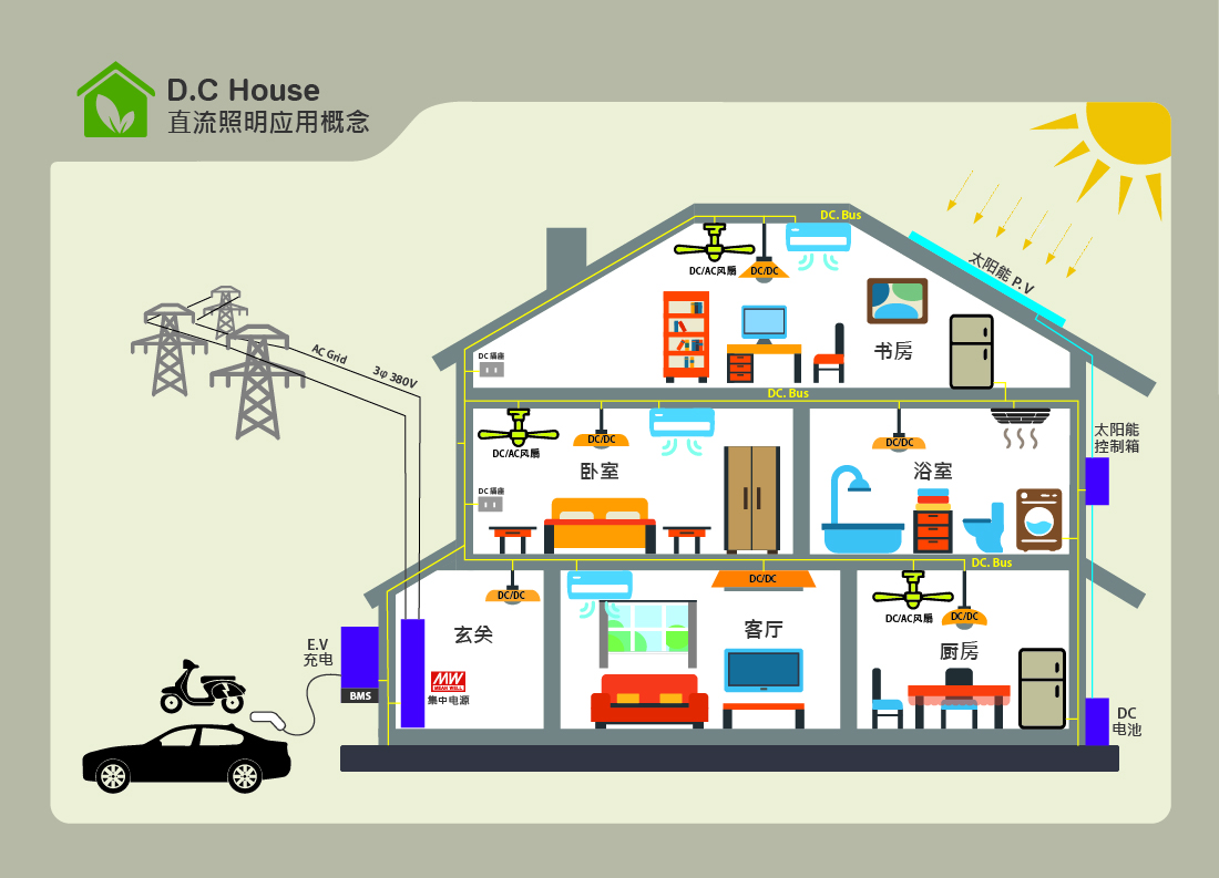 由于再生能源已是未來發(fā)展趨勢,因此DC House不再只是一個概念,而是必要的基礎(chǔ)設(shè)施。因此,如何提高電力轉(zhuǎn)換效能在交流電轉(zhuǎn)換直流電,或直流電轉(zhuǎn)換交流電都是不可忽視的議題。明緯將以此為出發(fā)點,引領(lǐng)成為直流供電室內(nèi)應(yīng)用先驅(qū),定義新的直流集中供電照明應(yīng)用方式,以達到降低功率轉(zhuǎn)換過程的損失。