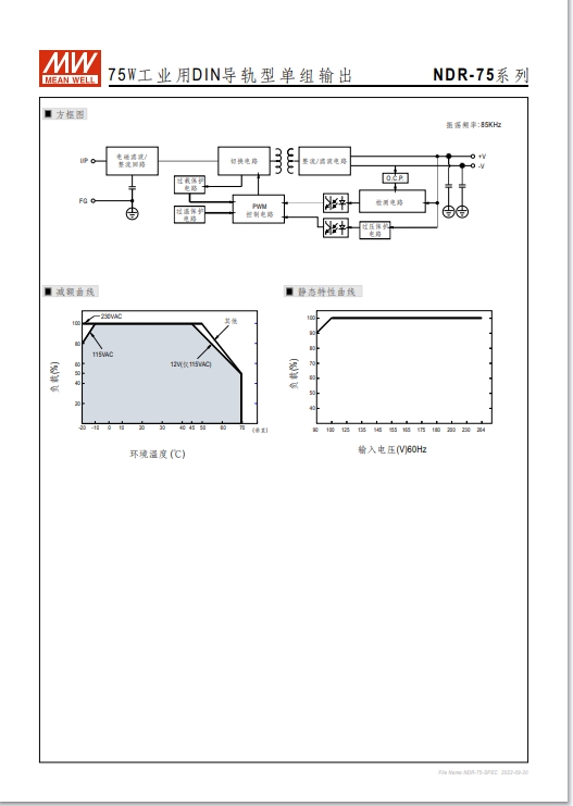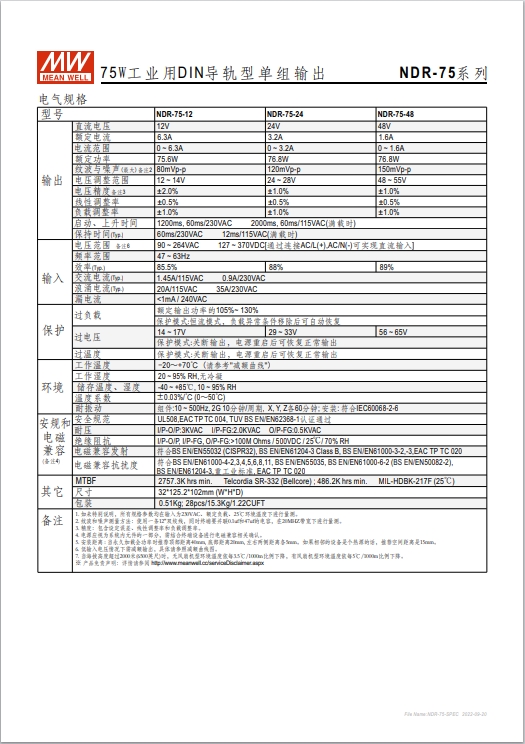瓦數(shù): 金屬殼,經(jīng)濟(jì)款 單相, 全范圍輸入 窄面寬設(shè)計(jì):32~85.5mm EMC EN55022 class B 適合安裝于DIN rail TS-35 / 7.5或15 3年保固期
