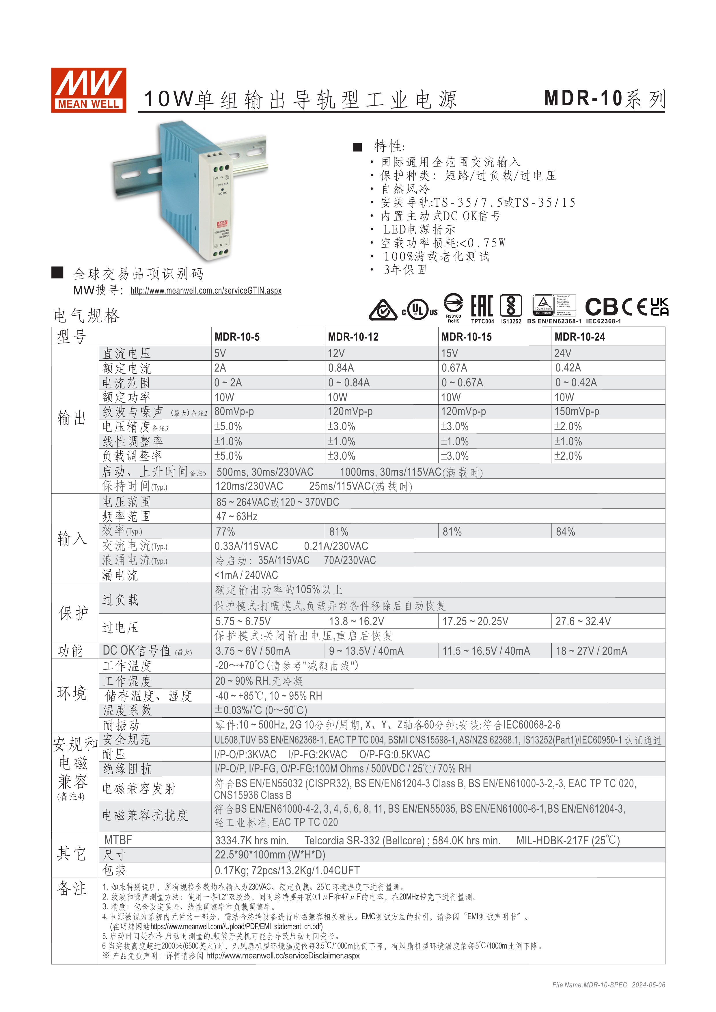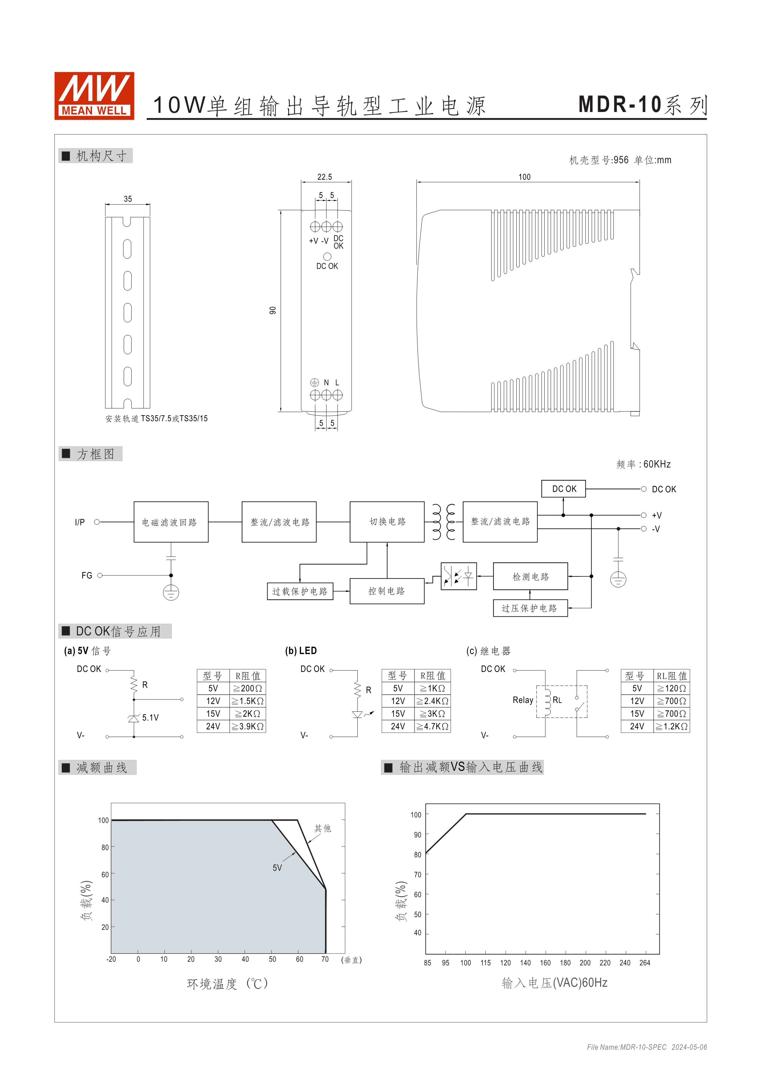 超薄型塑料機(jī)殼 單相,全范圍輸入 空載待機(jī)消耗瓦數(shù)<0.75W~1W 適合安裝于DIN rail TS-35 / 7.5 或 15 內(nèi)建主動式功率因子矯正功能(active PFC) DC OK訊號輸出(MDR-10/20) DC OK繼電器接點(relay contact)信號輸出(MDR-40/60/100) 適用于Class I, Div 2 T4危險區(qū)域(MDR-40/60)