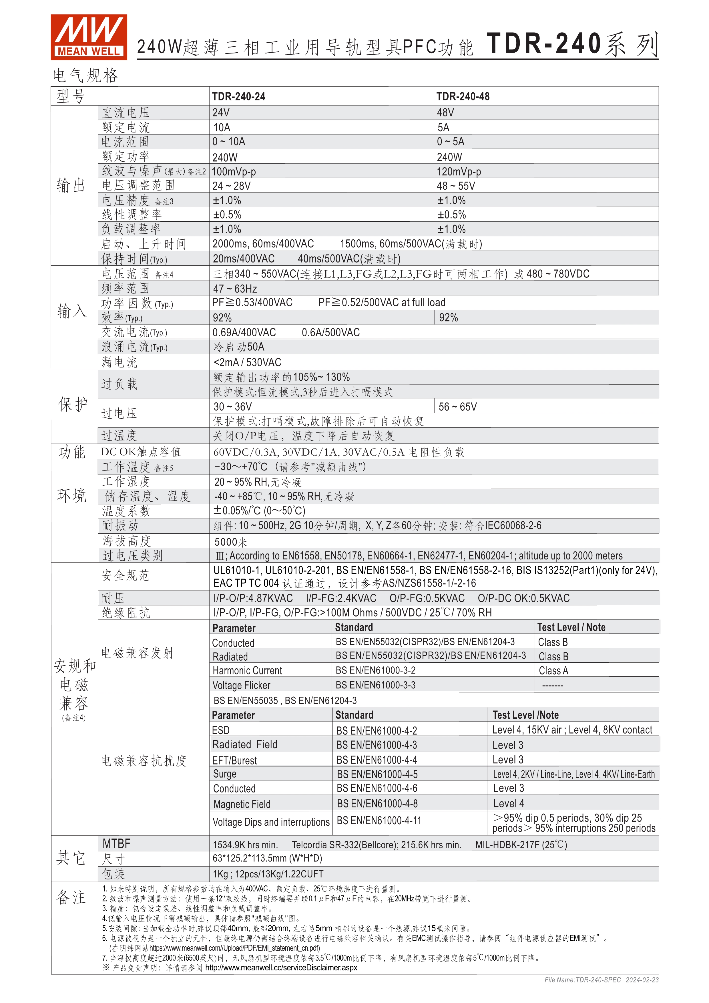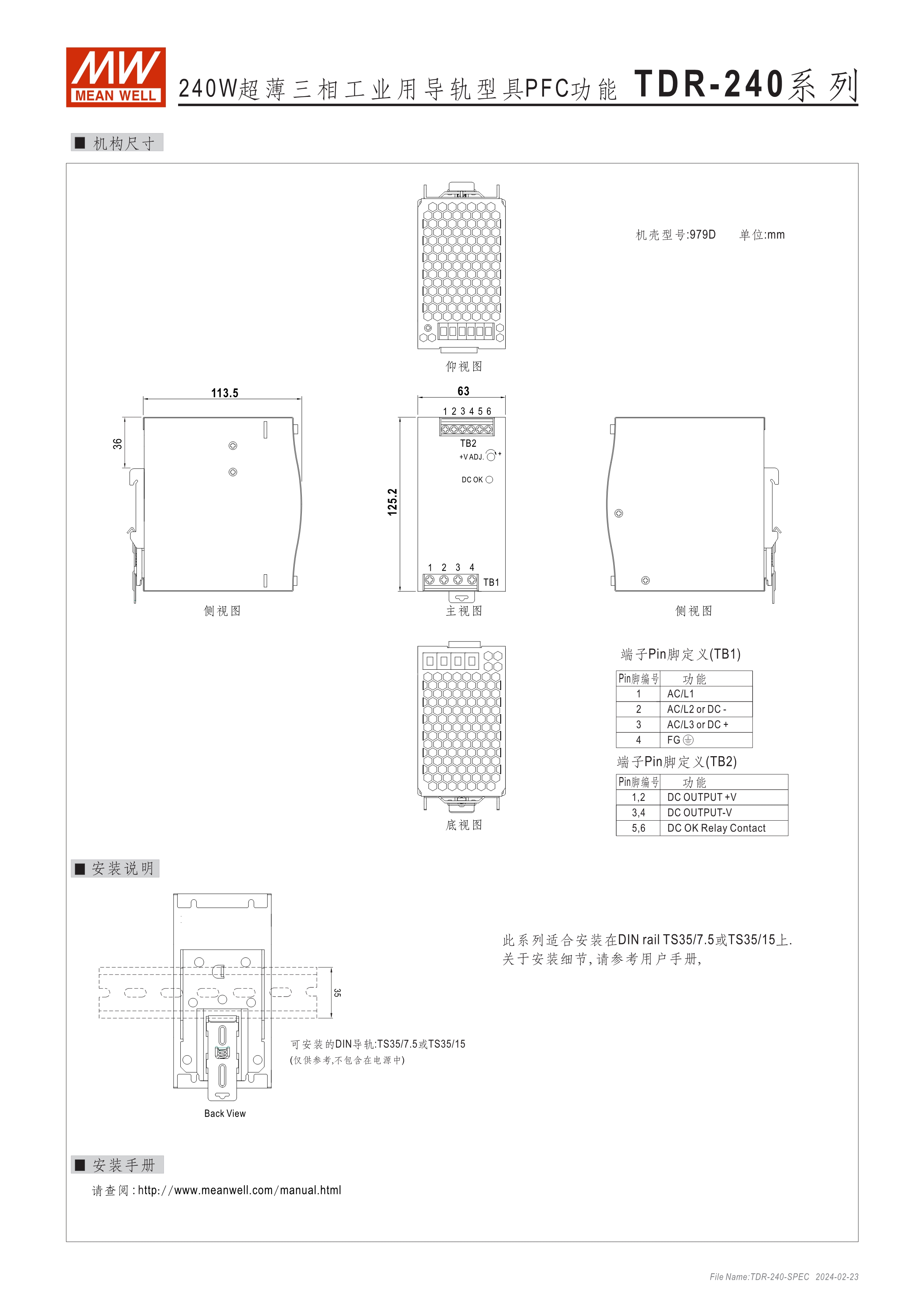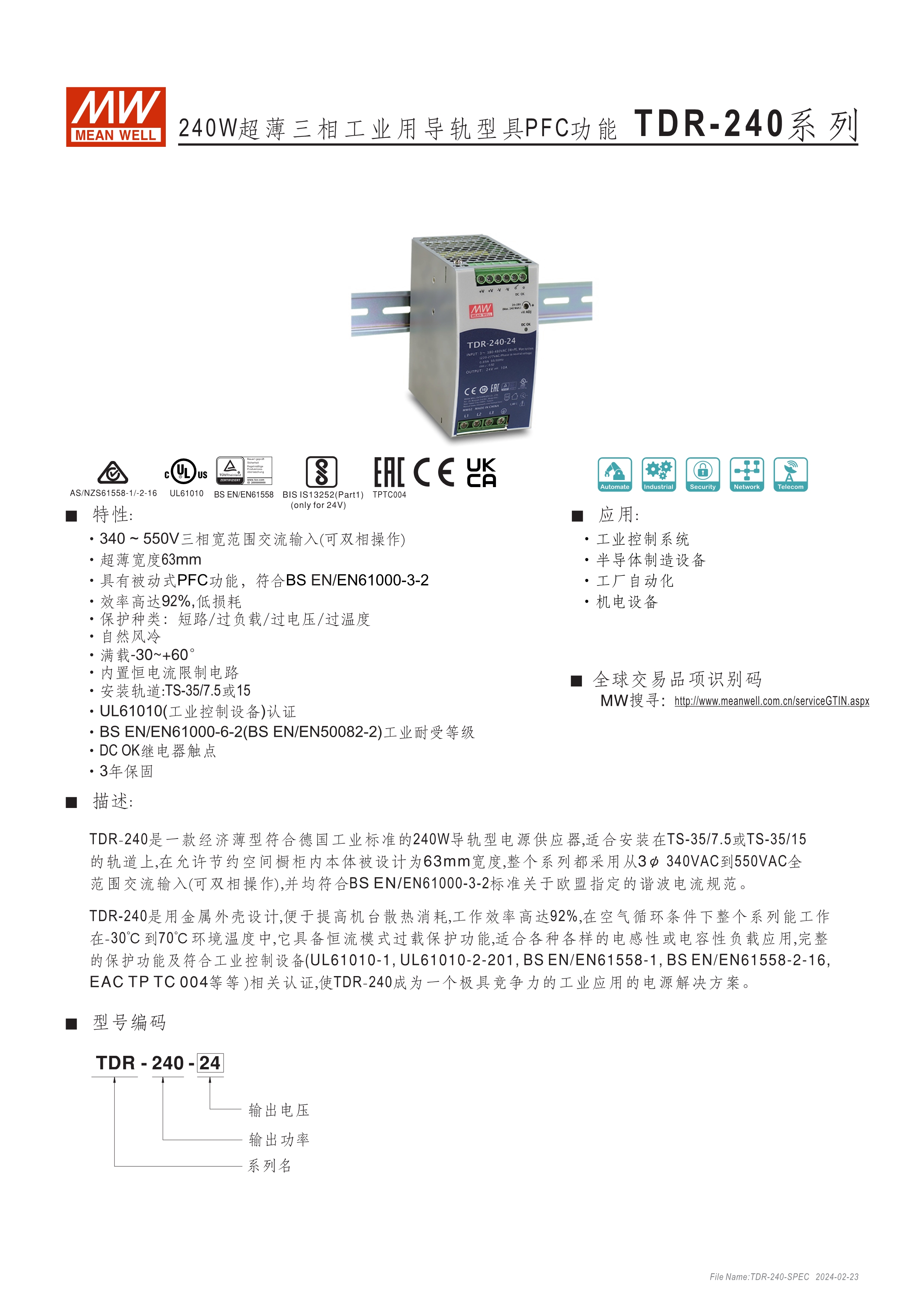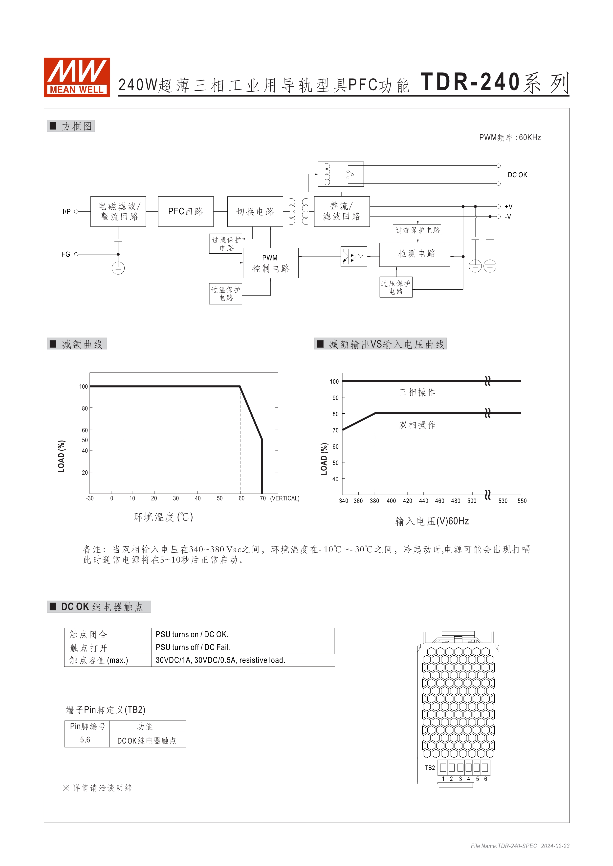 金屬殼,薄型設(shè)計(jì) 三相, 340~550VAC輸入 高工作效率達(dá)94.5% 內(nèi)建主動(dòng)式功率因子矯正功能(active PFC) 適合安裝于DIN rail TS-35 / 7.5 或 15 內(nèi)建DC OK繼電器接點(diǎn)(Relay contact)