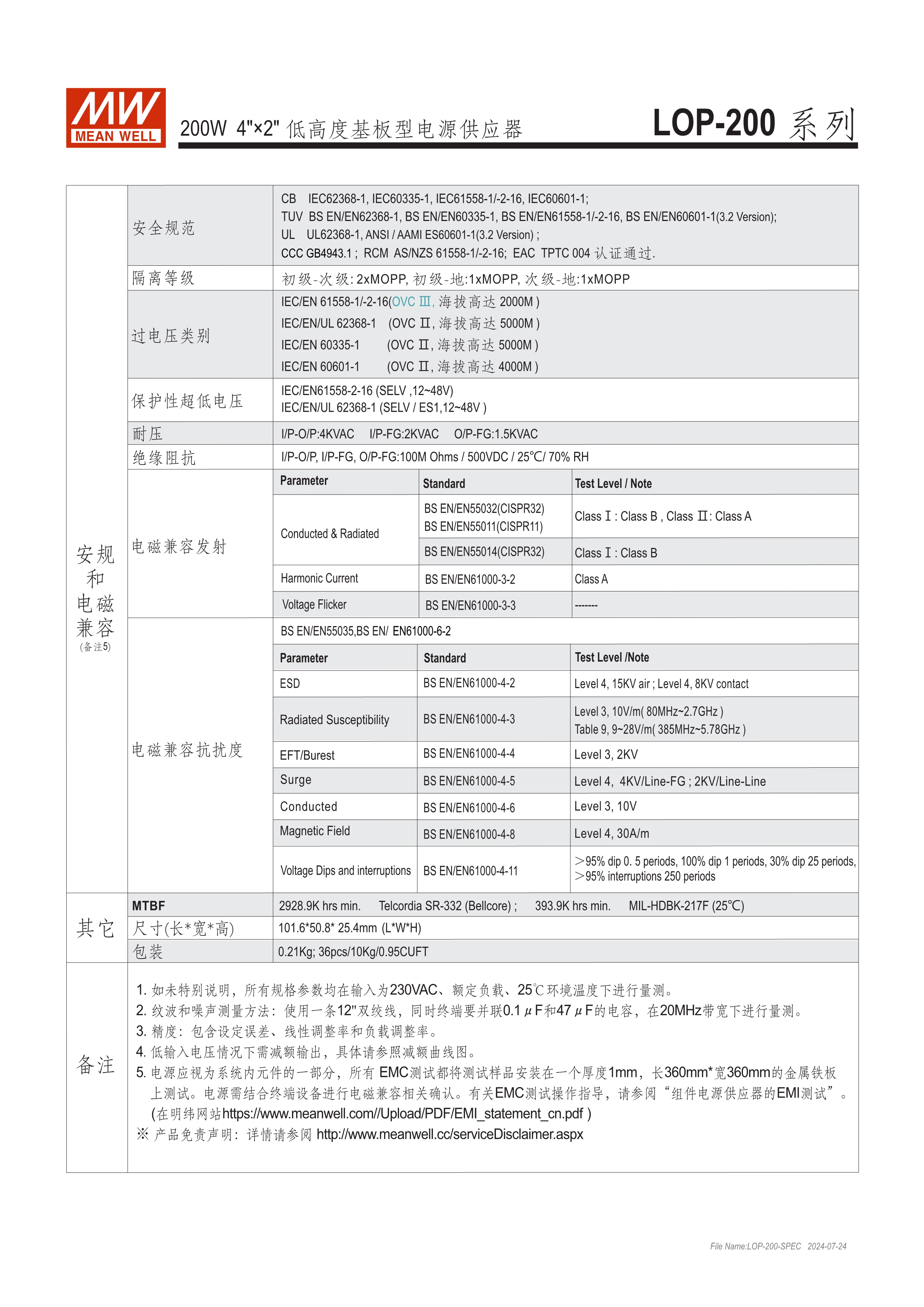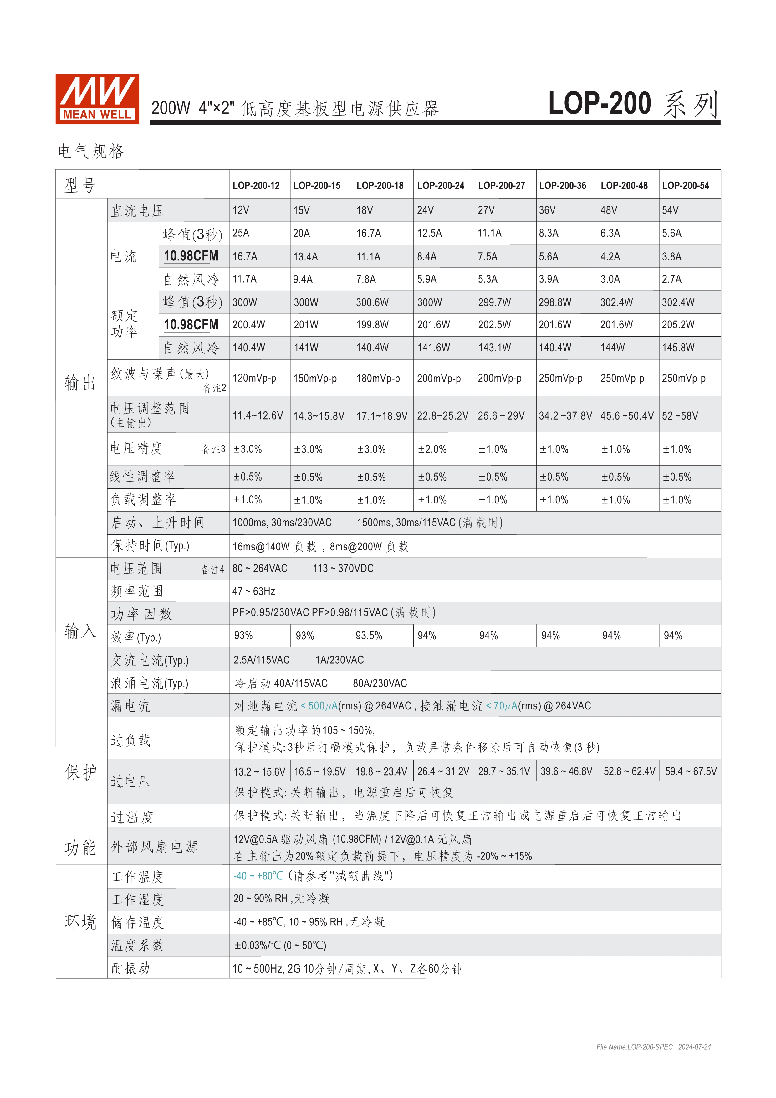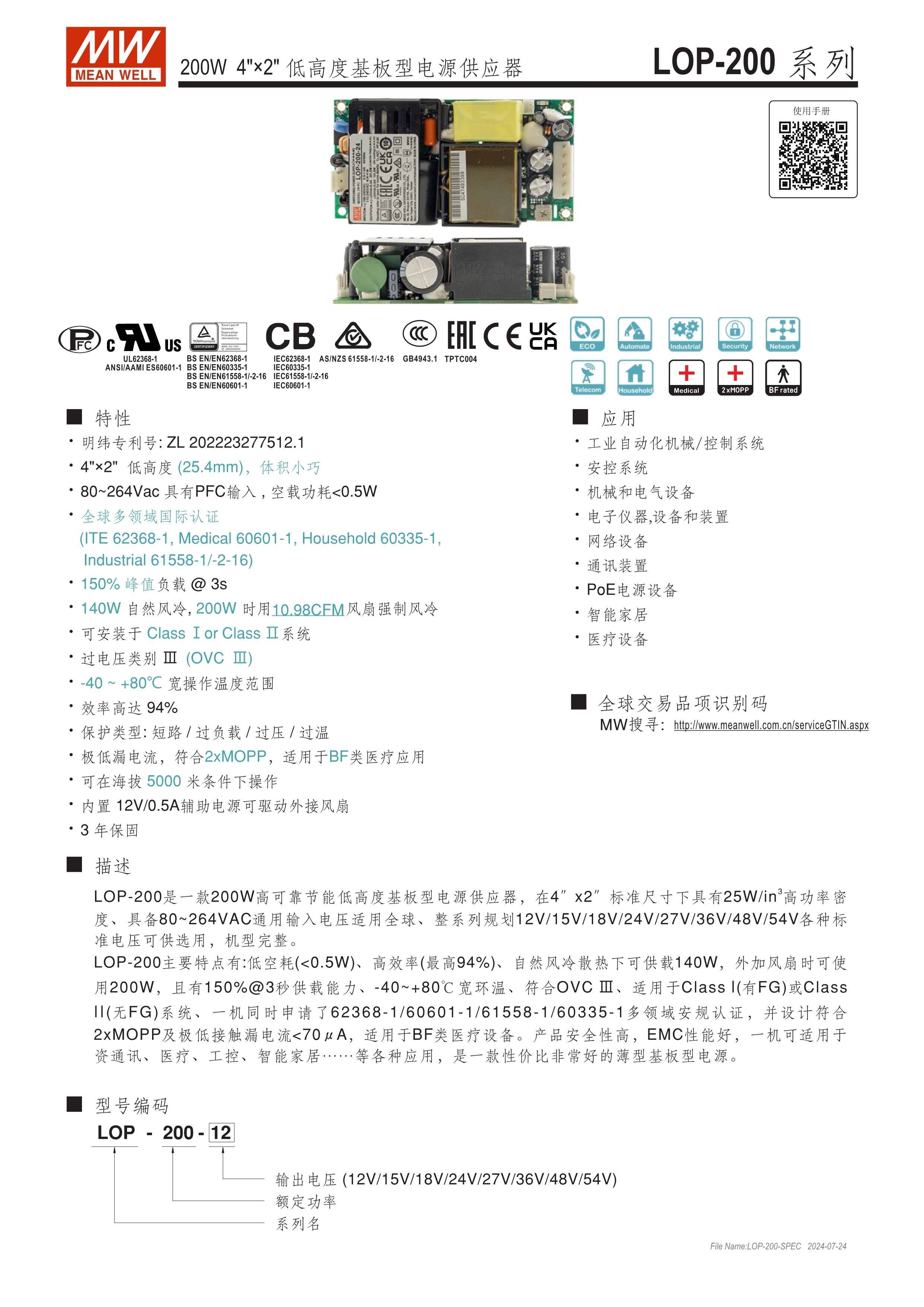 明緯專(zhuān)利號(hào):ZL 202223277512.1 4"x2" 和 5"x3" 低高度小巧外型 (25.4mm~33.5mm) 全球安規(guī)多領(lǐng)域認(rèn)證 (資通訊62368-1, 醫(yī)療60601-1, 家用60335-1, 工業(yè)用61558-1/-2-16) 150%峰值負(fù)載@3秒 符合Class I或Class II 過(guò)電壓類(lèi)別III (OVC III) -40℃ ~ +80℃寬操作溫度範(fàn)圍