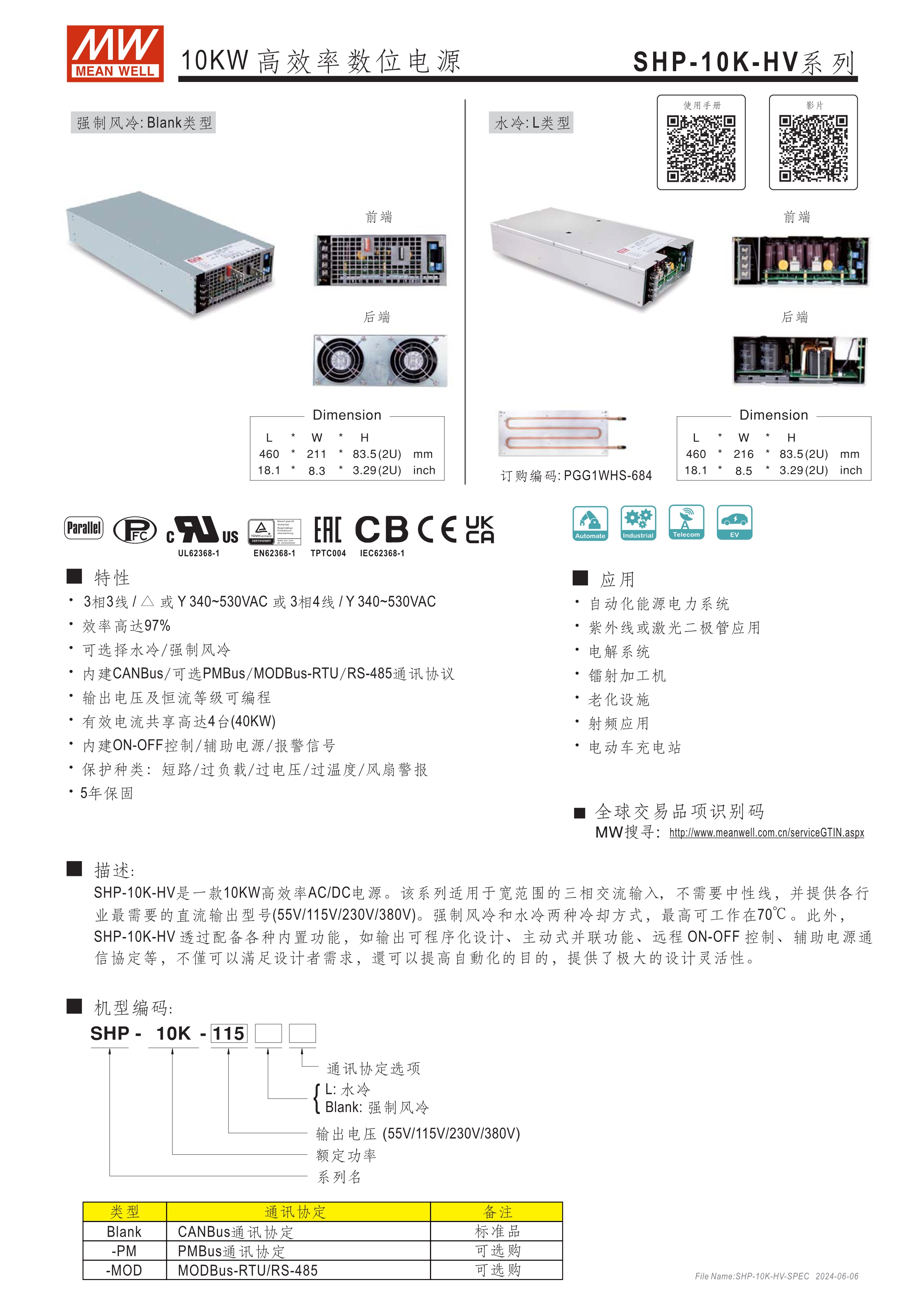 三相三線無中性線/340~530VAC寬輸入范圍 可選擇水冷/強(qiáng)制風(fēng)冷 內(nèi)建CANBus/可選PMBus通訊協(xié)議/MODBus-RTU/RS-485 輸出電壓及恒流等級可編程 有效電流共享高達(dá)4臺 內(nèi)建ONOFF控制/輔助電源/報警信號 5年保固