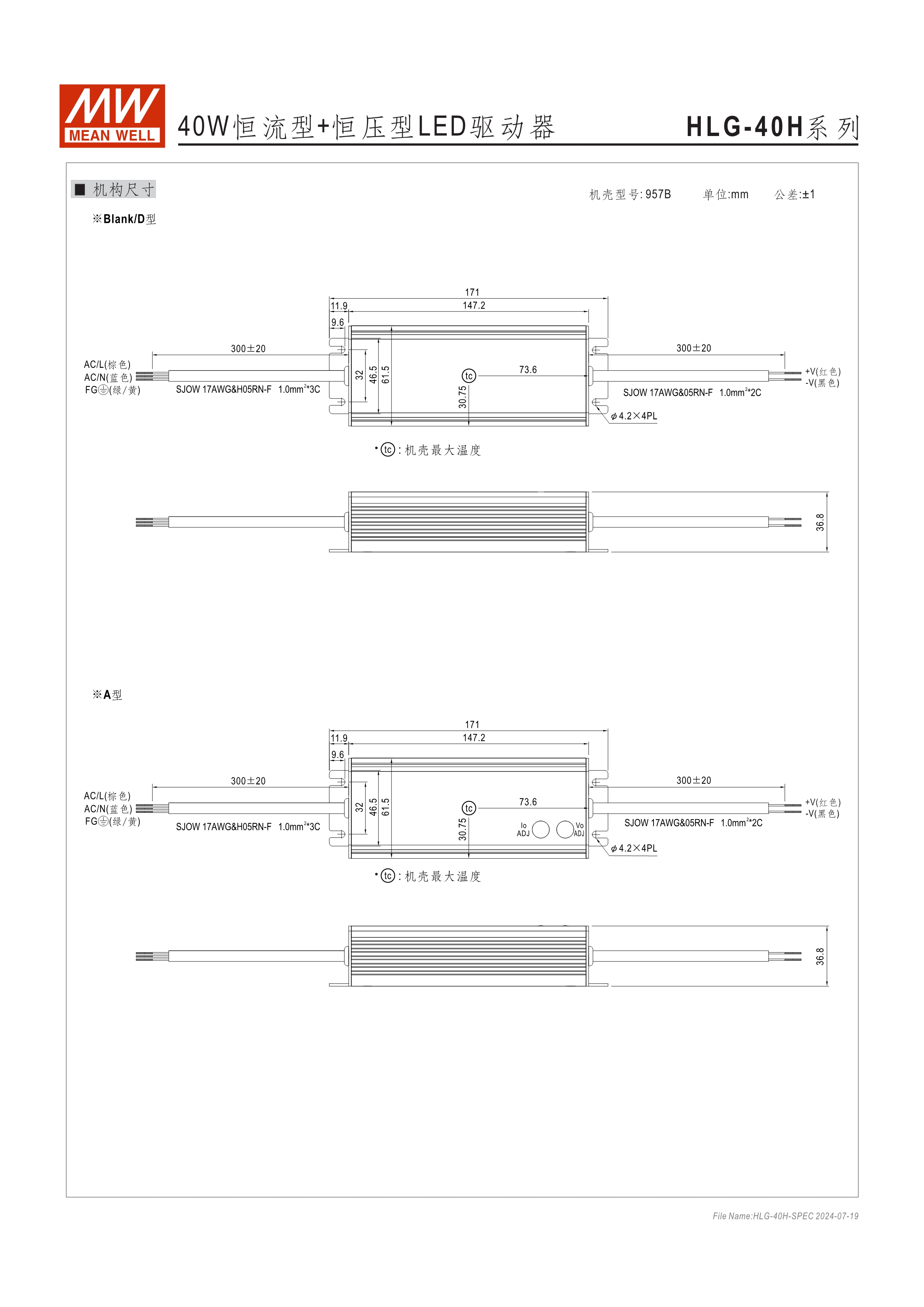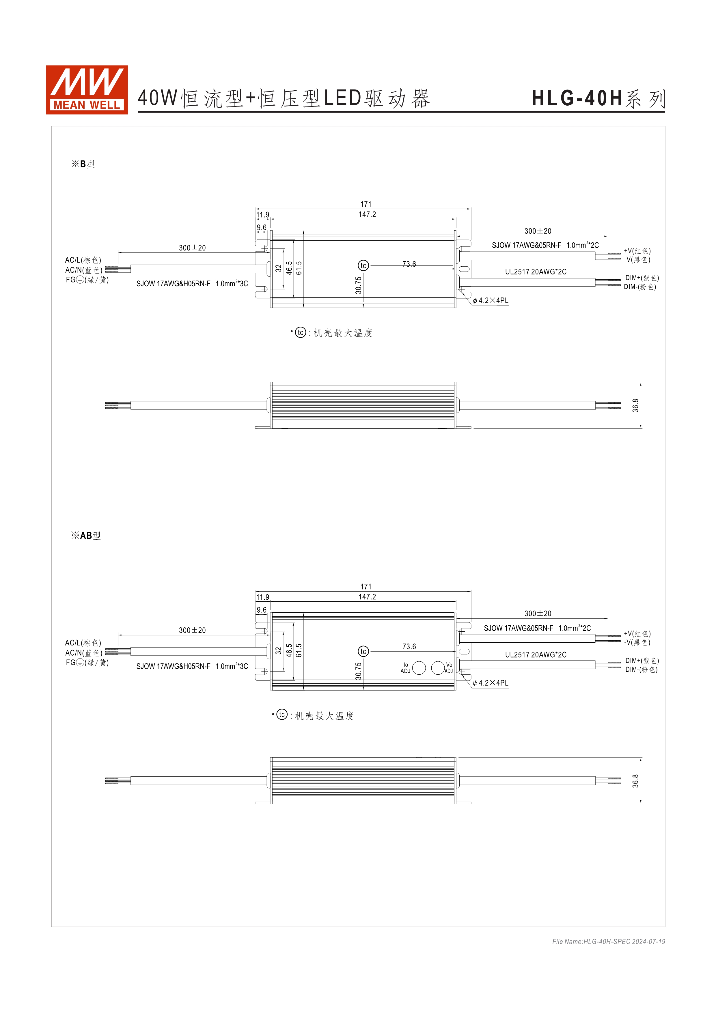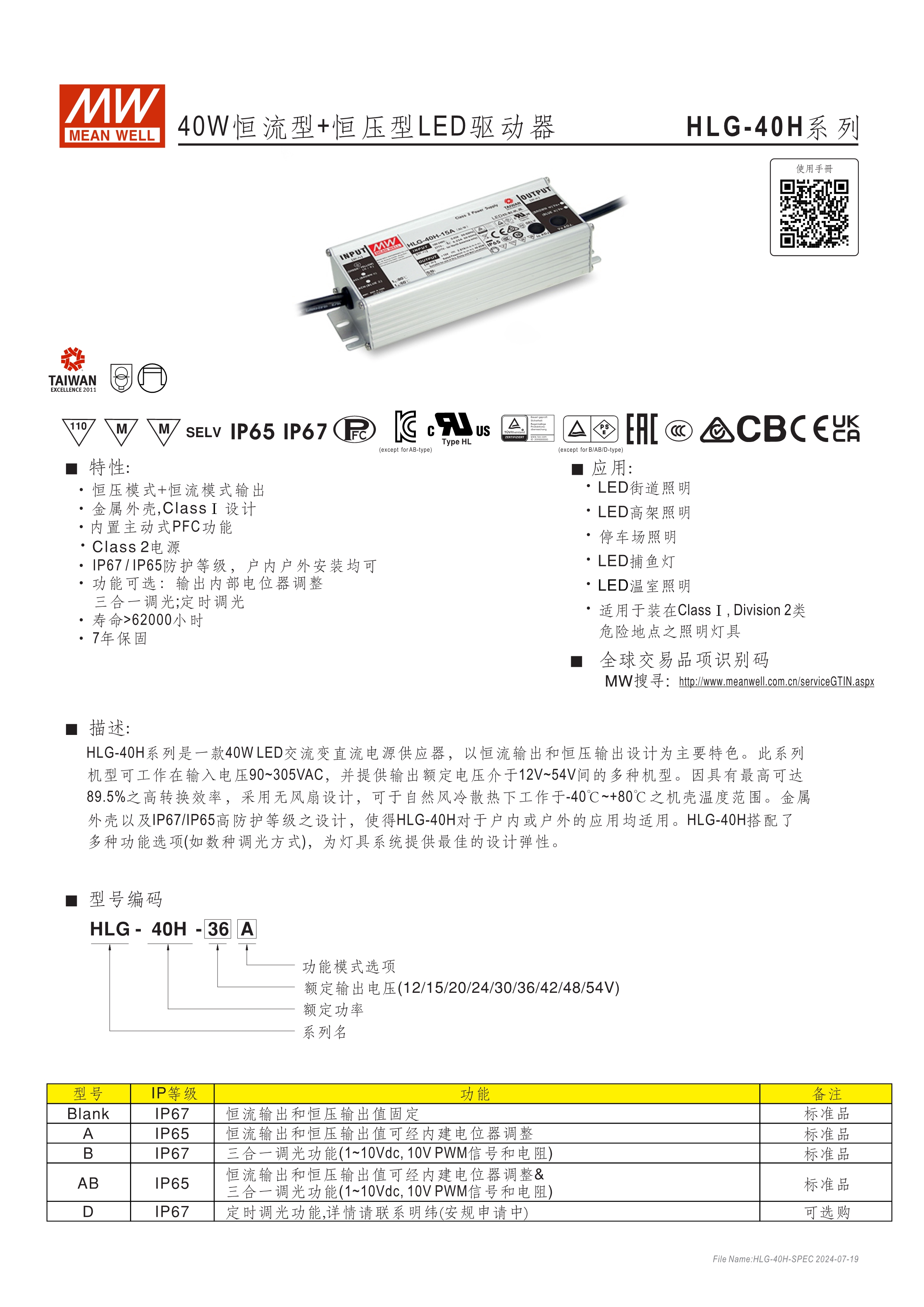 90~305VAC交流輸入,內(nèi)建主動式功率因子矯正功能(active PFC) 96%超高效率(HLG-600H) 金屬外殼,IP67/IP65防護(hù)等級可用于戶外與室內(nèi) 功能選項 : 輸出可經(jīng)由電位器調(diào)整;三合一調(diào)光(1~10Vdc或10V PWM信號或電阻);定時調(diào)光 Type "HL" LED電源適用在安裝于Class I, Division 2 類 危險地點之照明燈具 適合于LED路燈、戶外照明及需求高IP防護(hù)等級之戶外應(yīng)用 另有IP68/-55℃開機(jī)/10G震動承受能力等選項(細(xì)節(jié)請與明緯聯(lián)系) 7年保固期