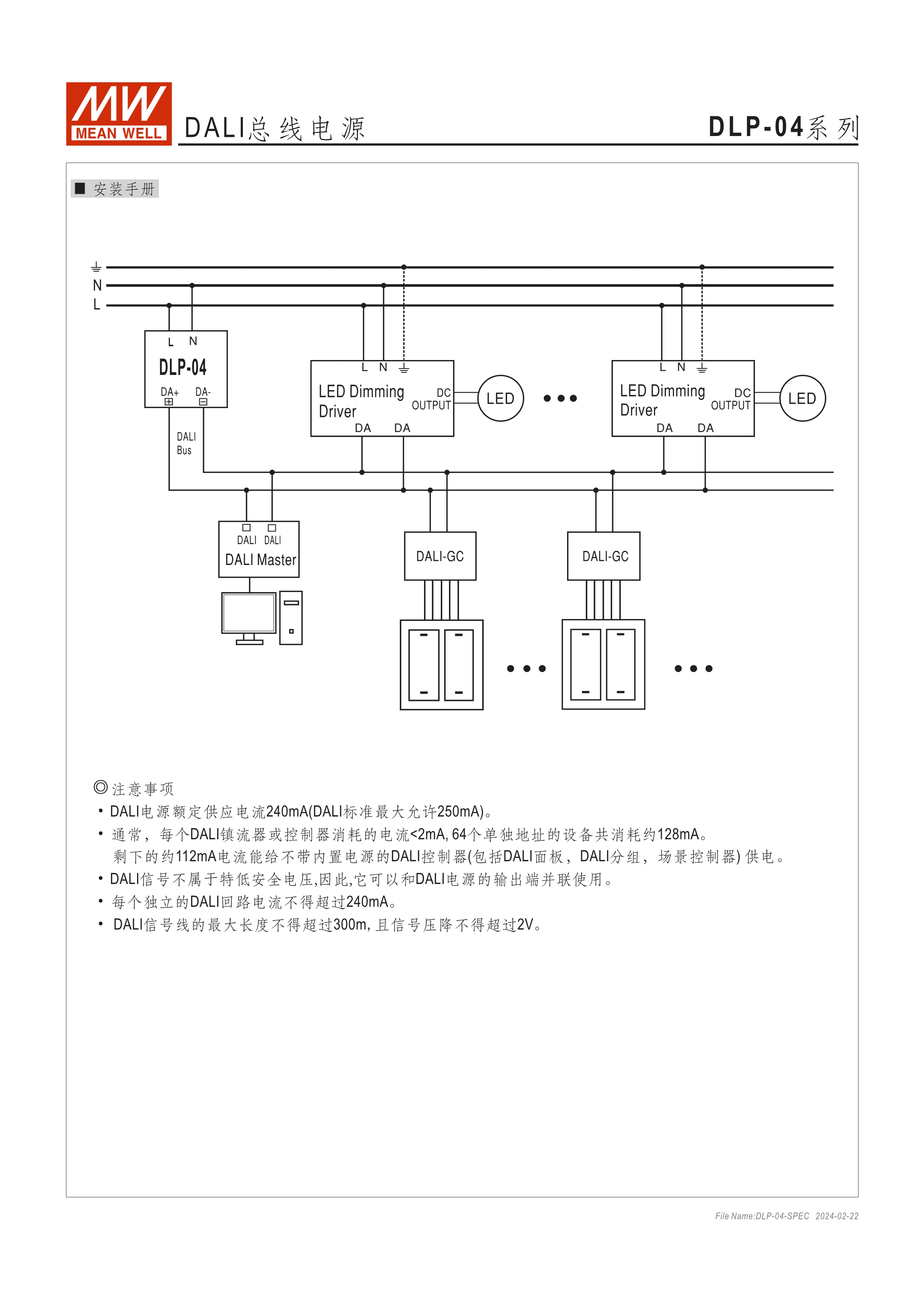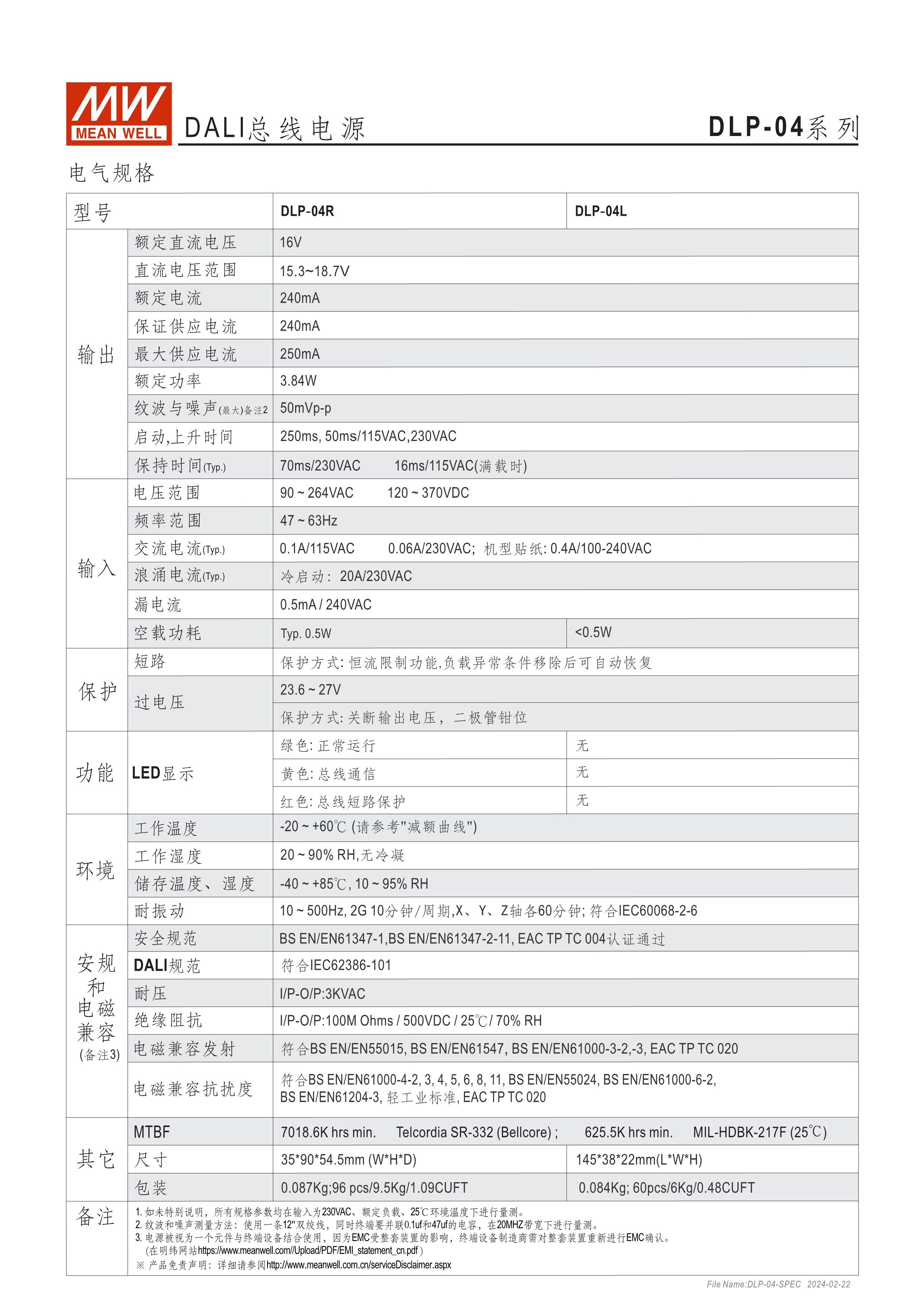 90~295VAC全范圍輸入 超薄設(shè)計(jì) 塑料機(jī)殼,class II設(shè)計(jì) 低空載功耗: <0.5W 可承受300VAC突波輸入5秒 工作溫度: -20~+60℃ 保護(hù)種類:過流保護(hù)、短路保護(hù) 尺寸: DLP-04R : 35*90*54.5 mm (W*H*D) DLP-04L : 145*38*22 mm (L*W*H) 3年保固