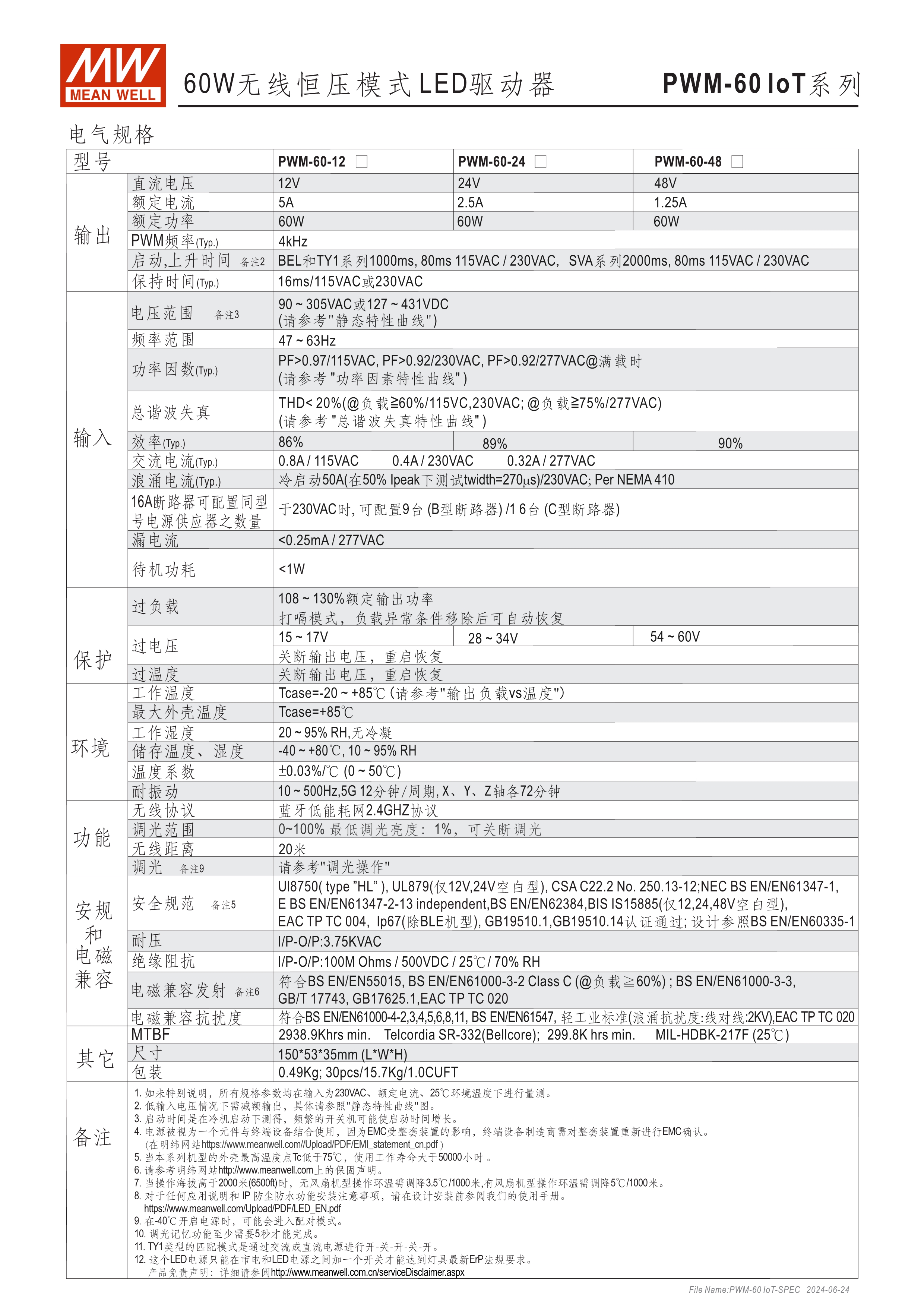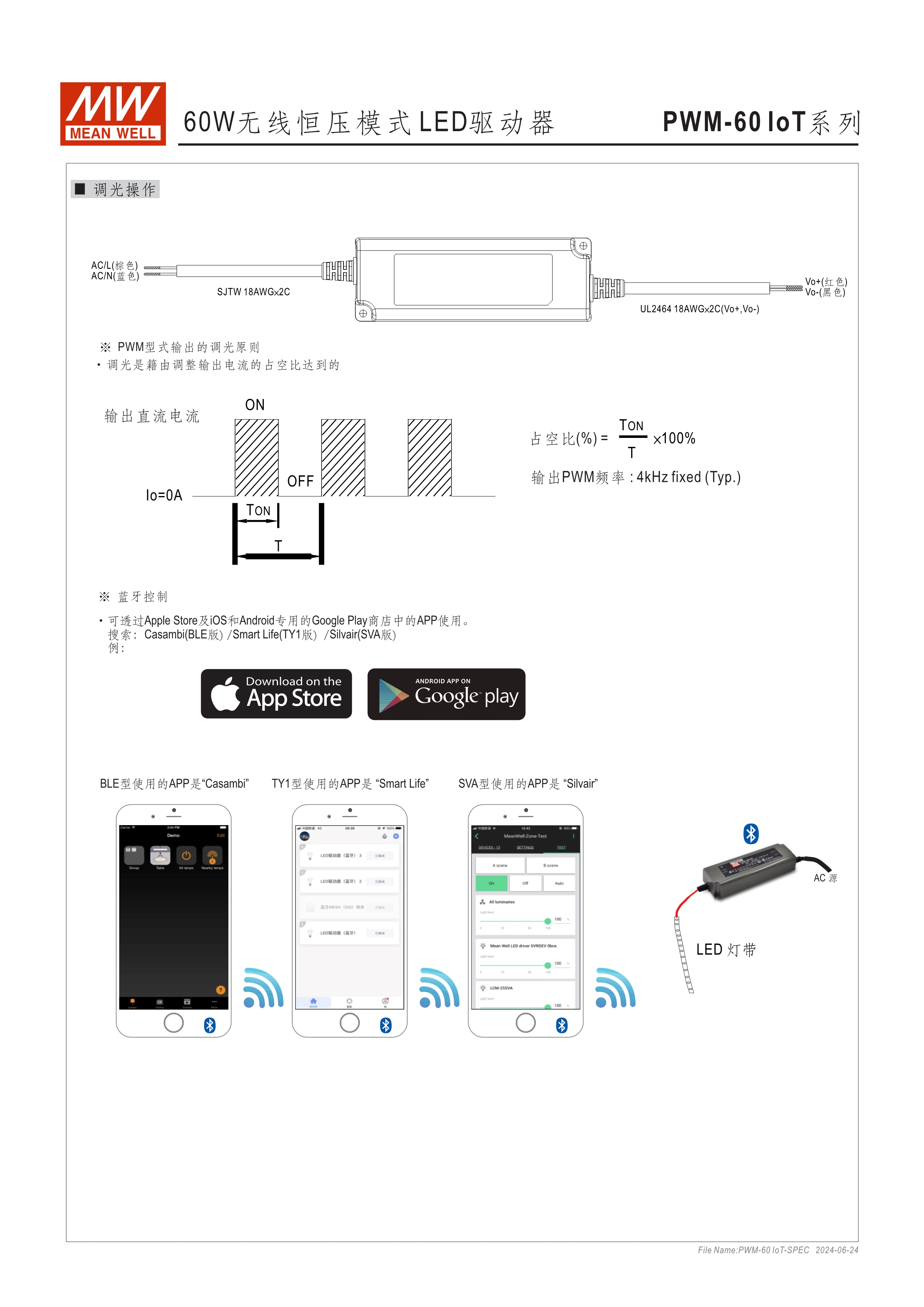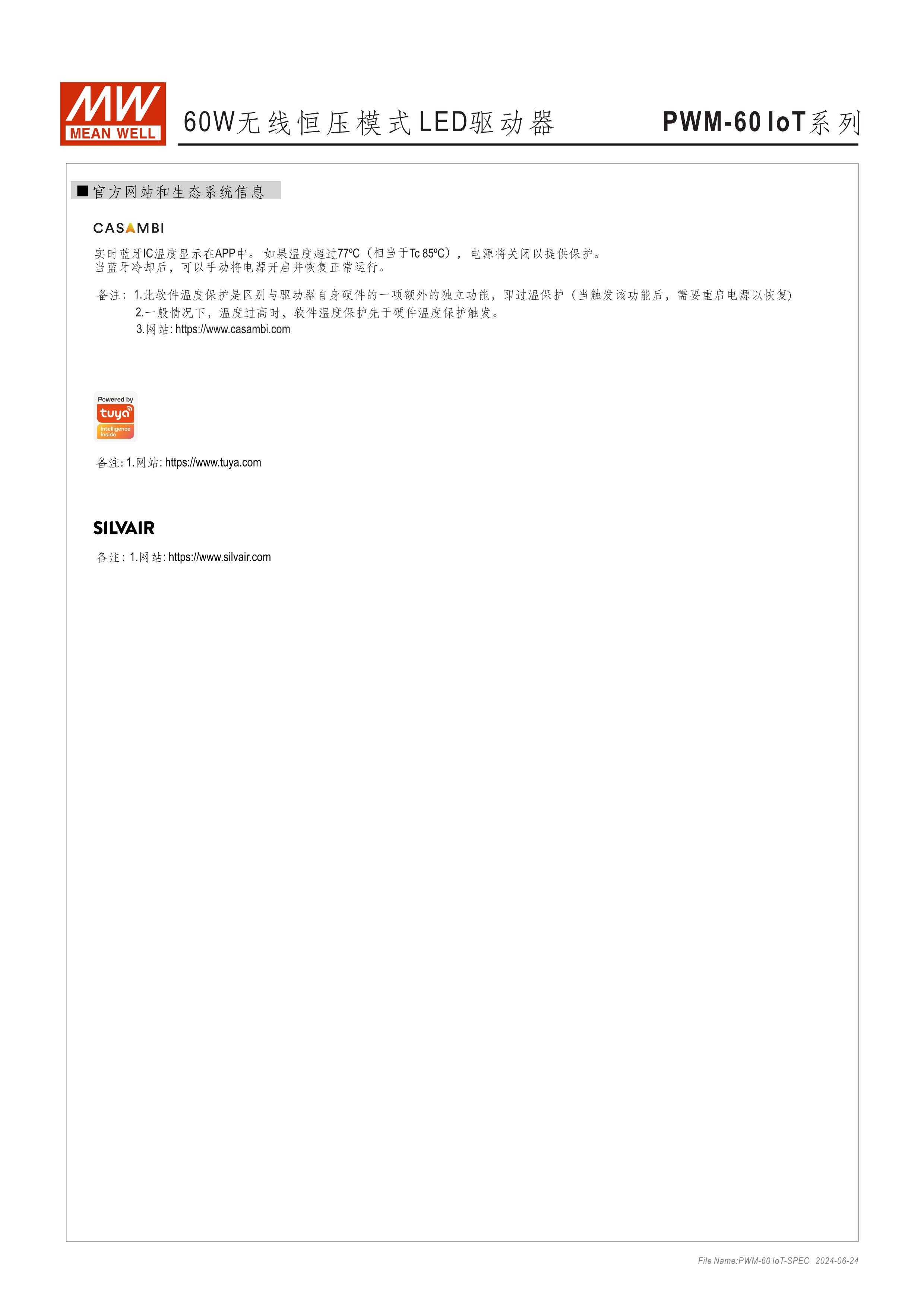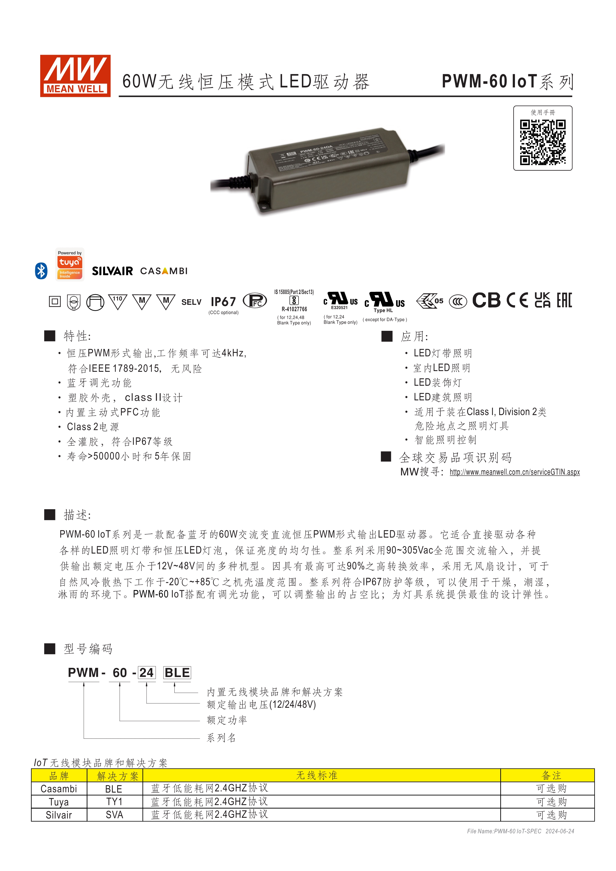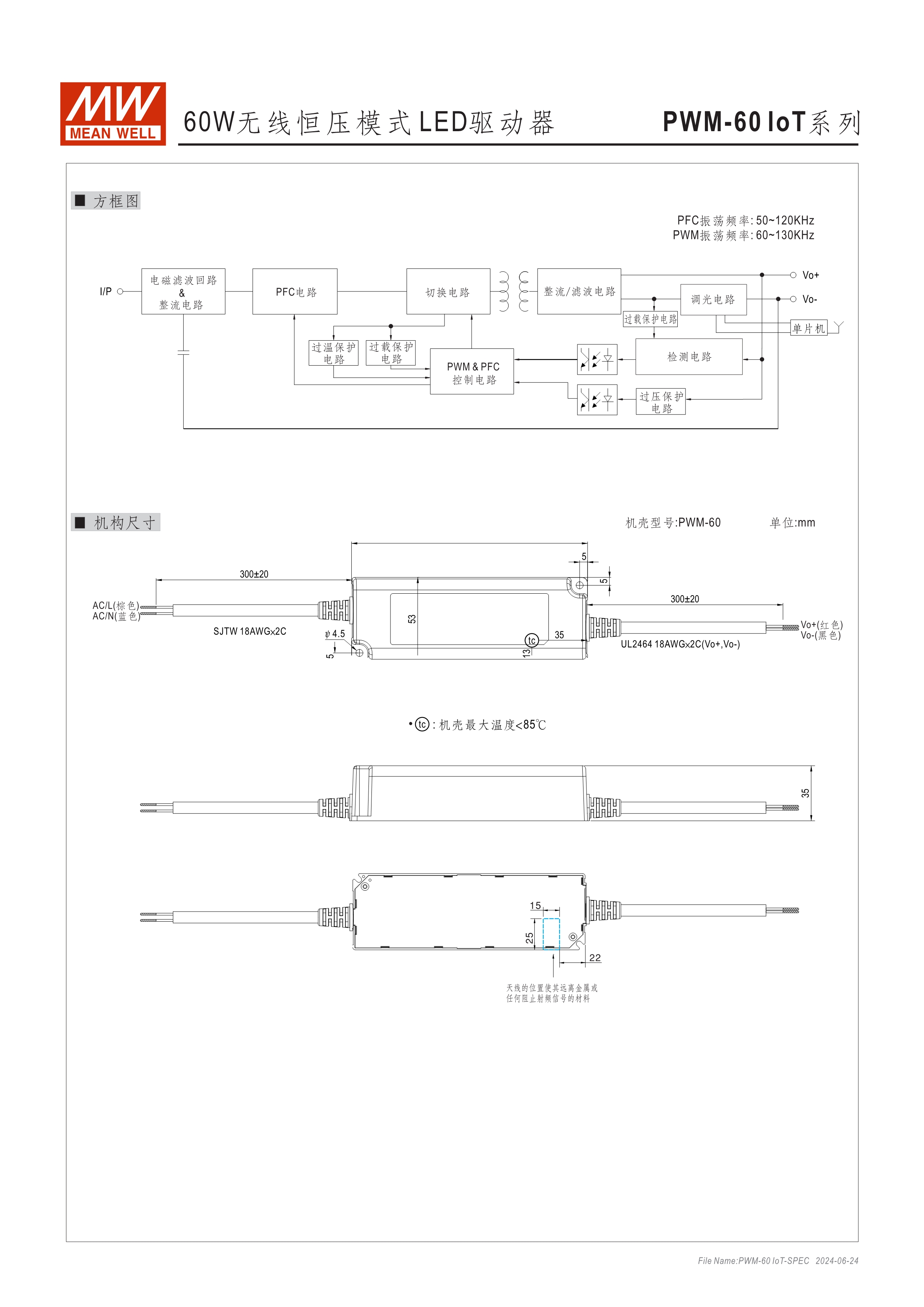 恒壓輸出模式多種可選 (PWM系列) 無頻閃設計 塑料外殼及符合Class II無地線設計 主動式PFC設計 雷擊保護耐壓設計2KV(L-N) 保護功能:短路、過電壓、過溫度
