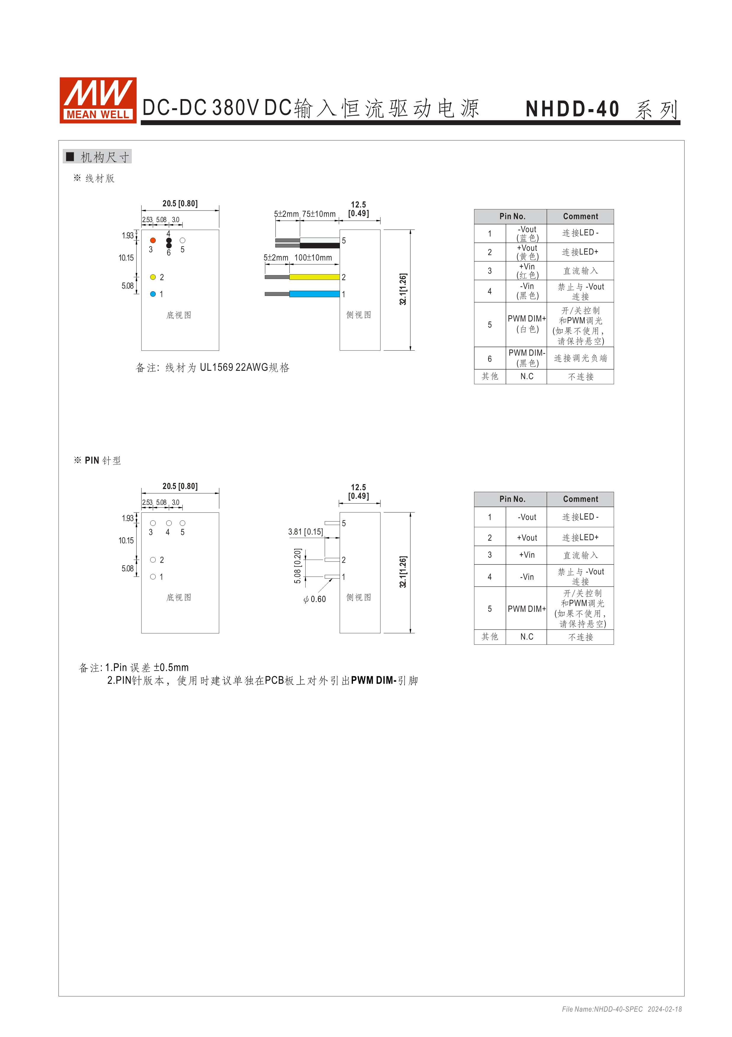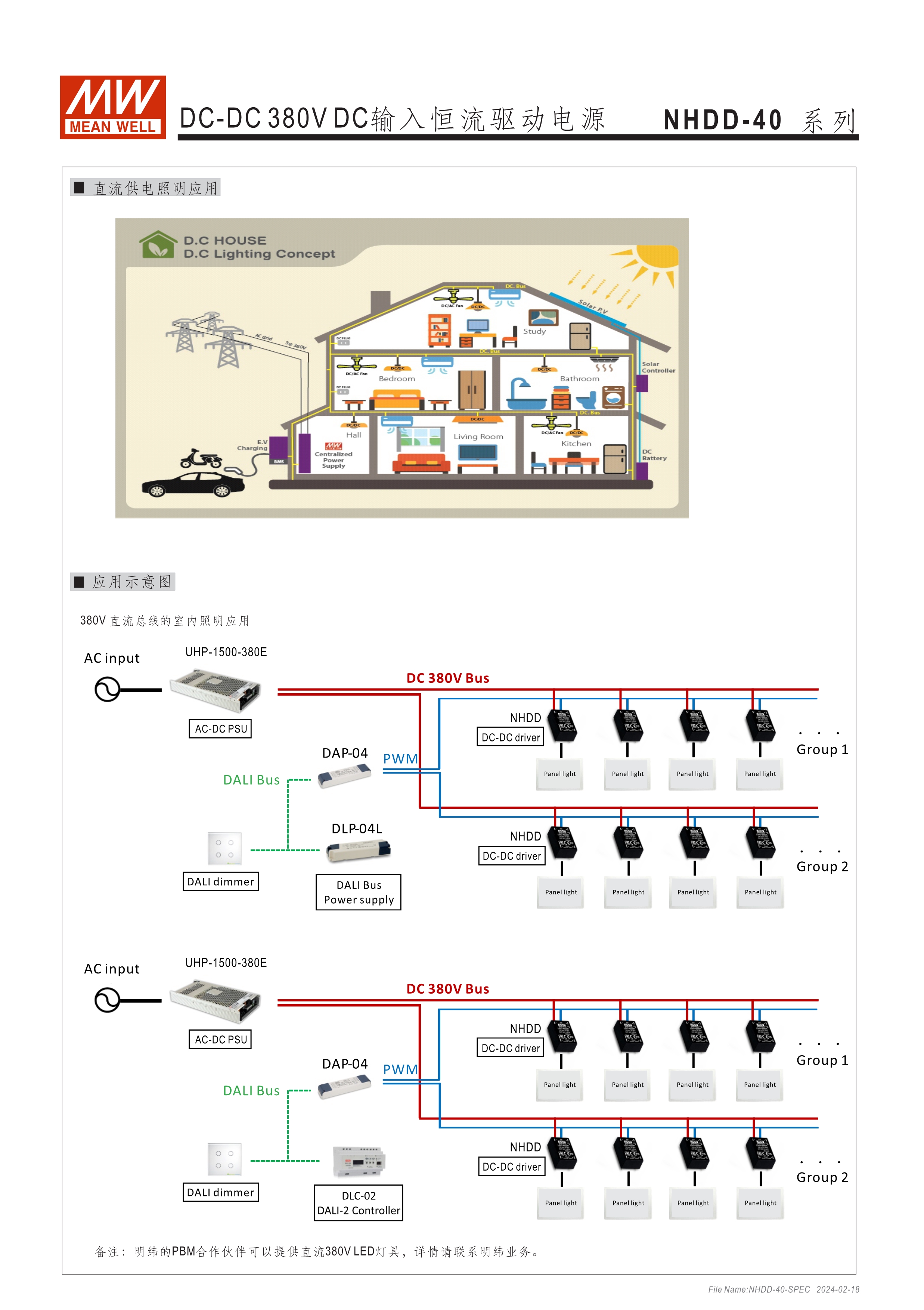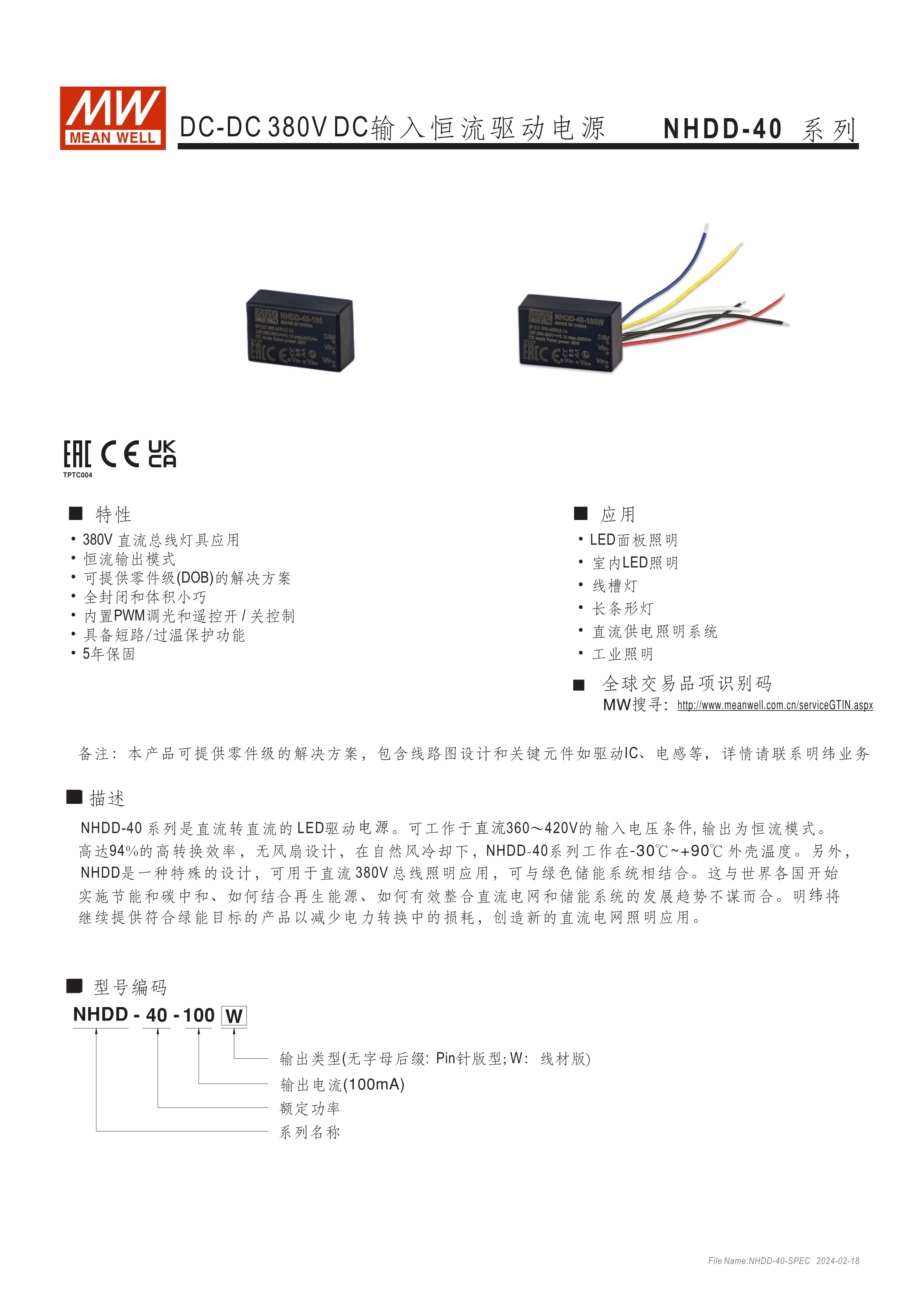 恒流模式輸出 為DC 380V BUS照明燈具提供電路板型(DoB)解決方案 塑料外殼和全封裝 內(nèi)建PWM和遠程開關(guān)控制 保護:短路/過溫 5年保固