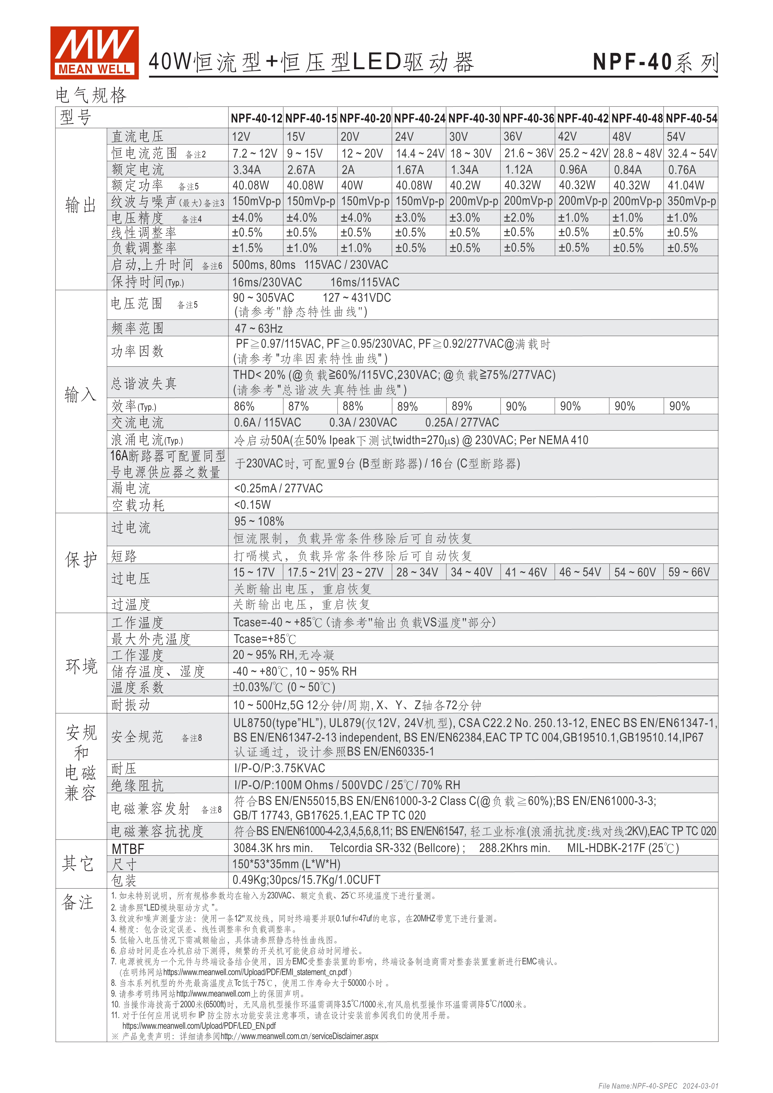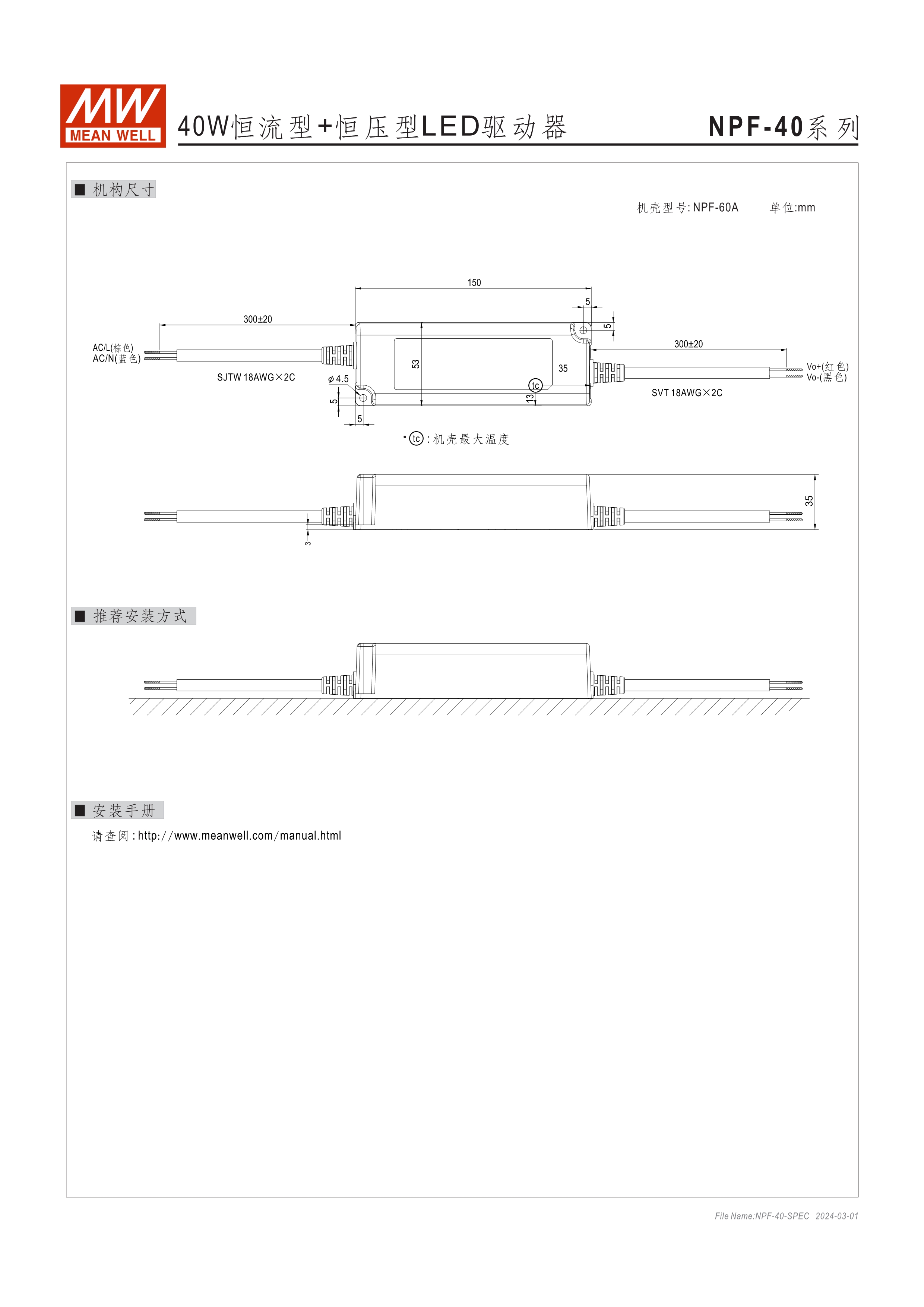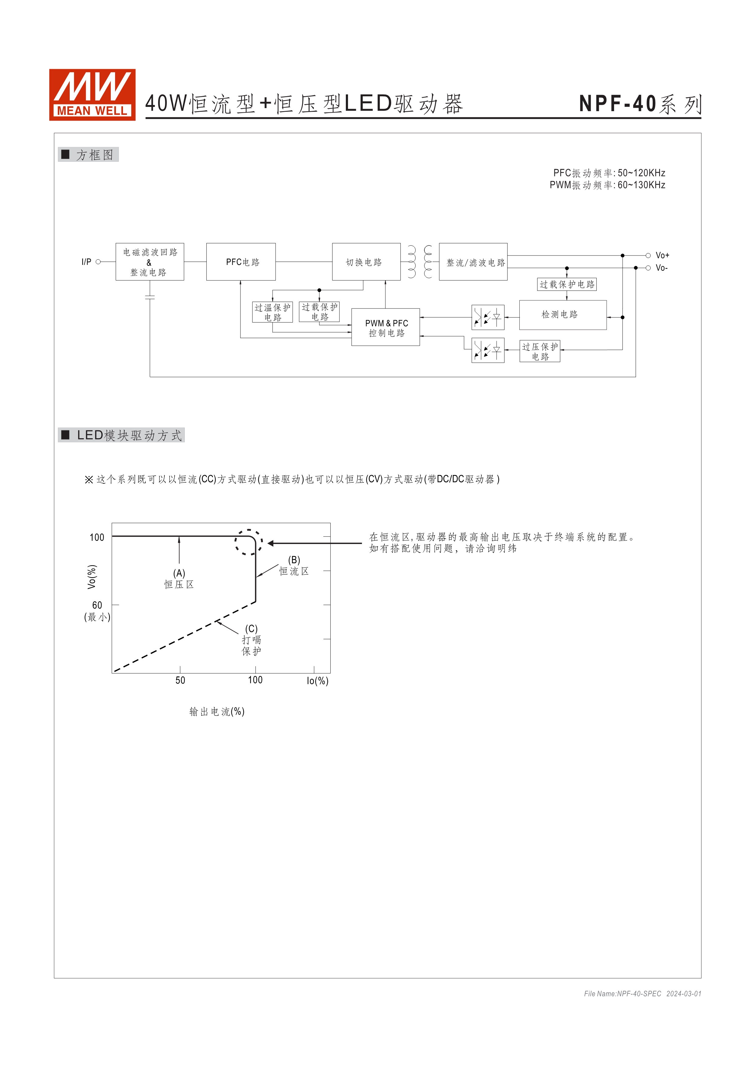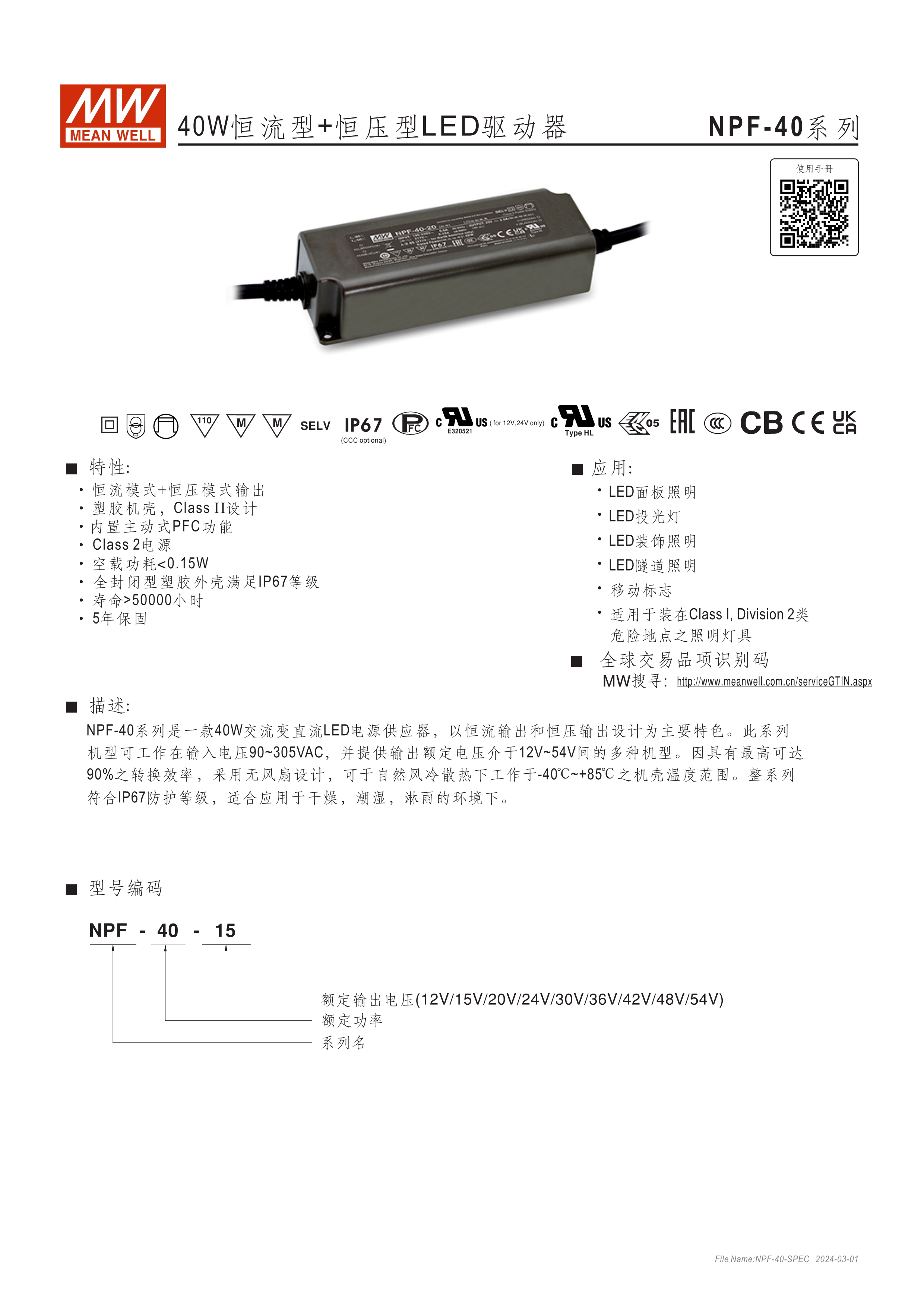 90~305VAC交流輸入, 內(nèi)建主動(dòng)式功率因子矯正功能(active PFC) 塑料外殼,IP67防護(hù)等級(jí) Class II設(shè)計(jì),無(wú)FG 空載/待機(jī)消耗瓦數(shù)<0.15W(D type機(jī)種為<0.5W) D type機(jī)種內(nèi)建三合一調(diào)光功能(0~10VDC, PWM信號(hào)或電阻,可關(guān)斷) Type "HL" LED電源適用在安裝于Class I, Division 2 類(lèi) 危險(xiǎn)地點(diǎn)之照明燈具[NPF-40(D)/-60(D)/-120(D)] 適合于LED照明及LED電子廣告牌相關(guān)應(yīng)用 5年保固期
