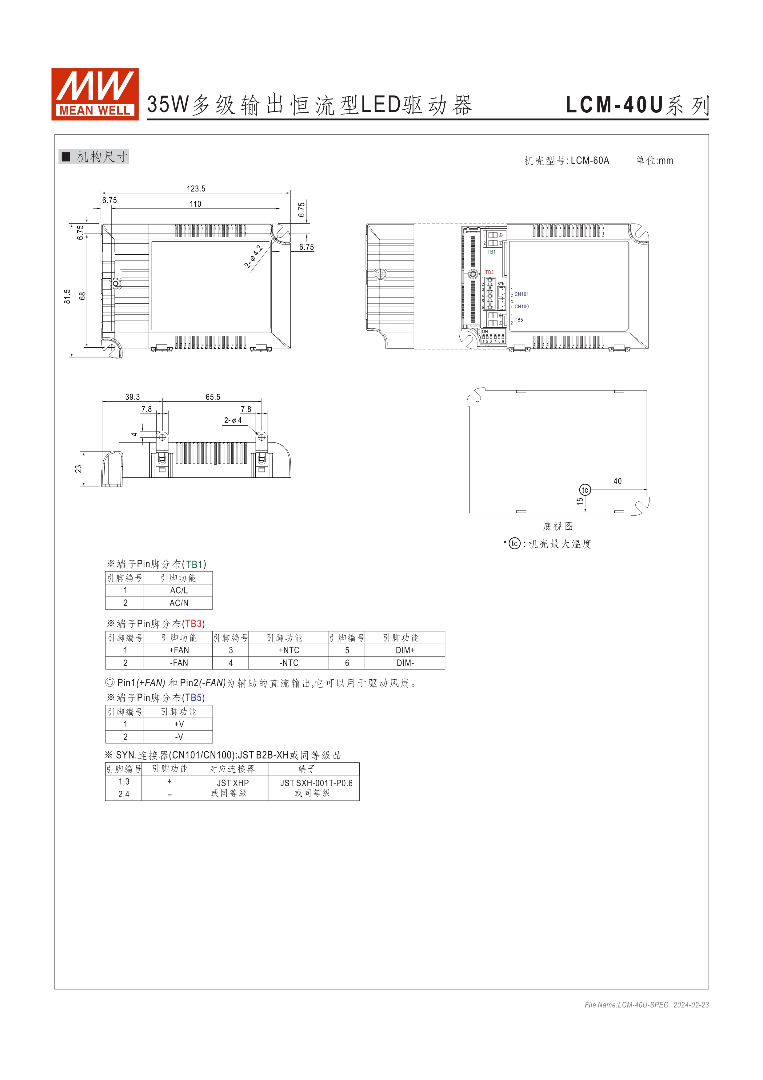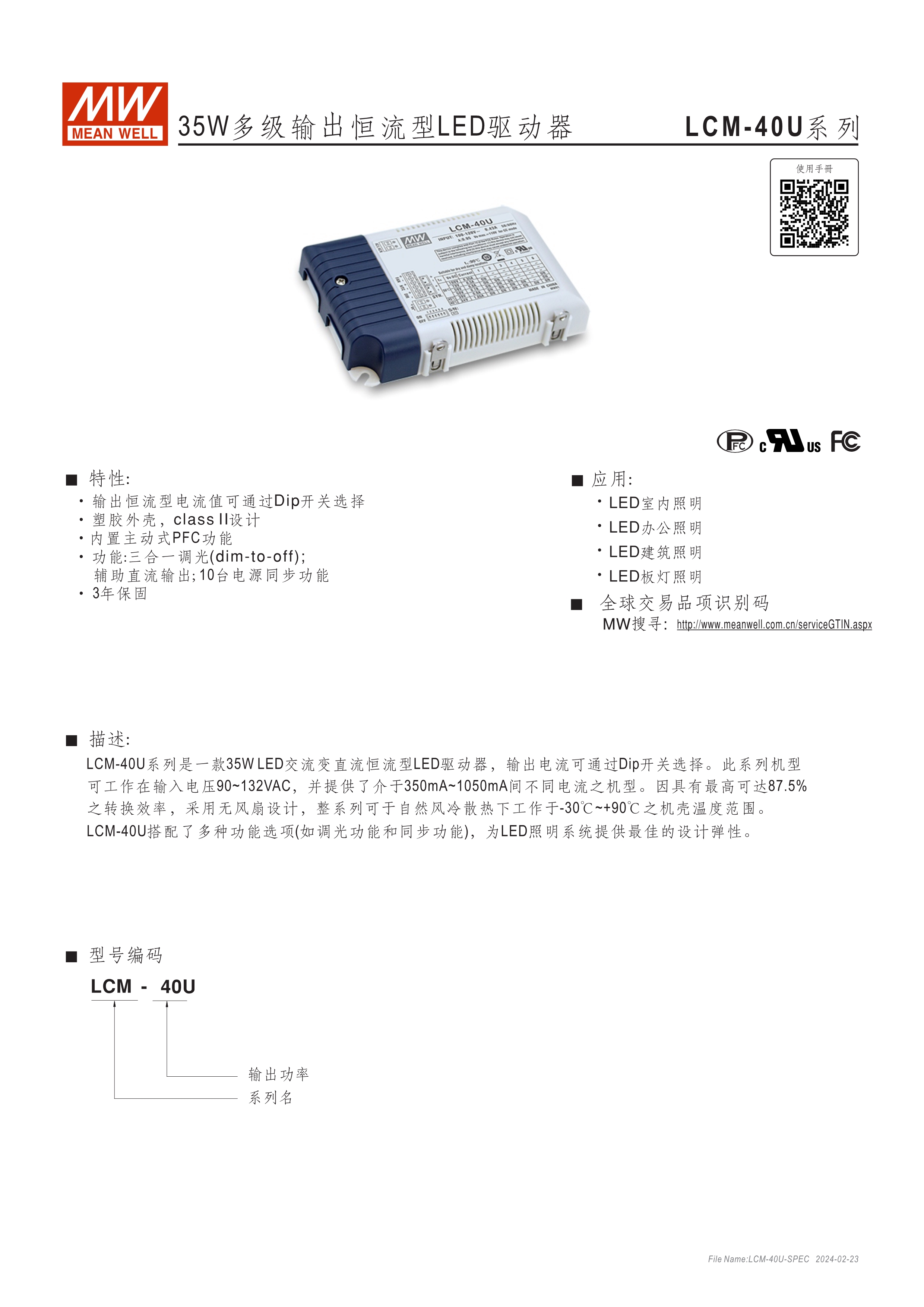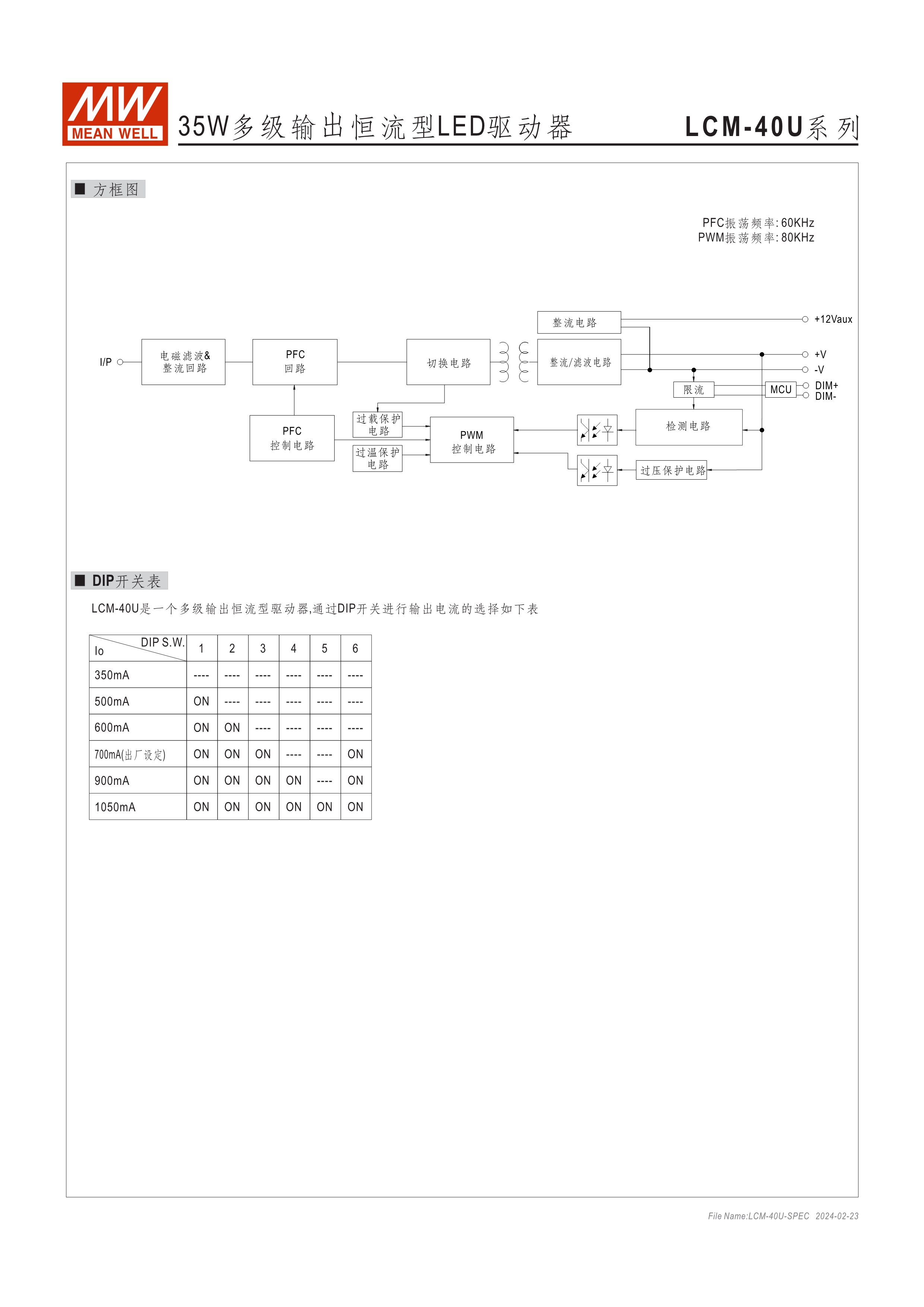 LCM-40U(DA)/60U(DA):90~132VAC交流輸入 內(nèi)建主動(dòng)式功率因子矯正功能(active PFC) 塑料外殼 可透過指撥開關(guān)切換不同輸出電流檔位之多段式電源 LCM-40U/60U內(nèi)建三合一調(diào)光功能(0~10VDC, PWM信號(hào)或電阻,可關(guān)斷) LCM-40UDA/60UDA內(nèi)建DALI接口 和按鈕調(diào)光功能(Push Dim) 適合于LED室內(nèi)照明相關(guān)應(yīng)用