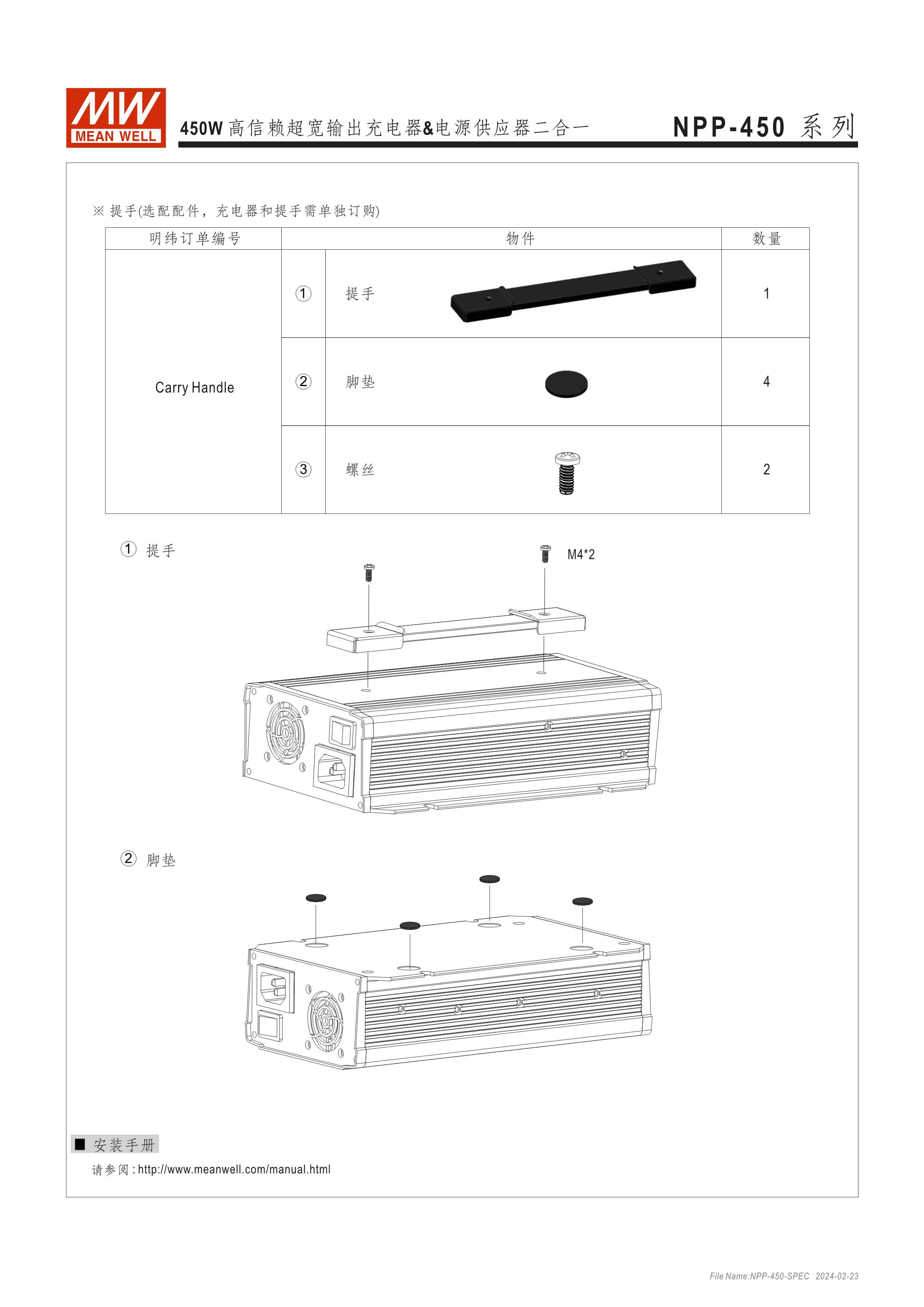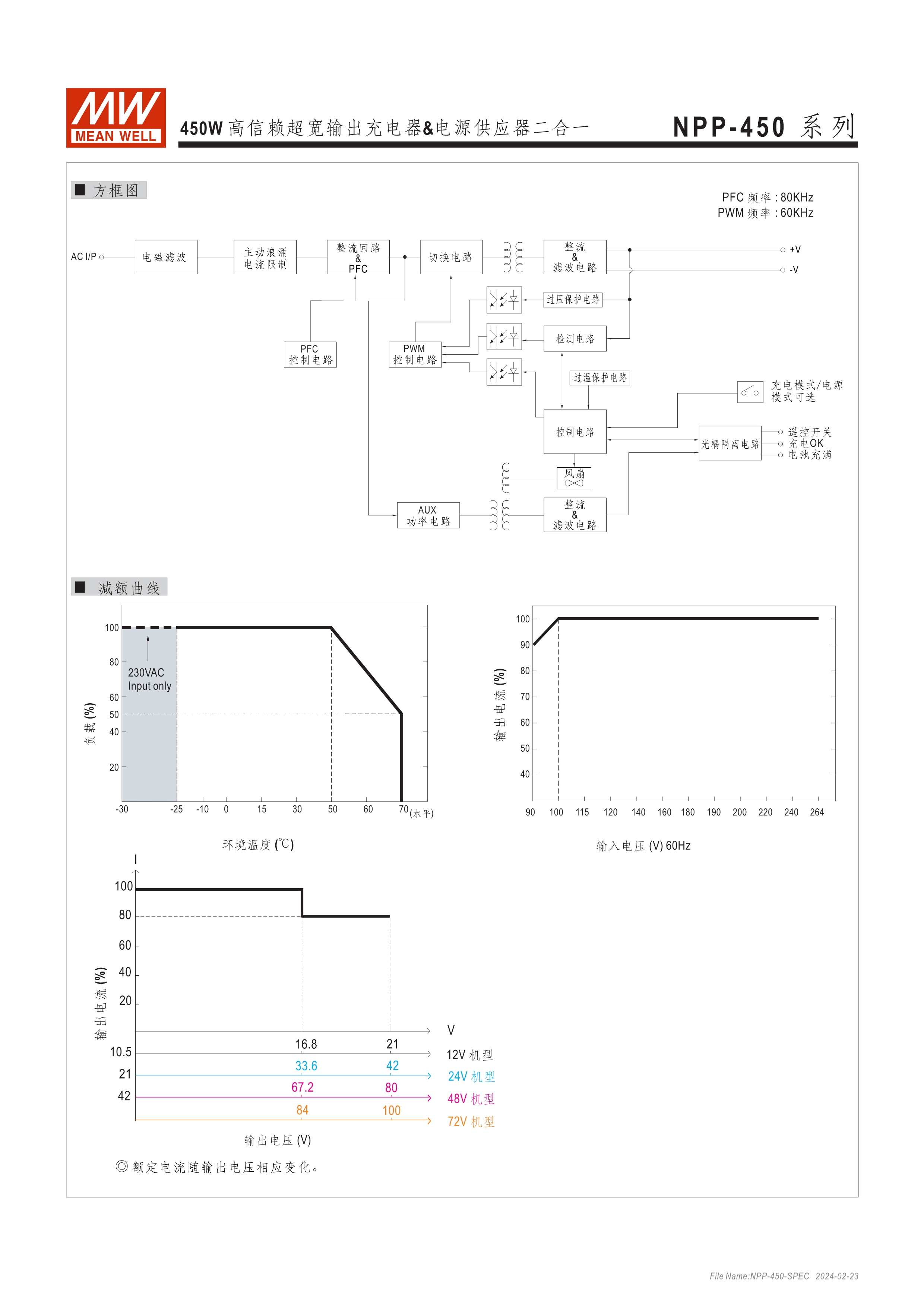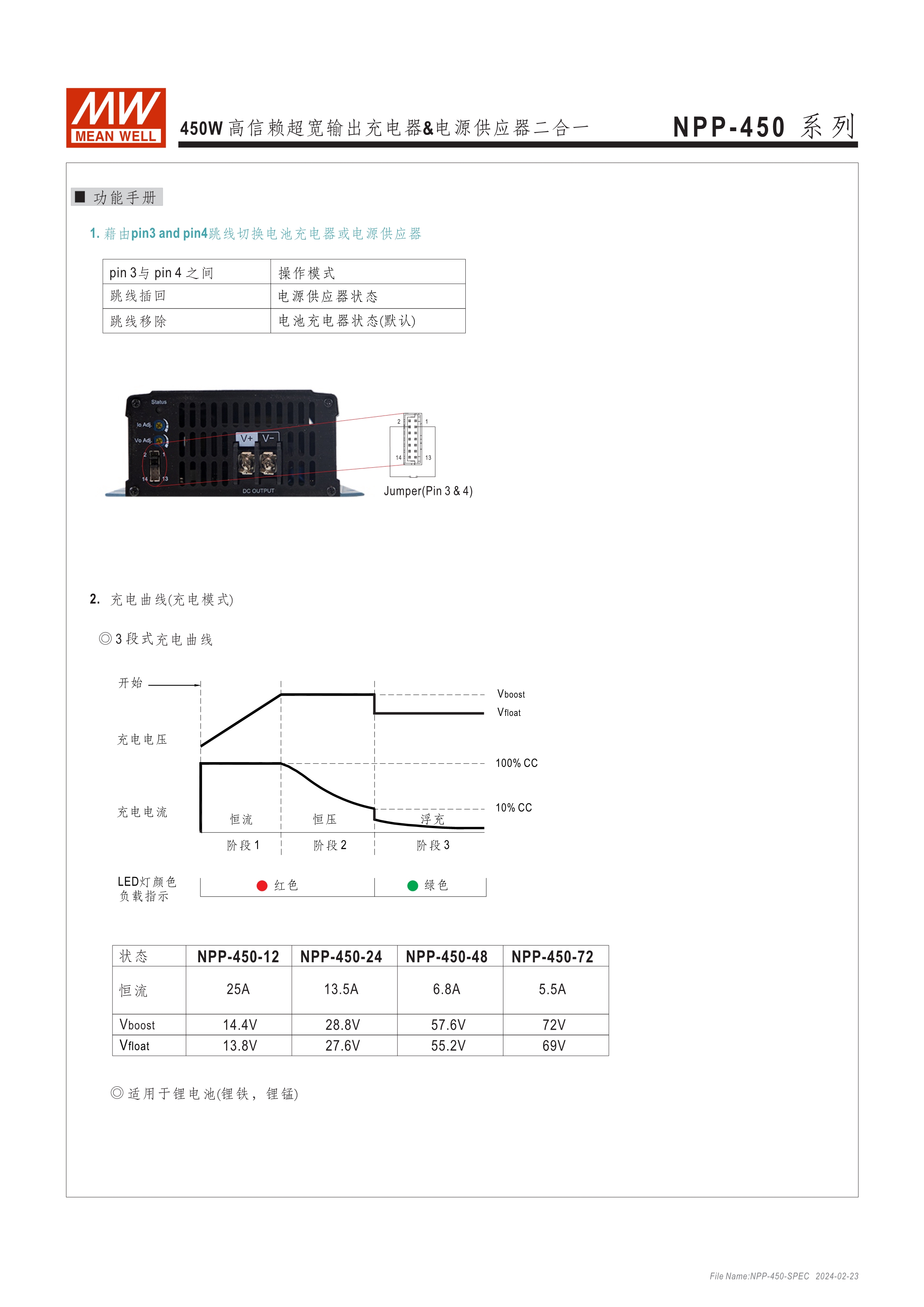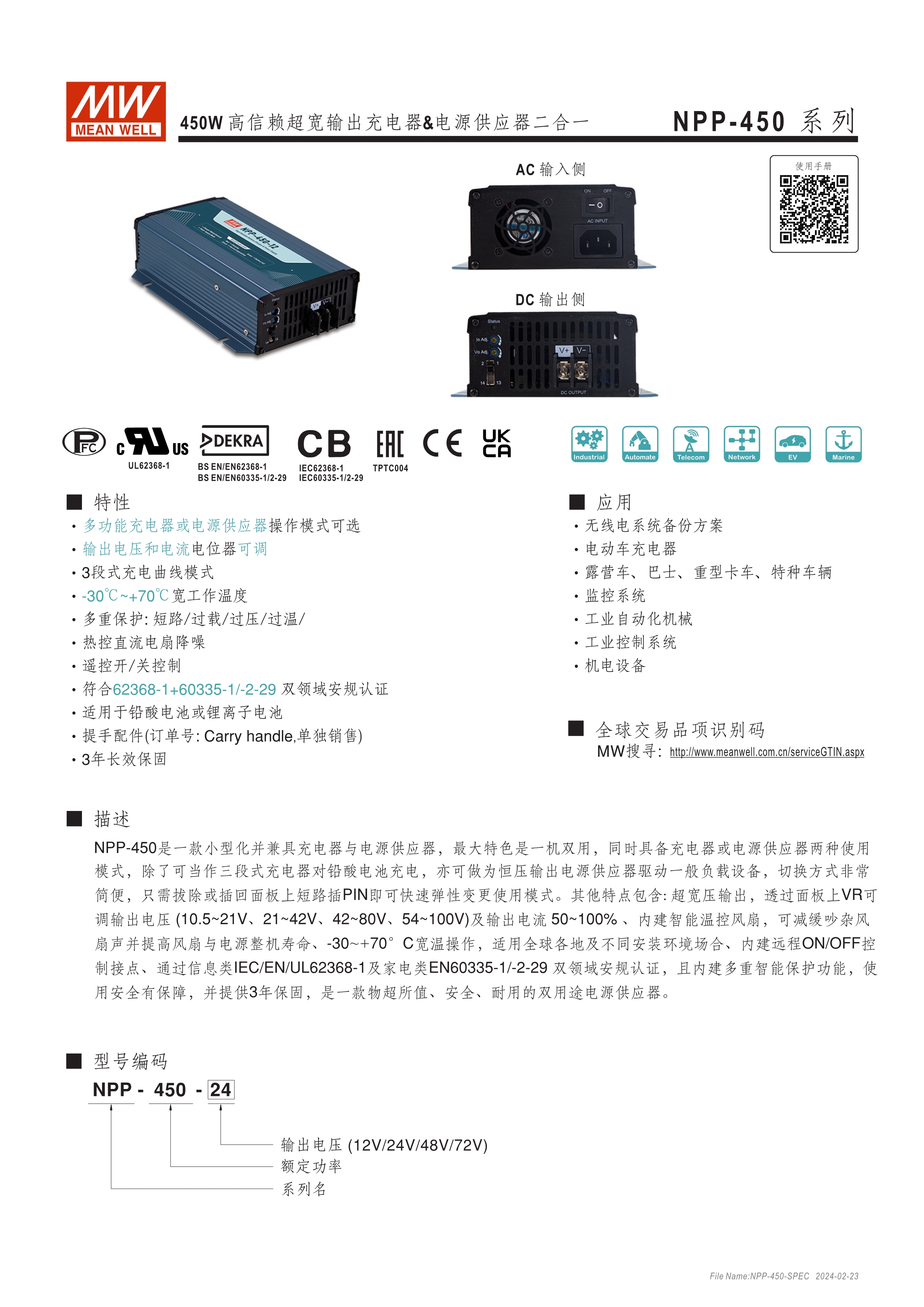 可彈性切換充電器或電源供應(yīng)器 3段式充電,僅適用鉛酸電池 可調(diào)輸出電壓 [由面板VR可調(diào)整10.5~21V, 21~42V, 42~80V, 54~100V(僅NPB-450)] 可調(diào)輸出電流 (由面板VR調(diào)整50~100%) -30~+70oC寬溫度,使用環(huán)境受限少 保護(hù)功能:短路、過(guò)壓、過(guò)溫度 可另購(gòu)手提把手 (Order No.: Carry Handle) 通過(guò)UL/EN62368-1、IEC/EN62368-1/-2-29雙安規(guī)認(rèn)證 3年保固