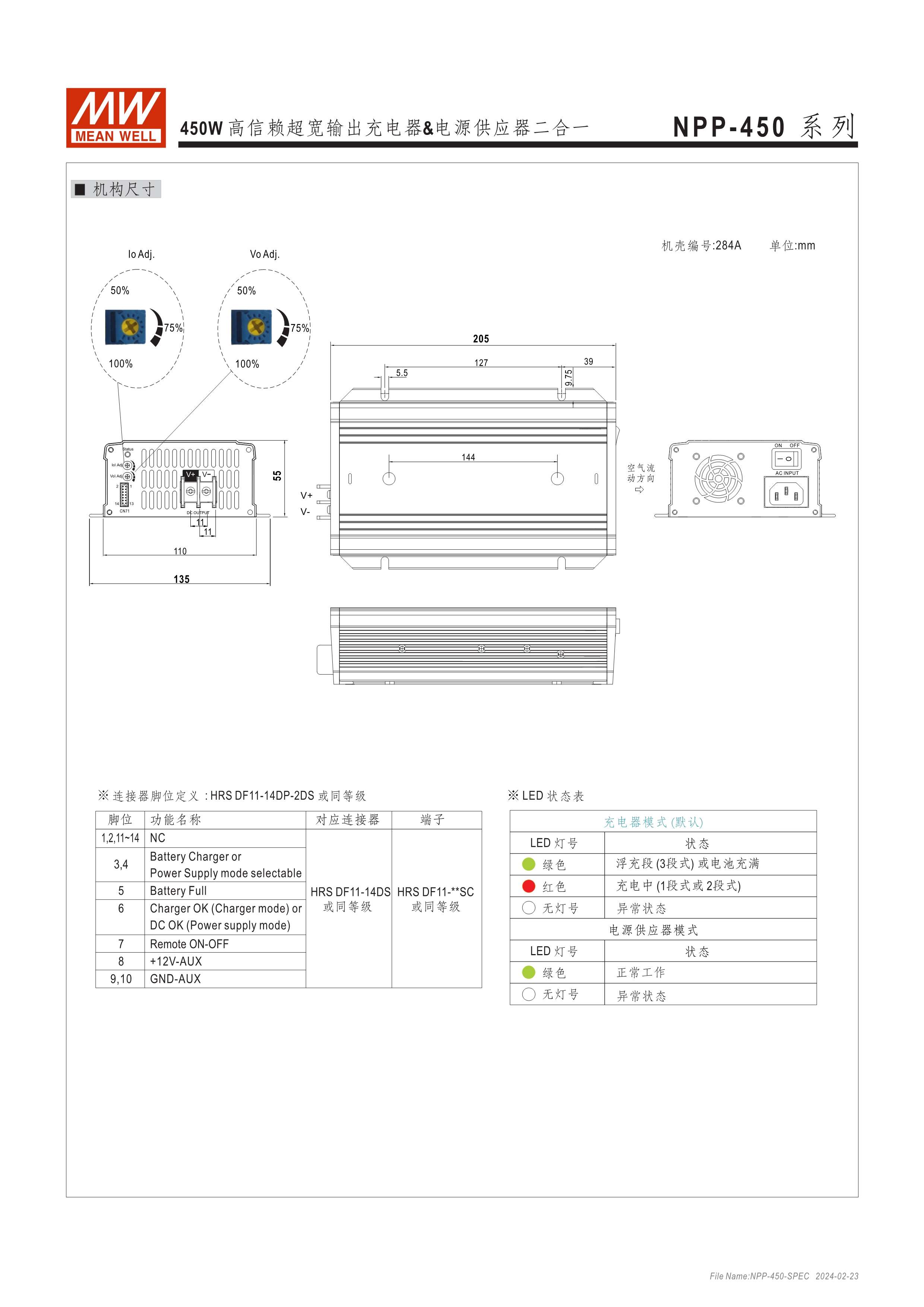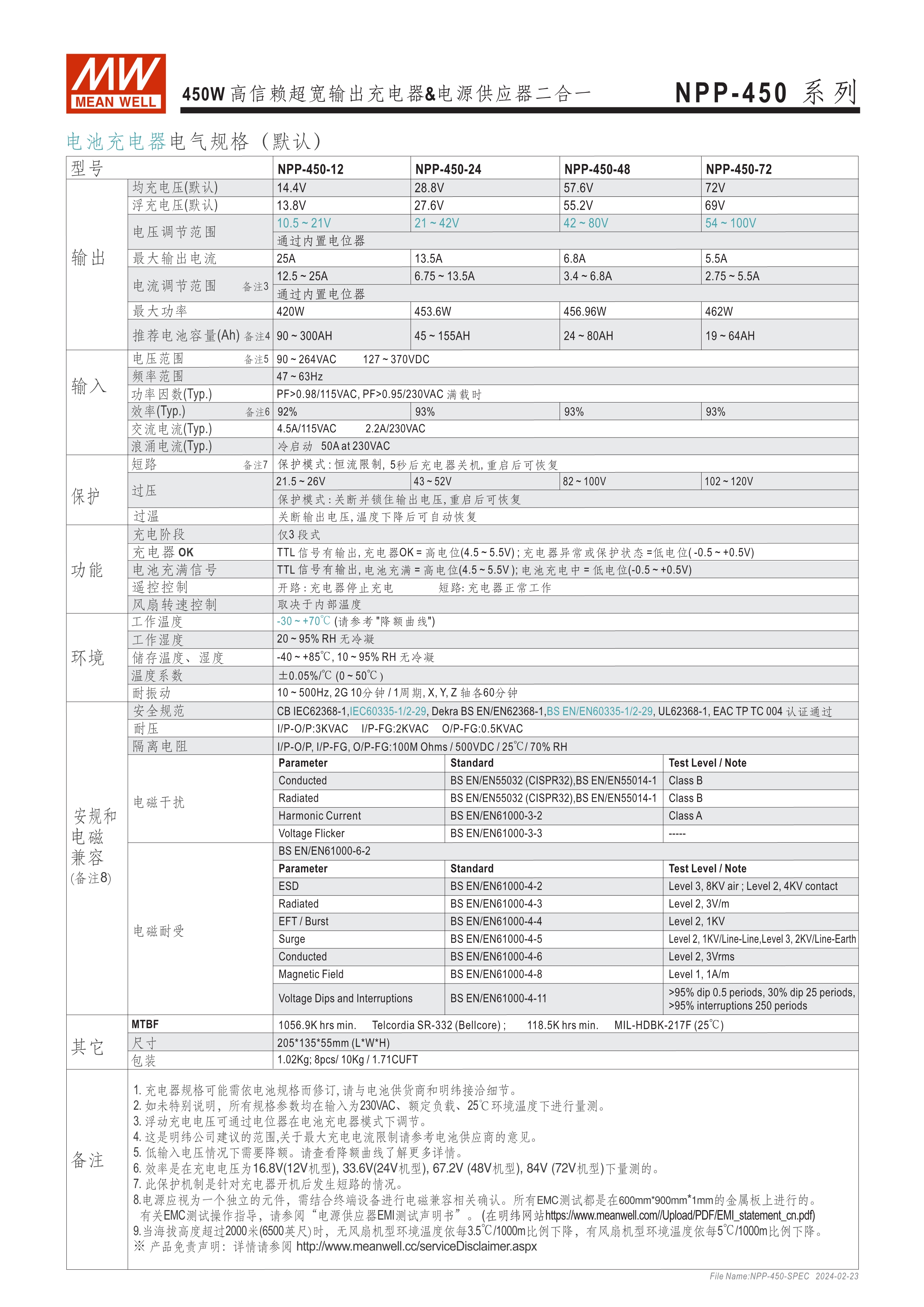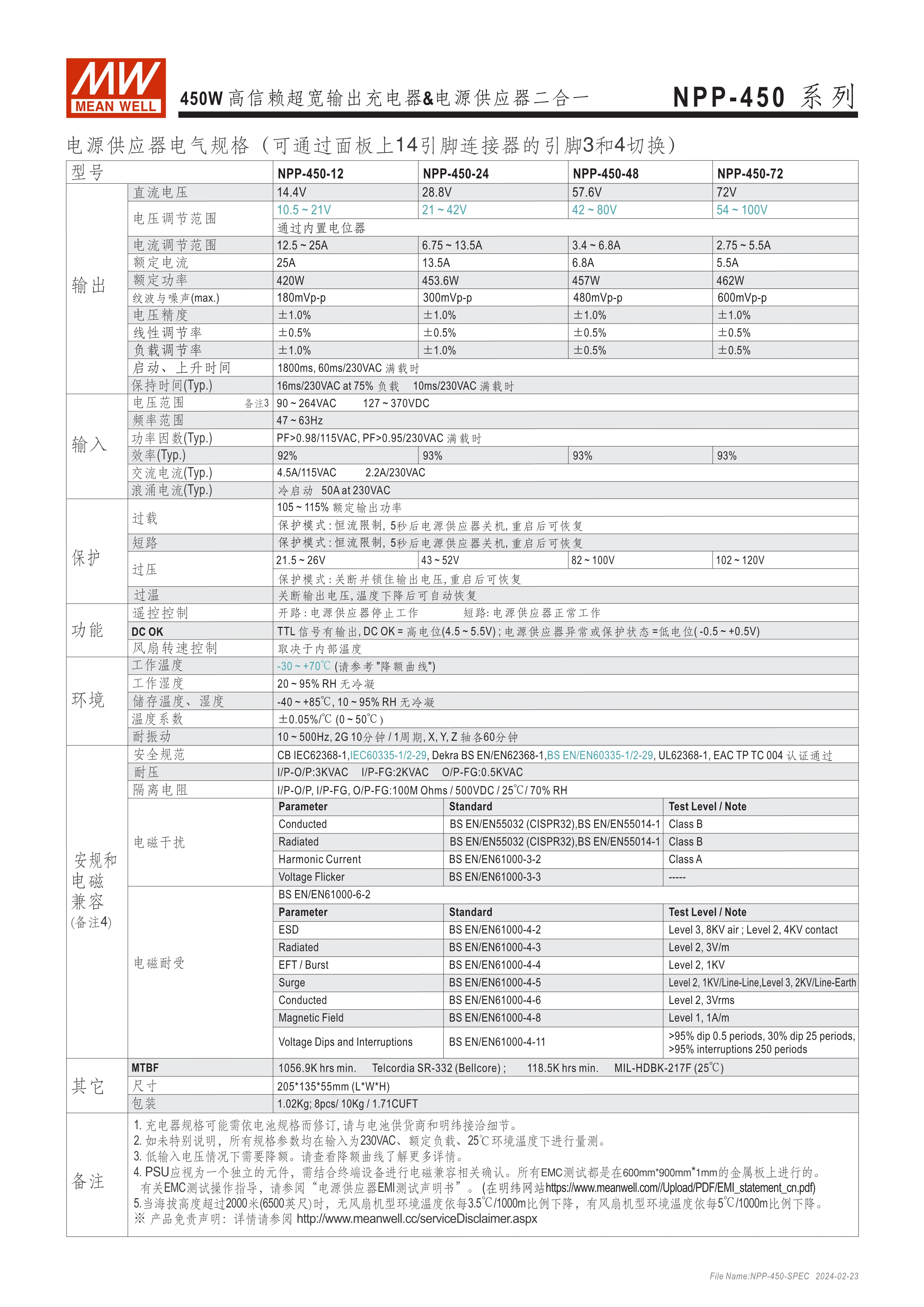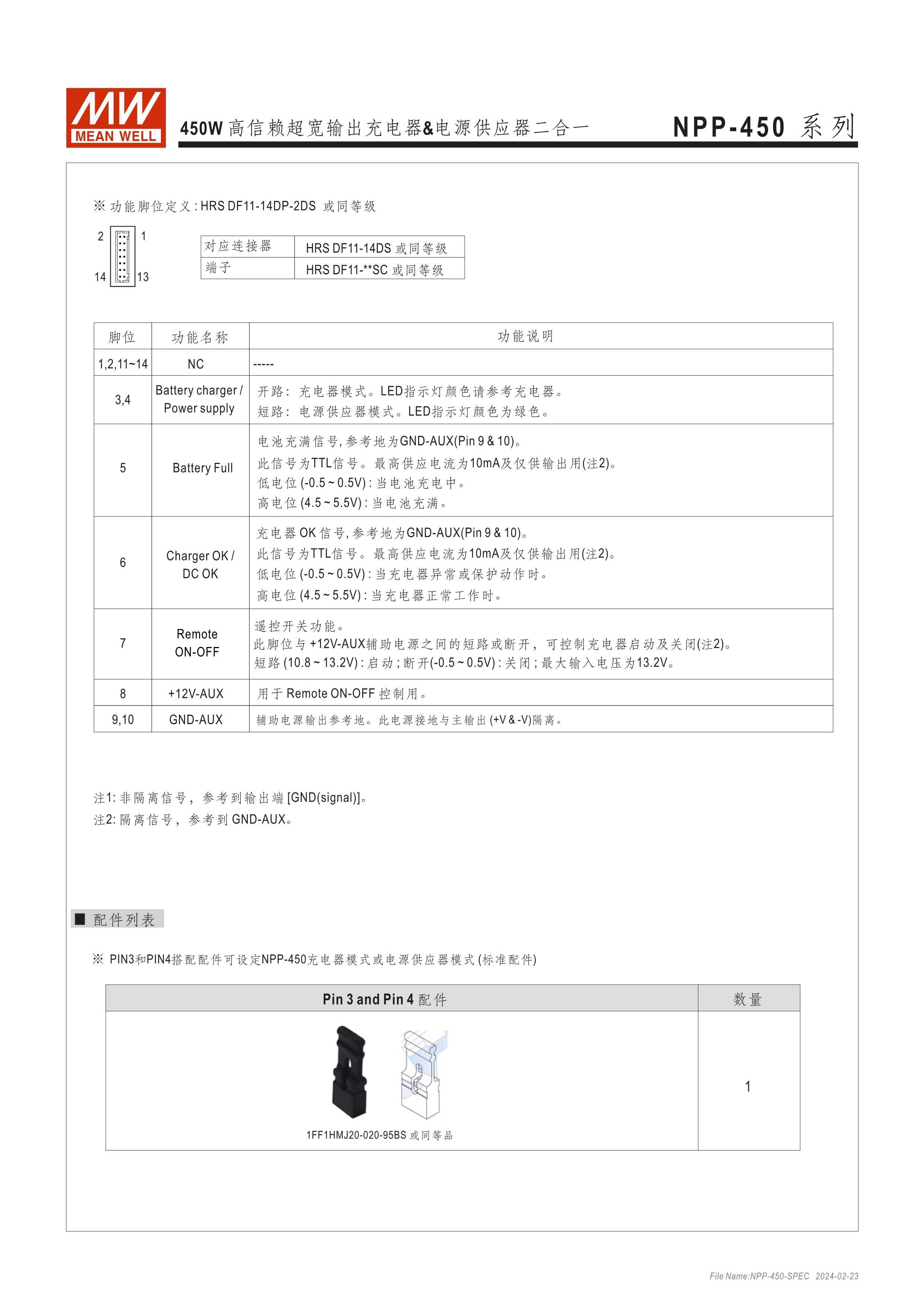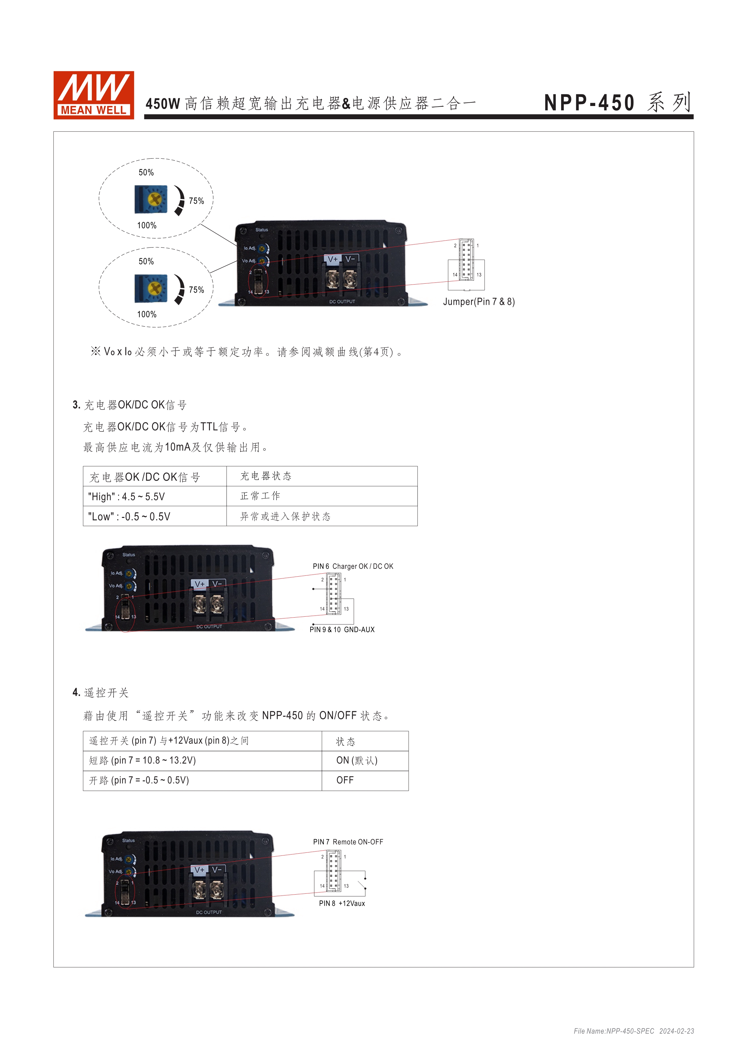 可彈性切換充電器或電源供應(yīng)器 3段式充電,僅適用鉛酸電池 可調(diào)輸出電壓 [由面板VR可調(diào)整10.5~21V, 21~42V, 42~80V, 54~100V(僅NPB-450)] 可調(diào)輸出電流 (由面板VR調(diào)整50~100%) -30~+70oC寬溫度,使用環(huán)境受限少 保護(hù)功能:短路、過(guò)壓、過(guò)溫度 可另購(gòu)手提把手 (Order No.: Carry Handle) 通過(guò)UL/EN62368-1、IEC/EN62368-1/-2-29雙安規(guī)認(rèn)證 3年保固