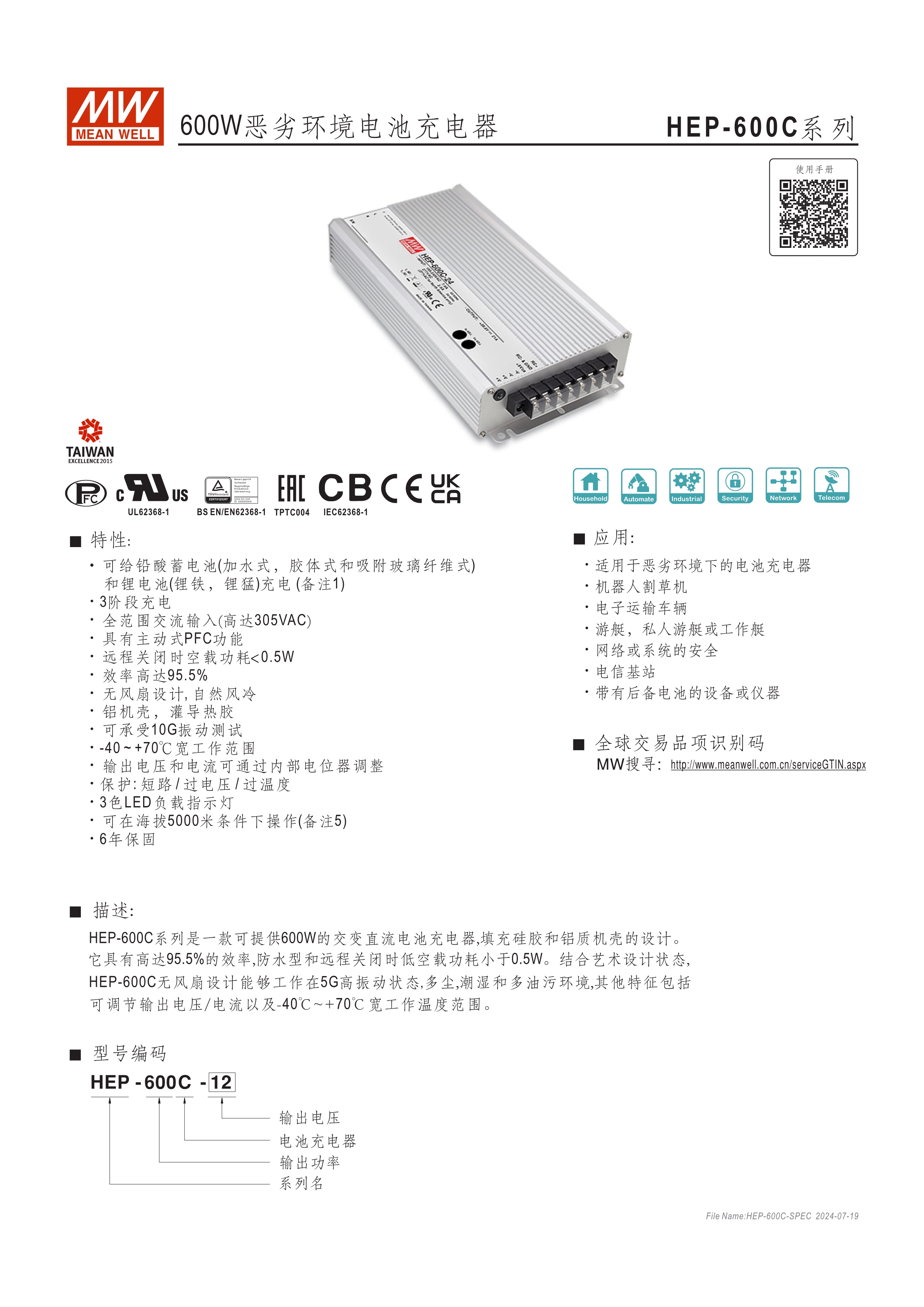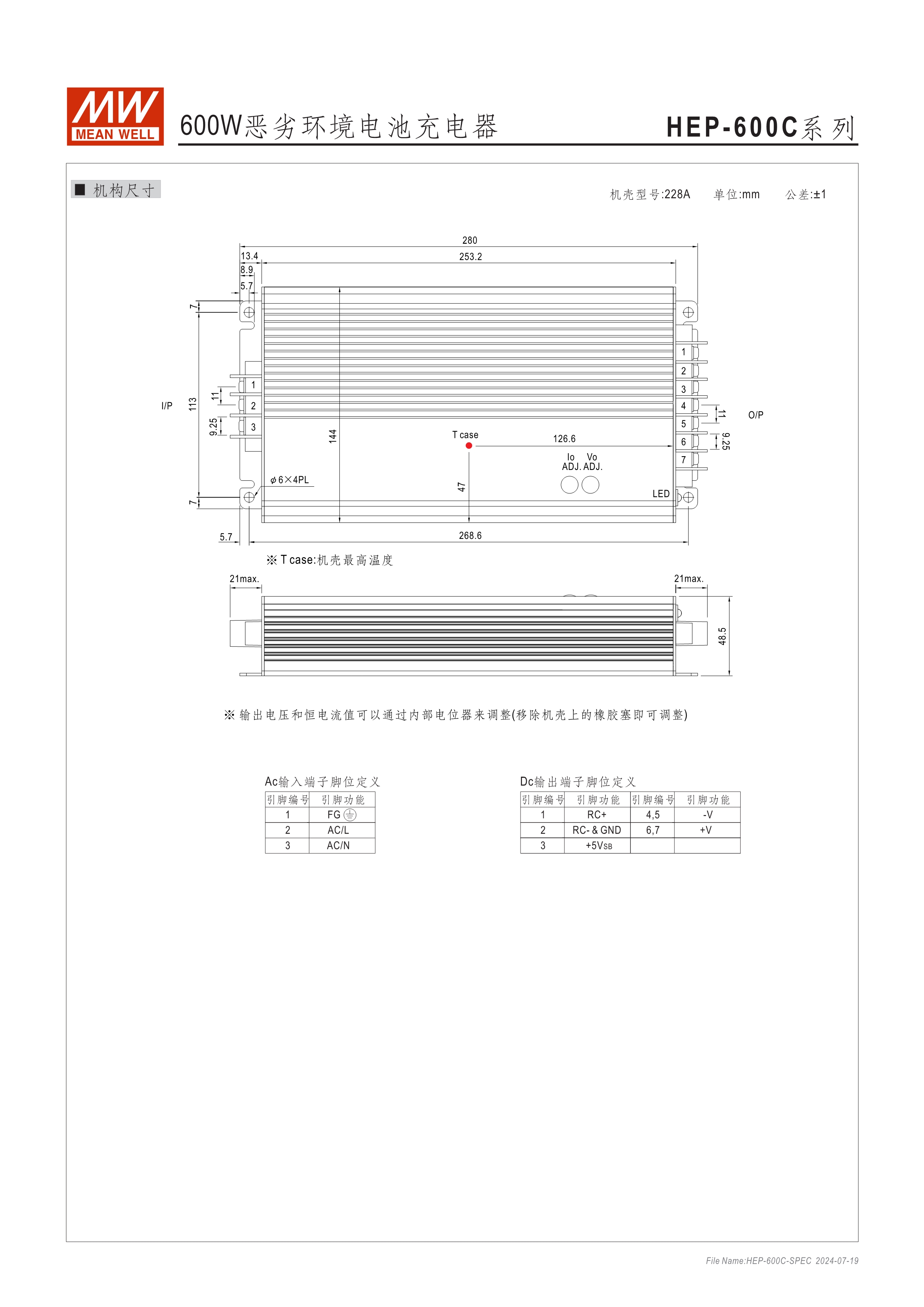 鋁殼、無風扇、內灌導熱膠 -40~+70oC超寬溫操作溫度 耐震10G 可使用於5000M高海拔 可透過VR調整充電電壓 (11.5~15.1V, 23~30.2V, 46.1~60.5V) 可透過VR調整充電電流50~100% 保護功能:短路、過壓、過溫度 6年保固