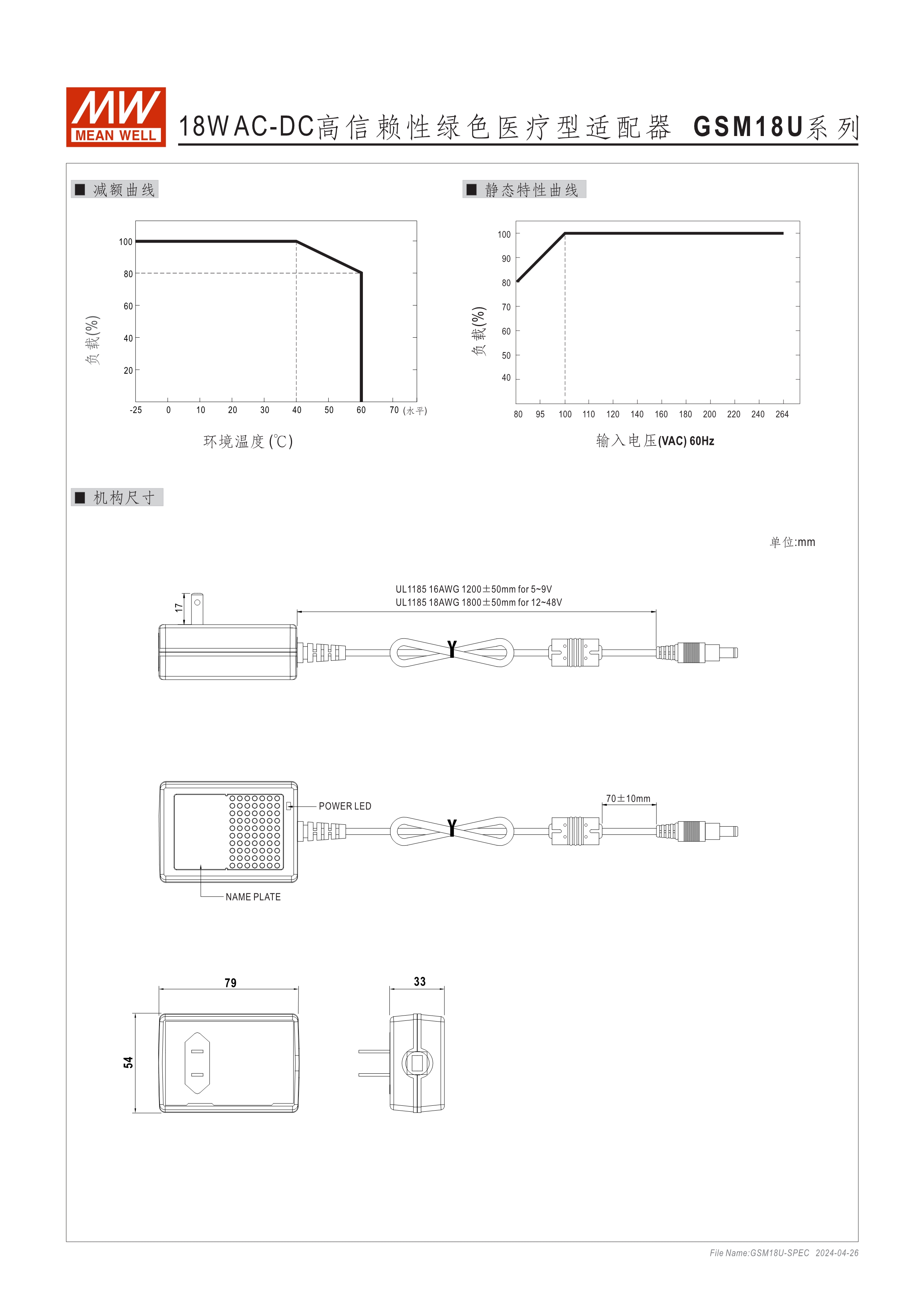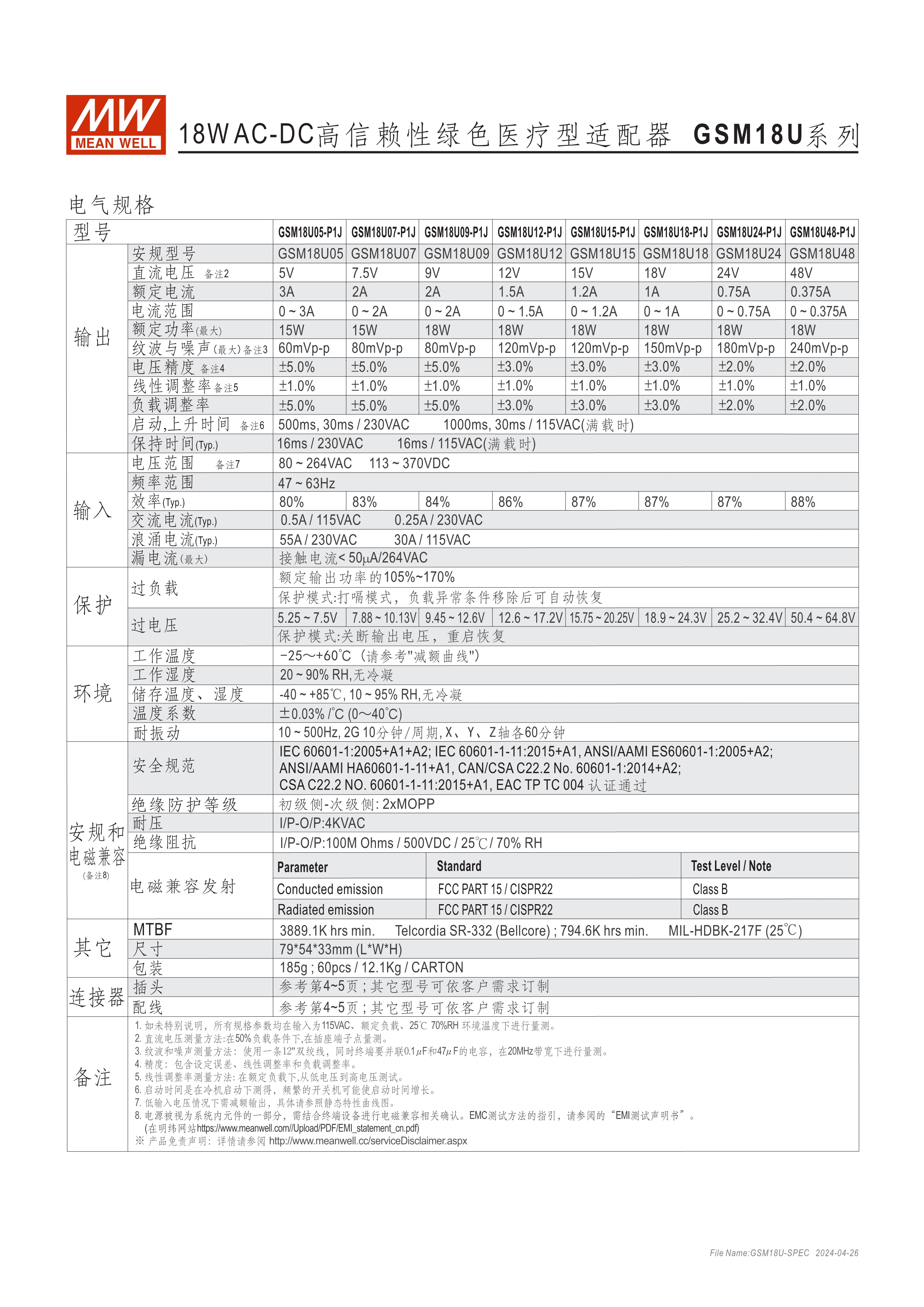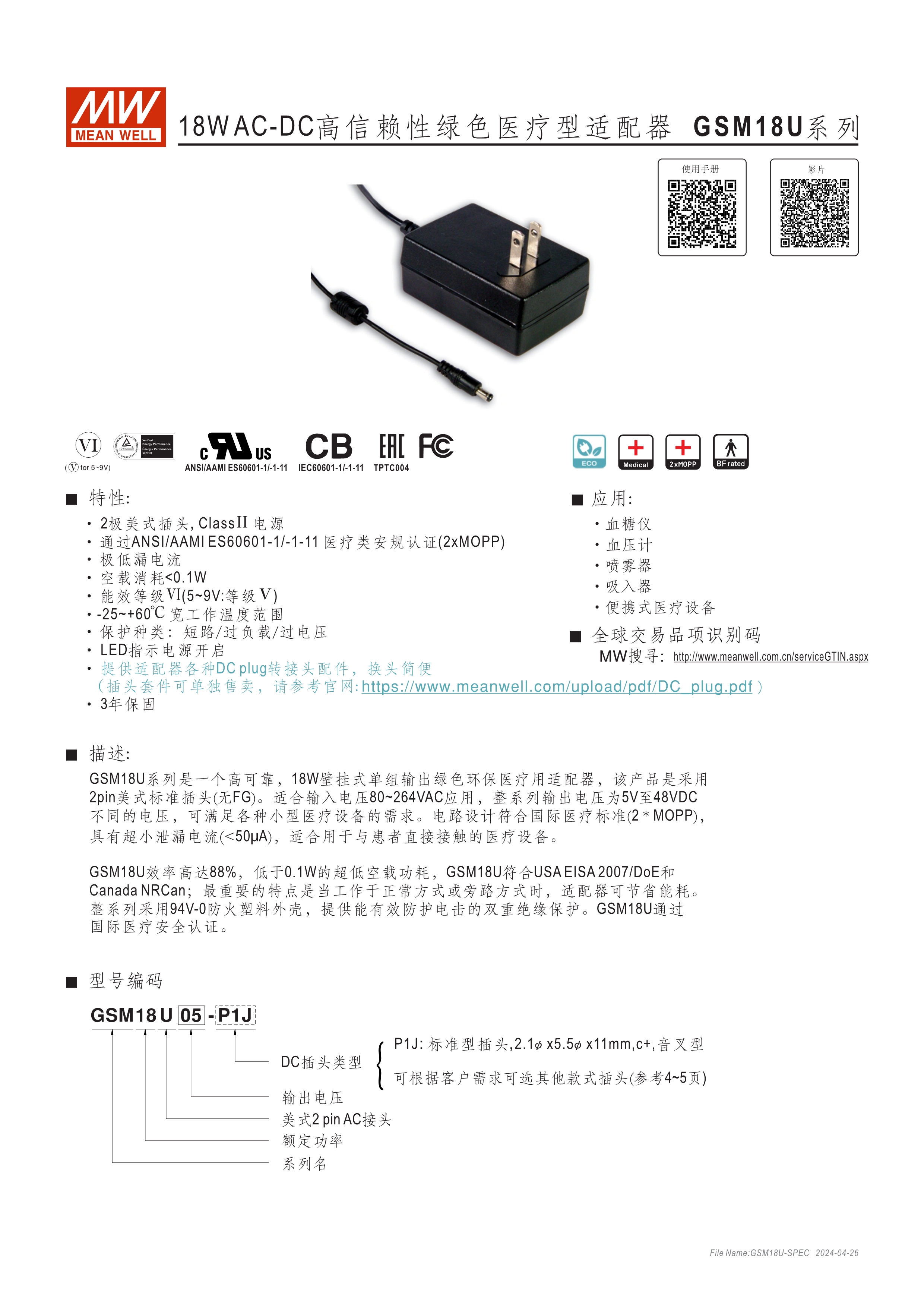通過醫(yī)療60601-1/-11認(rèn)證(2xMOPP),BF 應(yīng)用 80~264Vac輸入 空載損耗<0.075W~0.3W 能效等級(jí)Level VI(GSM06/12和GSM18/25/36 5~9V為Level V) 2極美插(U型)/ 歐插(E型) 極端漏電流<50~100uA(依型號(hào)) 多種DC輸出轉(zhuǎn)接頭可更換 3年保固