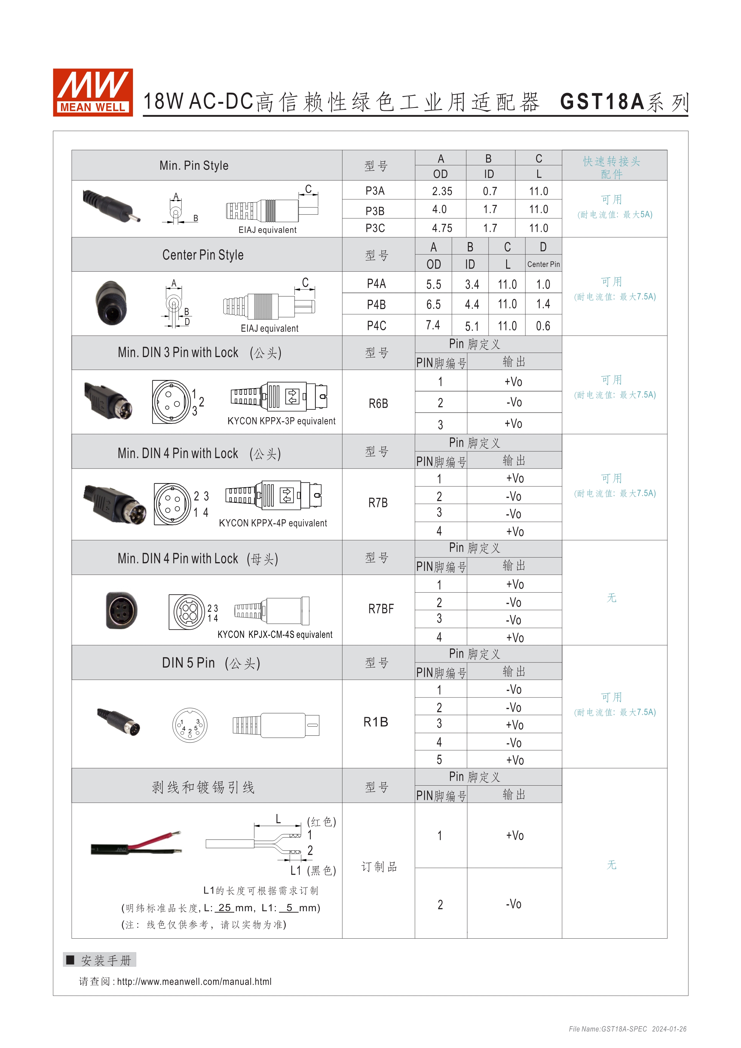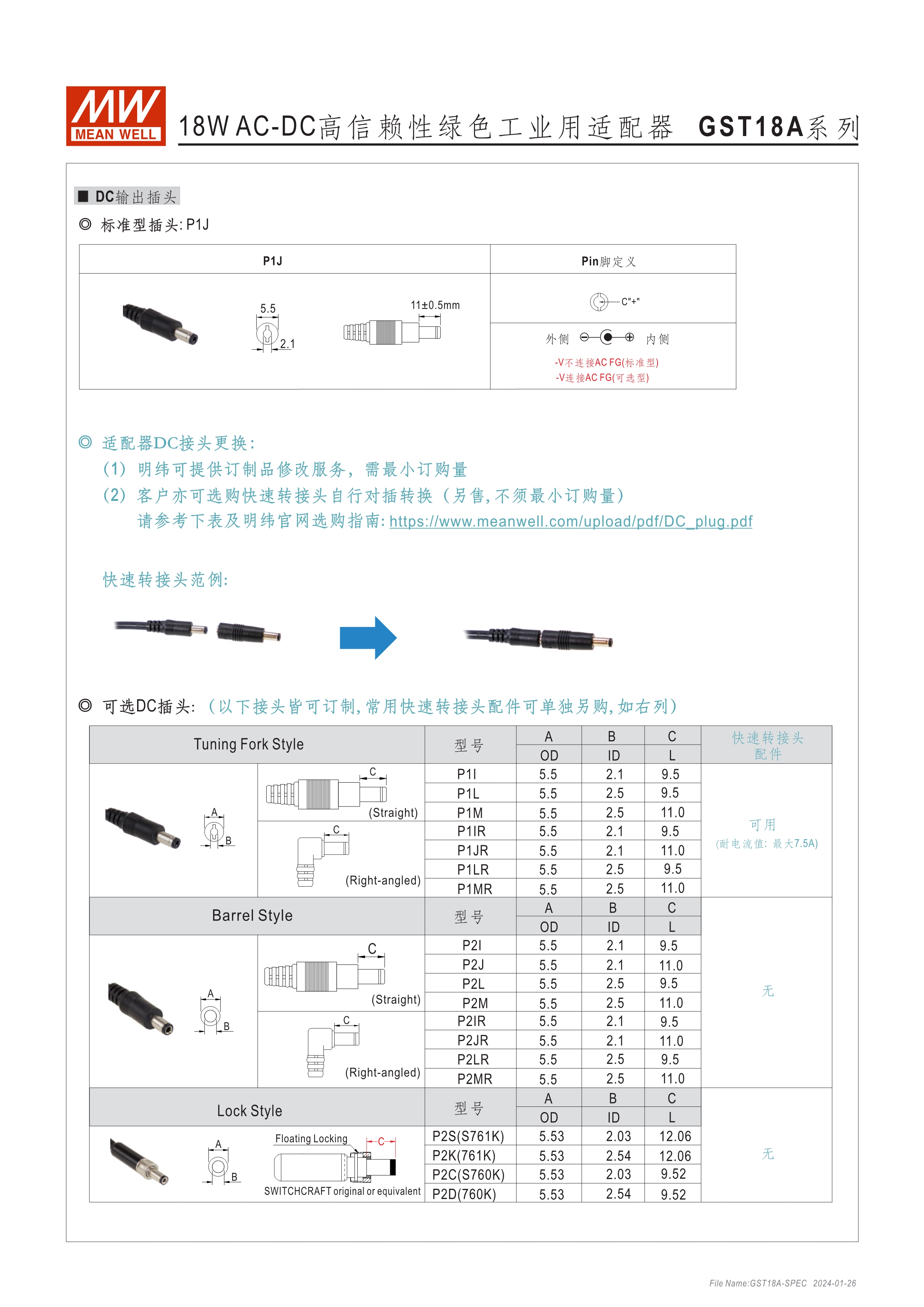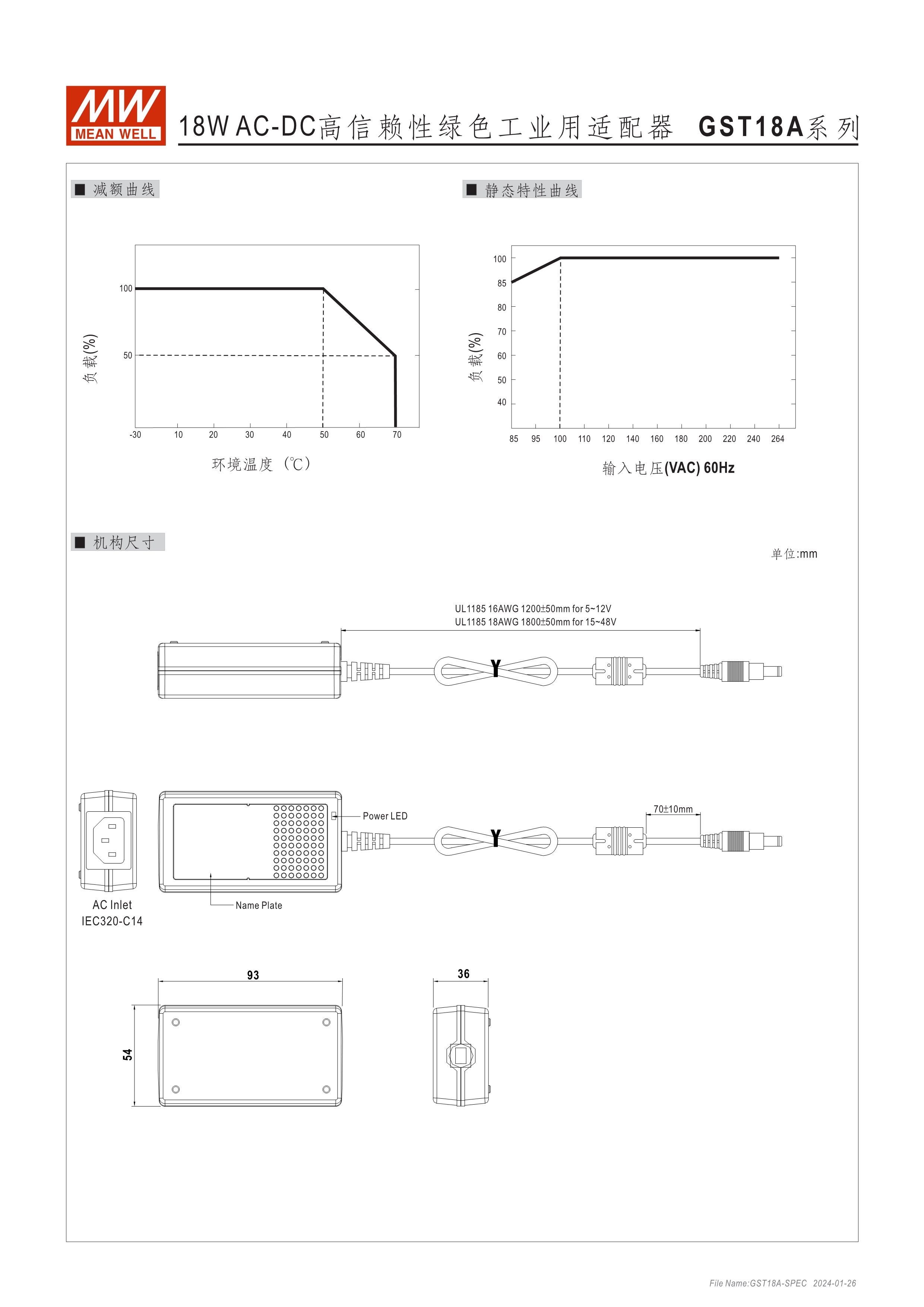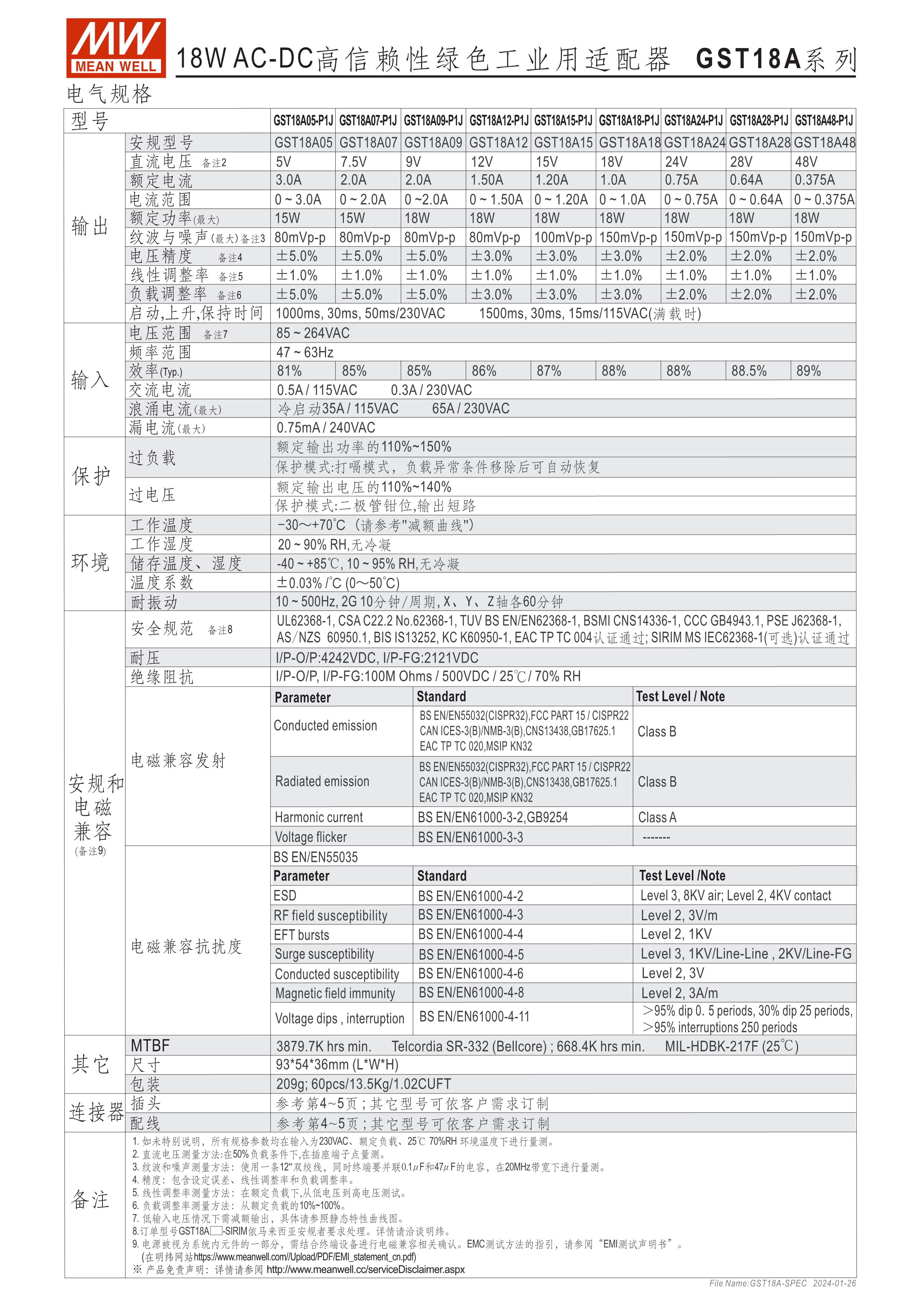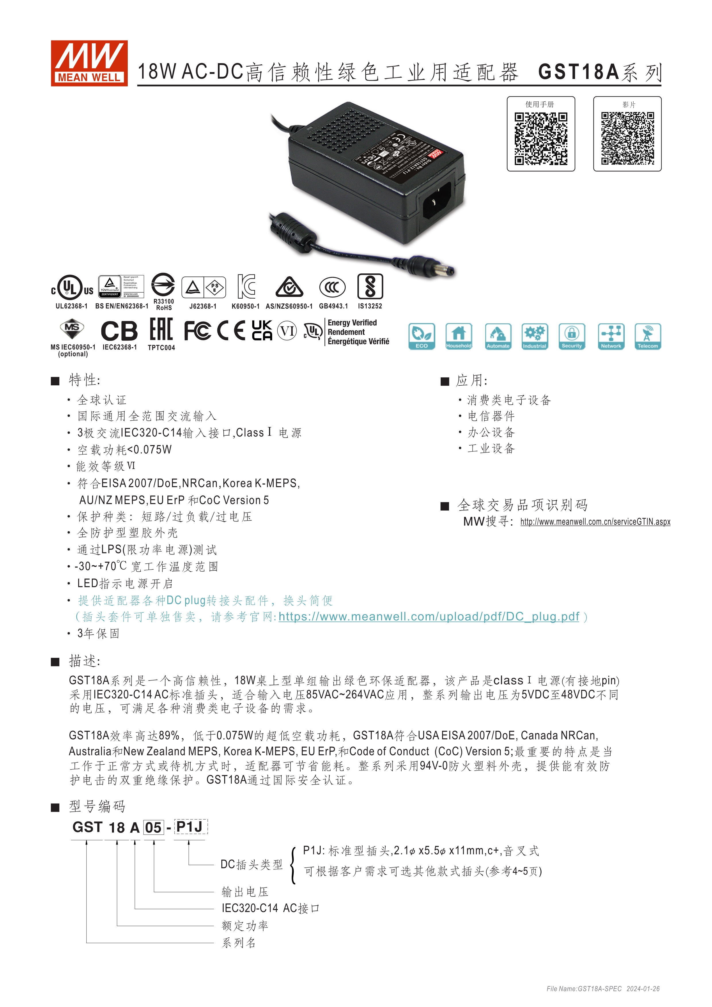 GST系列環(huán)球認證 : UL, TUV, PSE, RCM, KC, SIRIM, BIS, EAC, BSMI, CCC 能效等級Level VI 空載損耗<0.075W~0.5W 無風扇設計,工作溫度:-30~70oC A型:Class I 電源(有接地PIN),IEC 320-C14接口; B型:Class II 電源(無接地PIN),IEC 320-C8接口 多種DC輸出轉接頭可更換 3年保固期