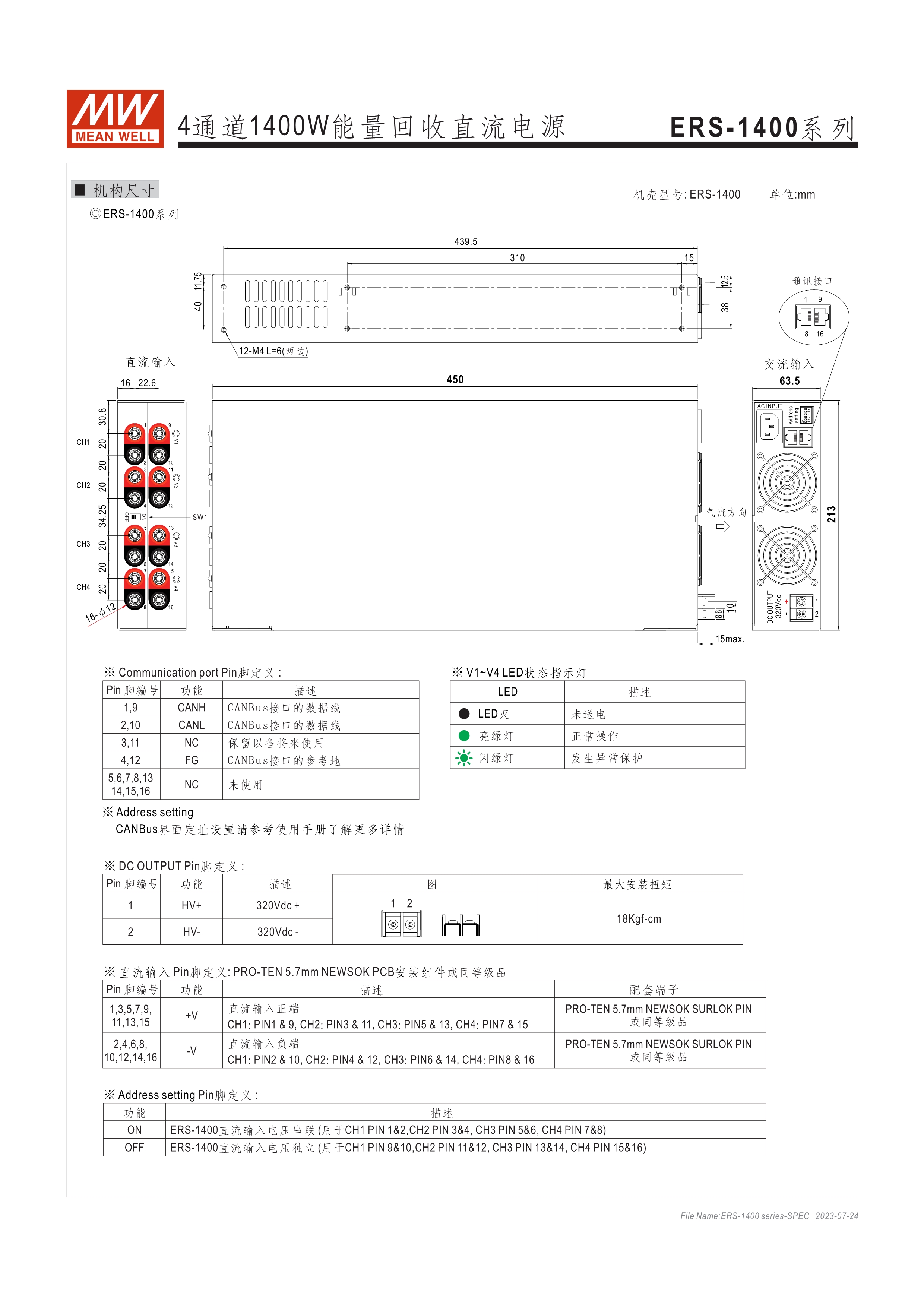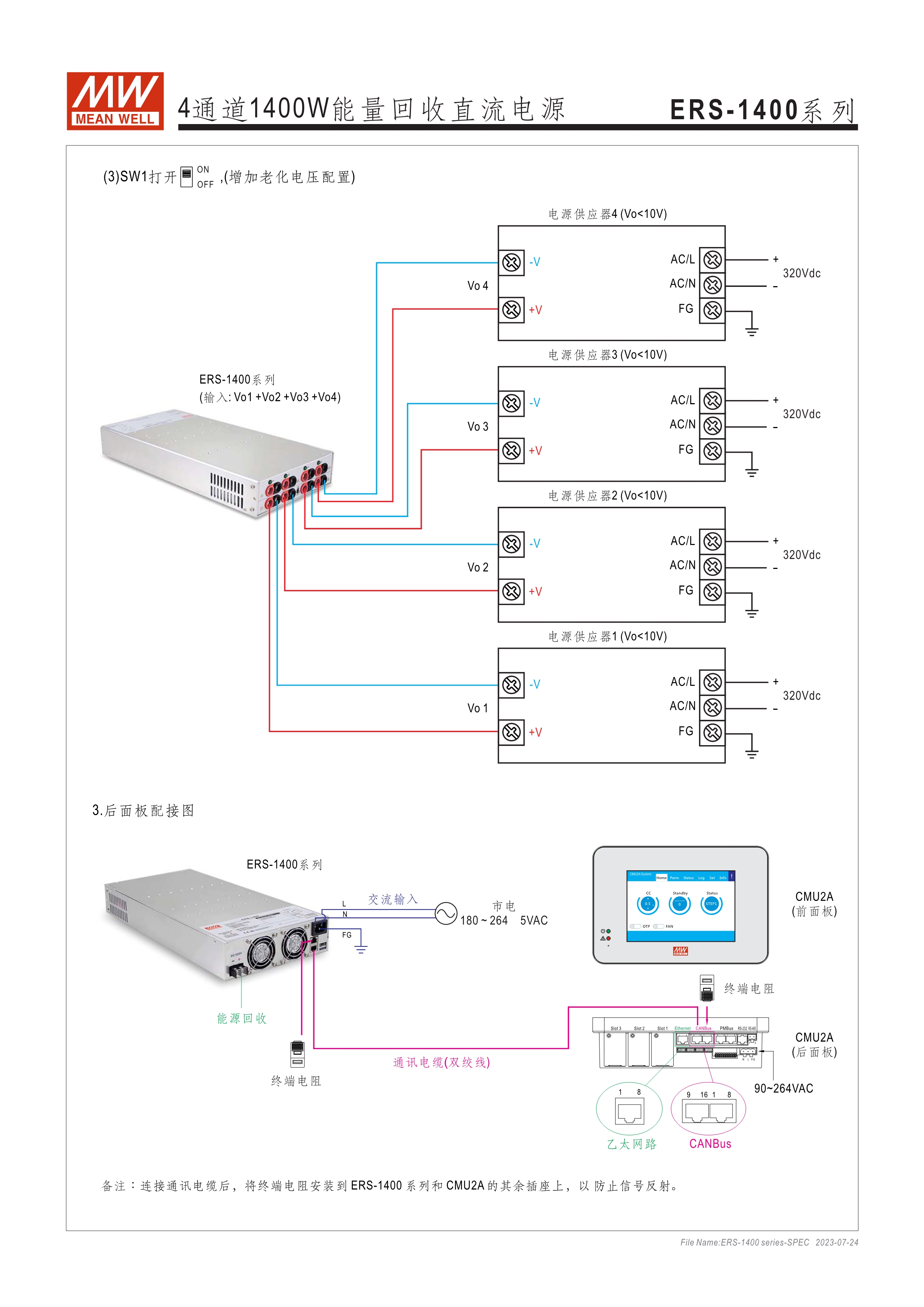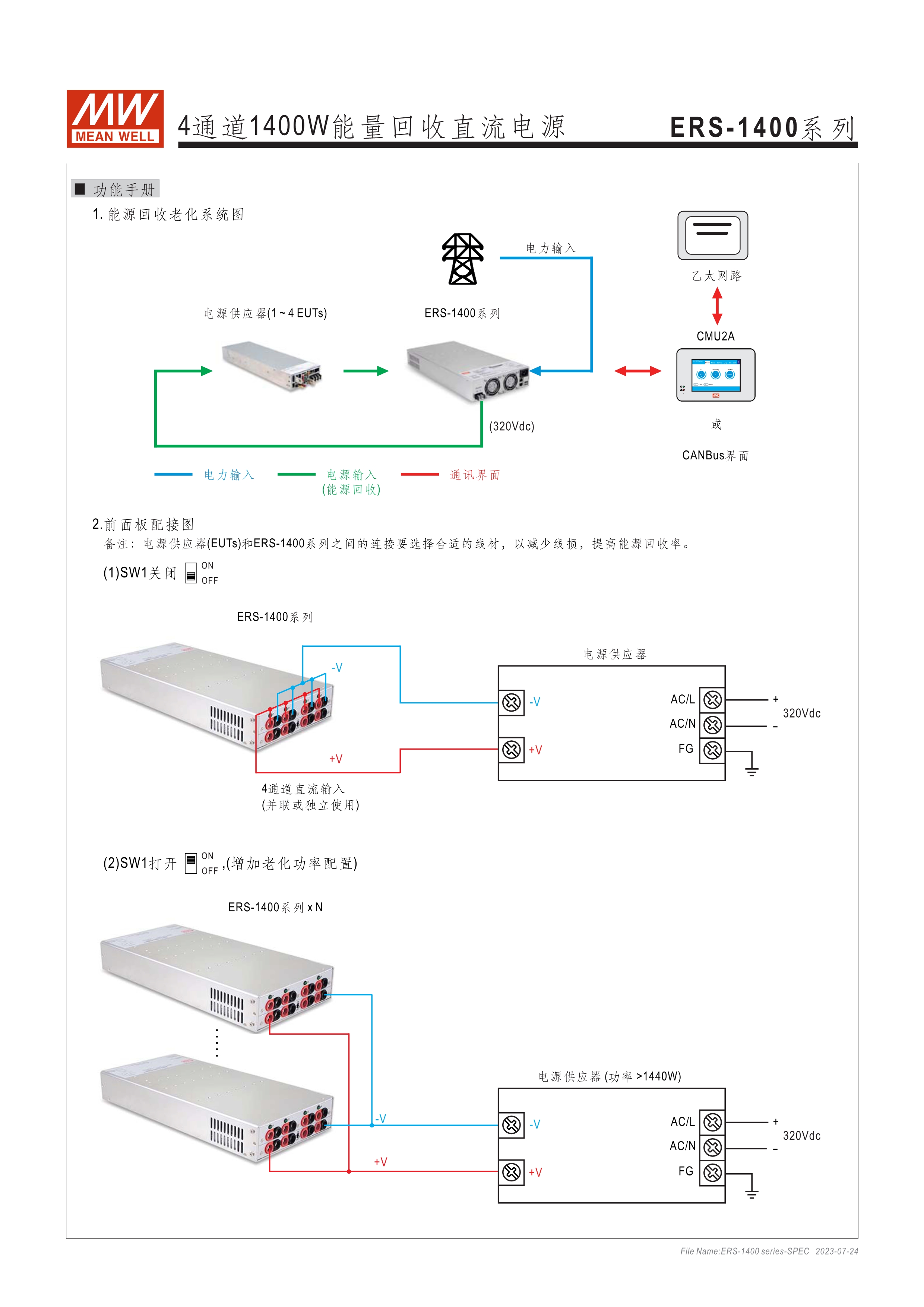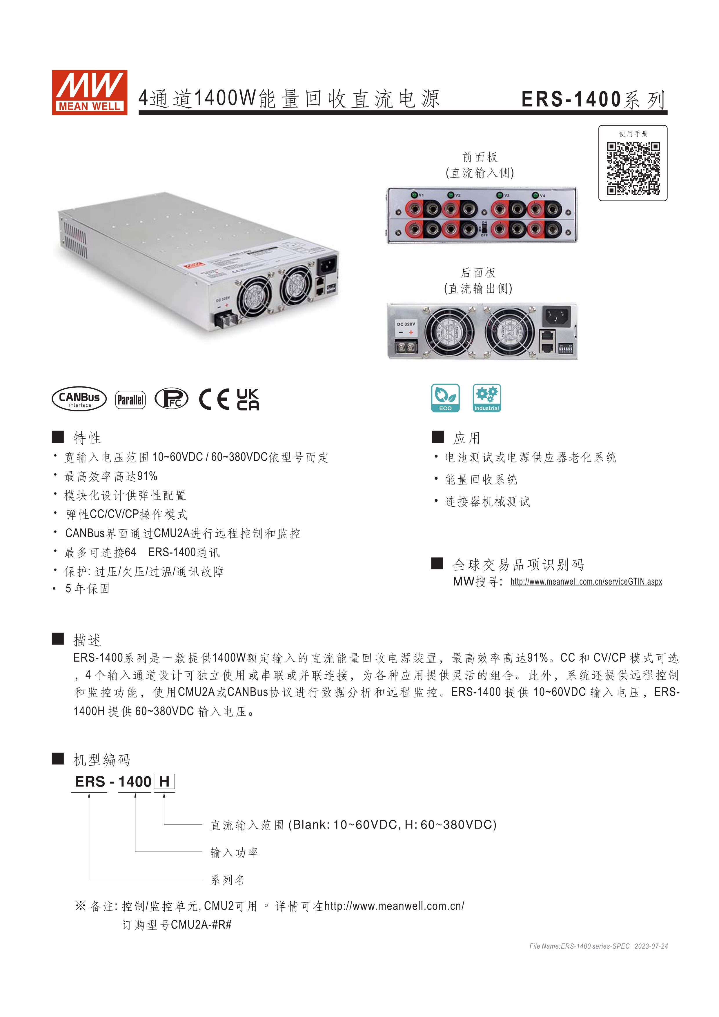 寬輸入電壓范圍10~60VDC/60~380VDC(視機型而定) 效率高達91% 靈活配置的模塊化設計 彈性的CC/CV/CP操作模式 通過CMU2A實現CAN總線協(xié)議遠程控制和監(jiān)控控制 可連接最多64臺ERS-1400系列 保護功能: 過電壓、欠電壓、過熱、通信錯誤 3年保固期