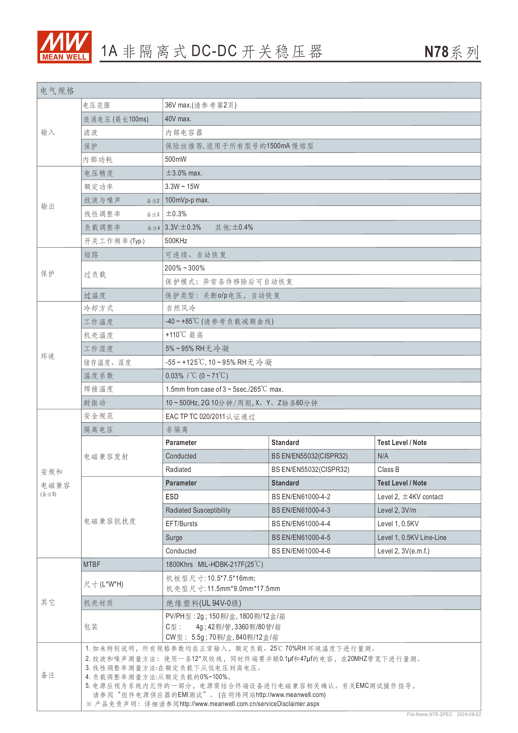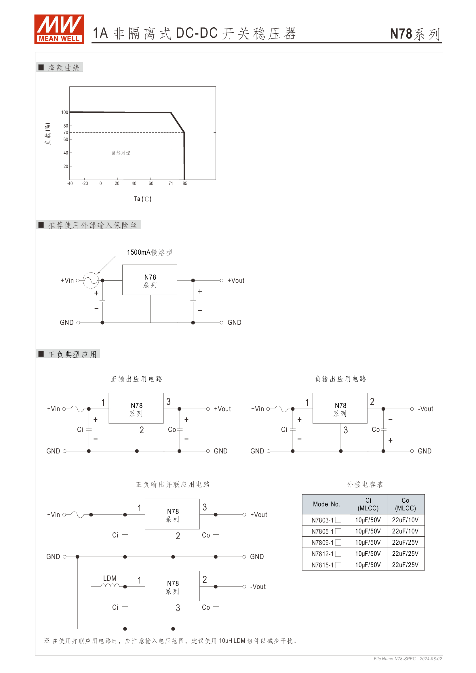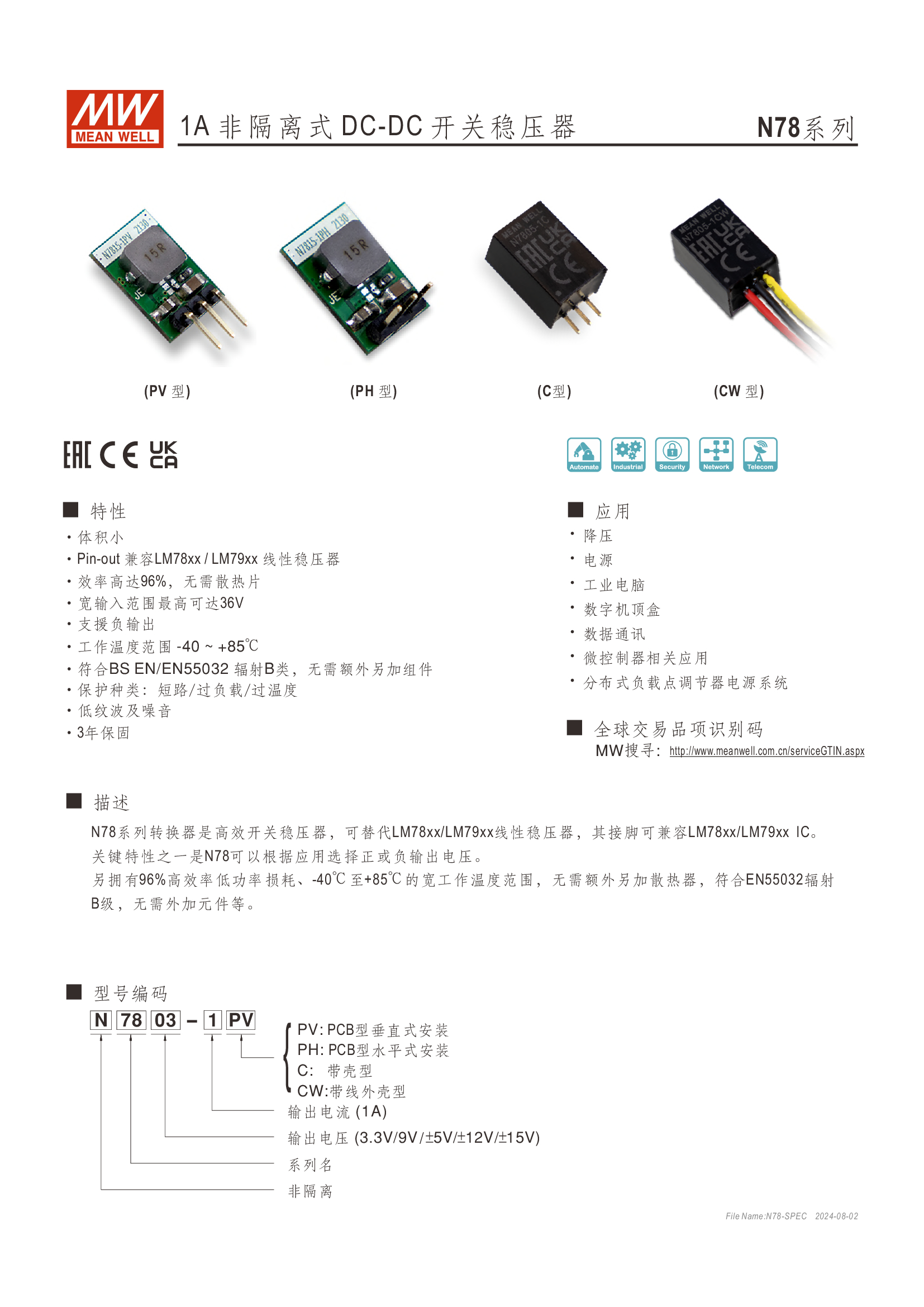 Pin-out 兼容 LM78xx/LM79xx 線性穩(wěn)壓器 效率高達 96%、無須散熱片 寬輸入范圍最高可達 36V 支援負輸出 工作溫度范圍:-40 ~ +85oC 符合 BS EN/EN55032 輻射 B 類、無需另加組件 保護種類:短路/過負載/過溫度 3 年保固