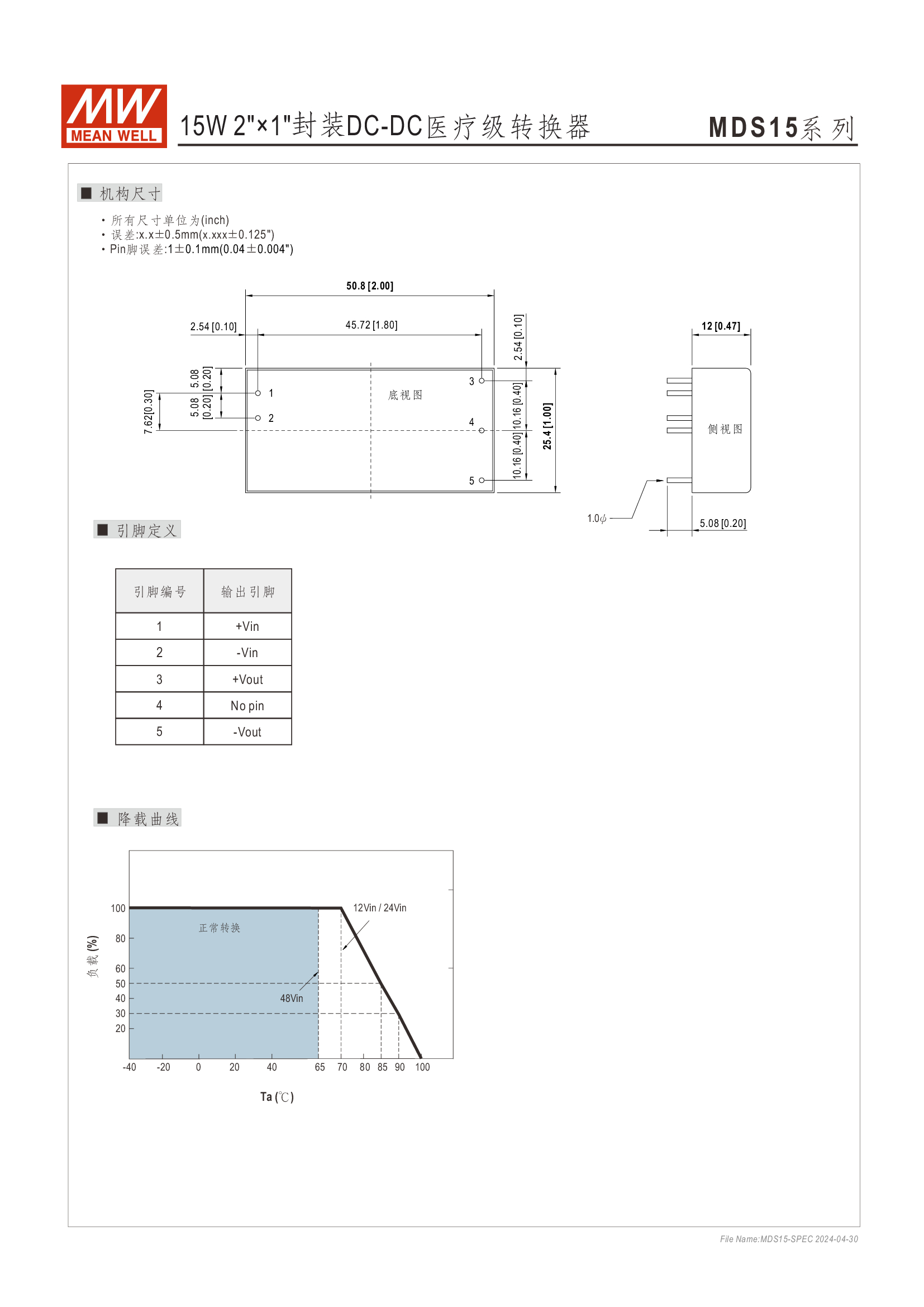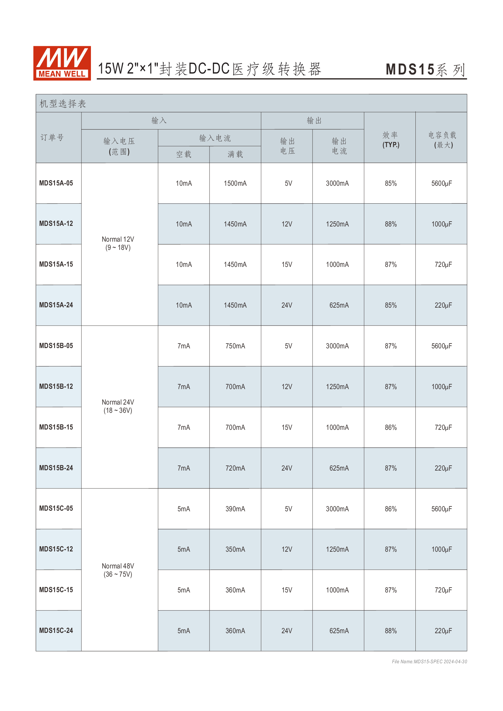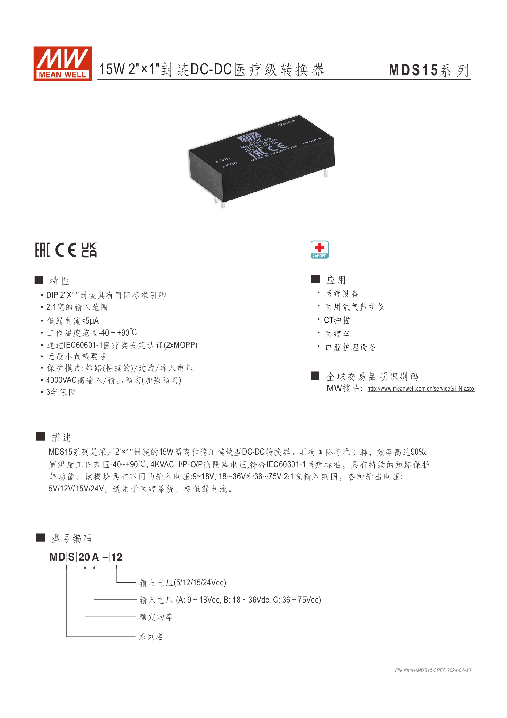 模塊型快選表 2" x 1" 單排封裝國際標(biāo)準(zhǔn)引腳 工作溫度:-40 ~ +90℃ (不需降載) 通過醫(yī)療認證ANSI/AAMI ES60601-1 (2×MOPP) 超低病患泄漏電流 < 5μA 3年保固期