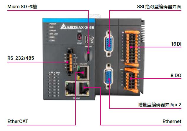 ● 內(nèi)置6?~?16 DI?/?6?~?8 DO、增量型編碼器、SSI絕對(duì)型編碼器、RS-232/422?/?485、Ethernet與EtherCAT等界面