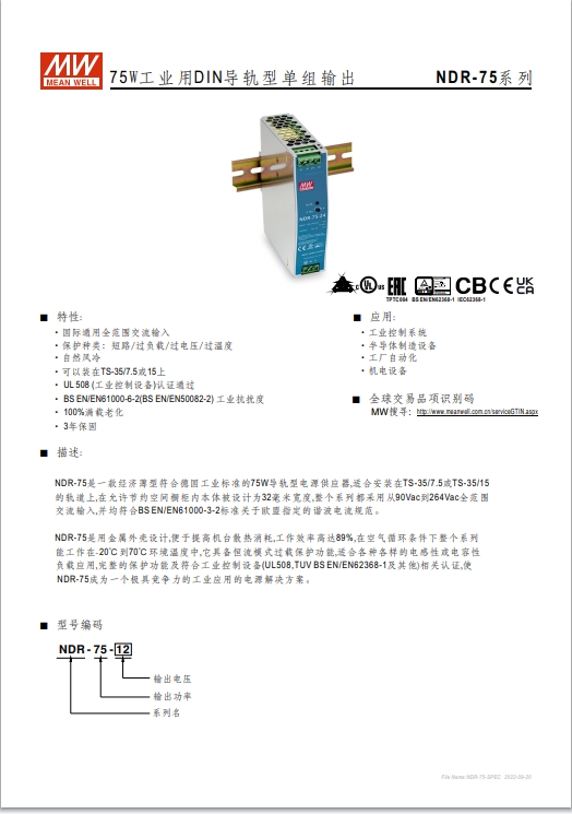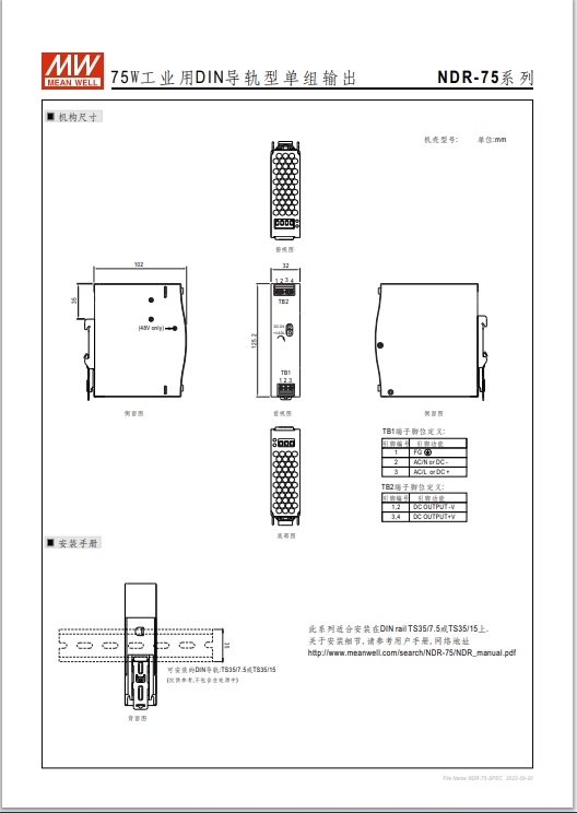 瓦數(shù): 金屬殼,經(jīng)濟(jì)款 單相, 全范圍輸入 窄面寬設(shè)計(jì):32~85.5mm EMC EN55022 class B 適合安裝于DIN rail TS-35 / 7.5或15 3年保固期