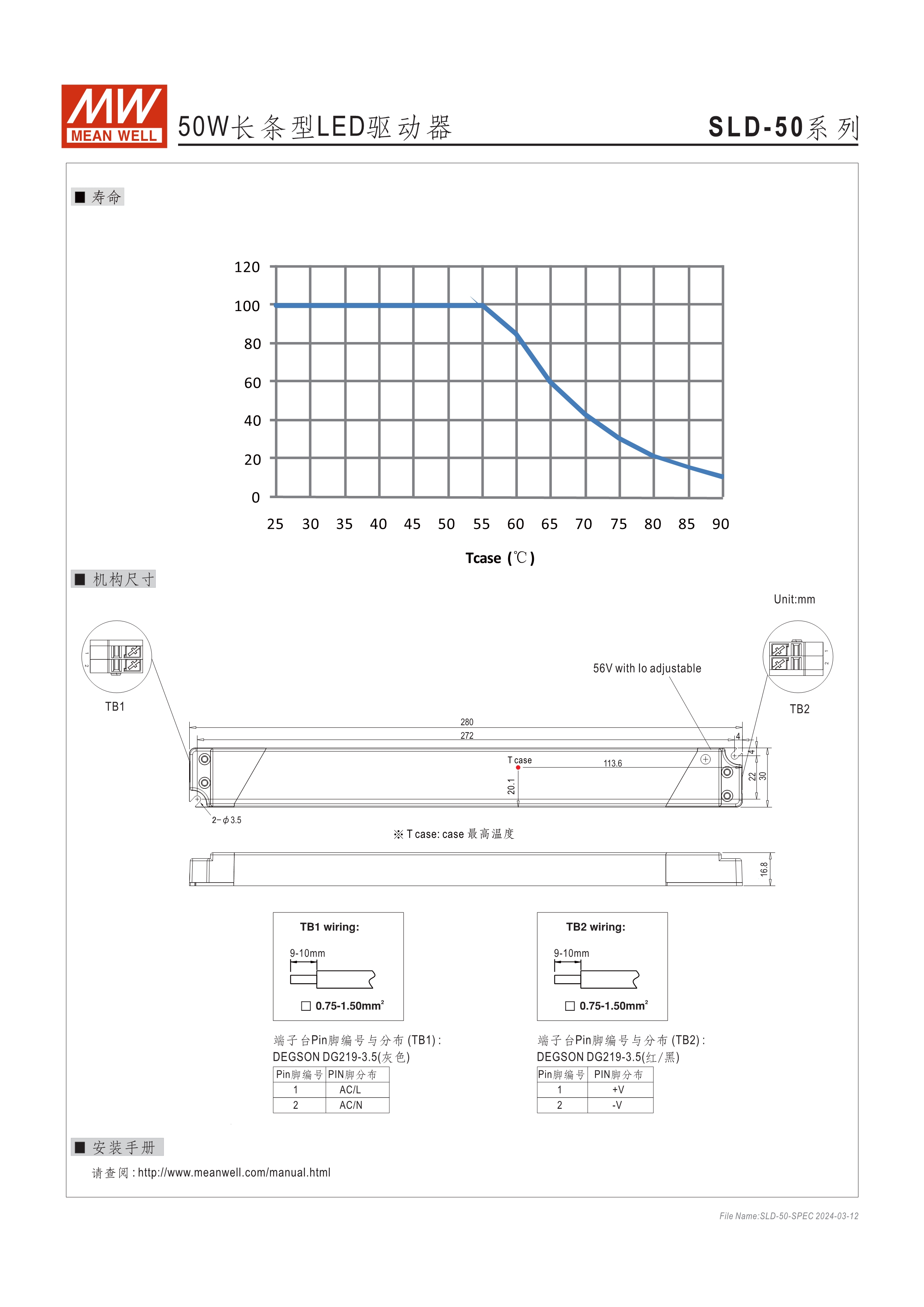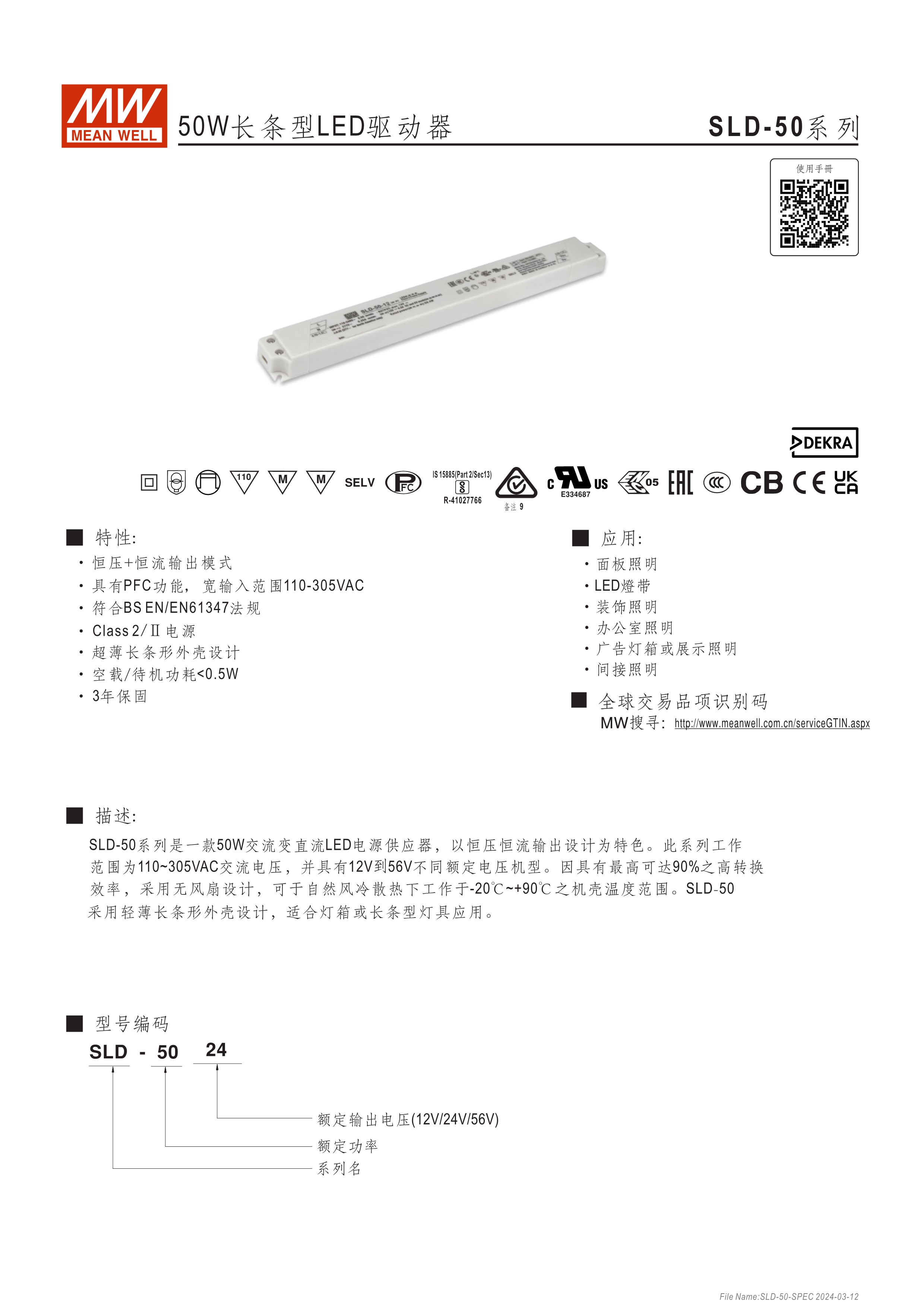 寬電壓輸入范圍110~305VAC (SLD-150為120~305VAC) 超薄(16.8mm)長條型尺寸 主動(dòng)式PFC設(shè)計(jì)及輸出效率可達(dá)90% (SLD-150效率可達(dá)93%) 符合class 2/II 設(shè)計(jì)及SELV 保護(hù)功能:短路、過電壓、過溫度 3年保固 (SLD-150為5年保固)