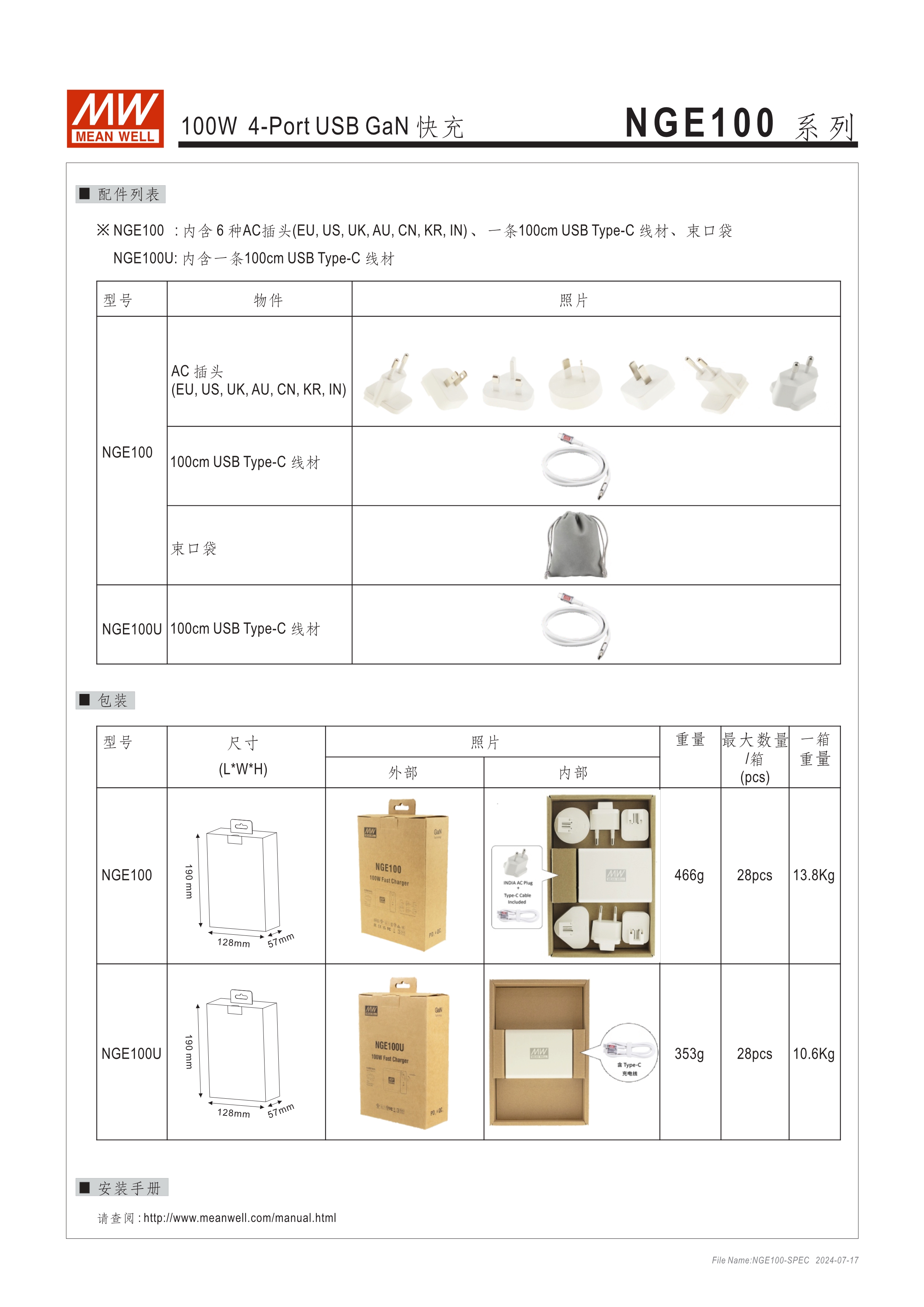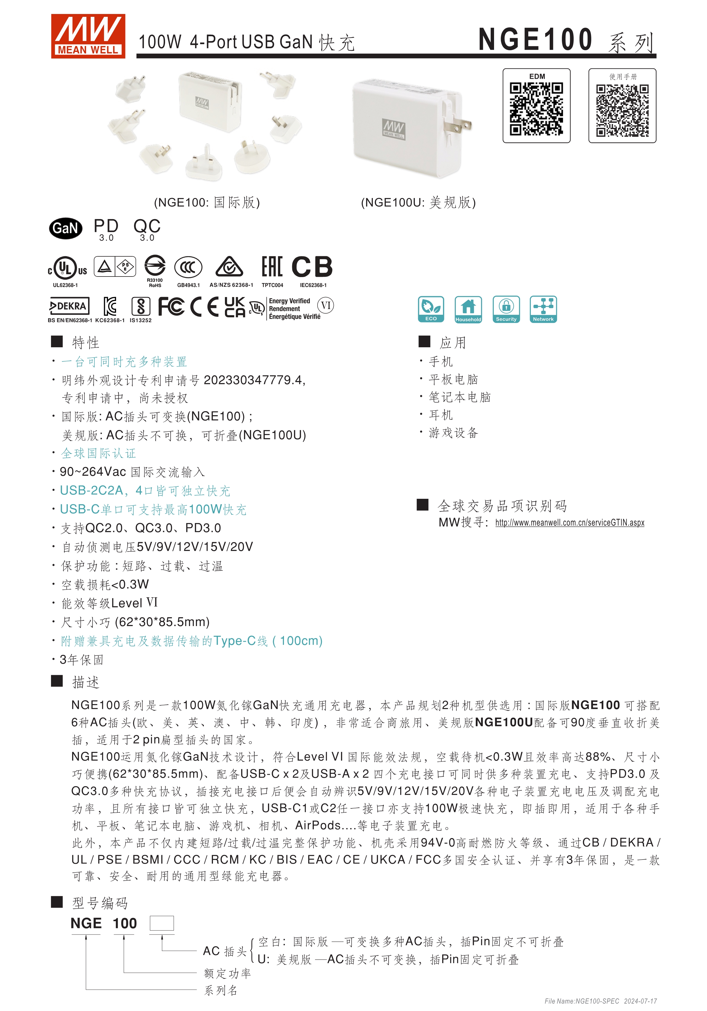 一臺(tái)可同時(shí)充多種裝置 國際版: AC插頭可變換(NGE100); 美規(guī)版: AC插頭不可換,可折疊(NGE100U) 全球國際認(rèn)證 USB-2C2A,4-Port皆可獨(dú)立快充 USB-C單port可支援最高100W快充 支援QC2.0、QC3.0、PD3.0 自動(dòng)偵測電壓:5V/ 9V/ 12V/ 15V/ 20V 保護(hù)功能 : 短路、過載、過溫 空載損耗<0.3W 能效等級(jí)Level VI 尺寸小巧 (62x 30x 85.5mm) 附贈(zèng)兼具充電及資料傳輸?shù)腡ype-C線 (100cm) 3年保固