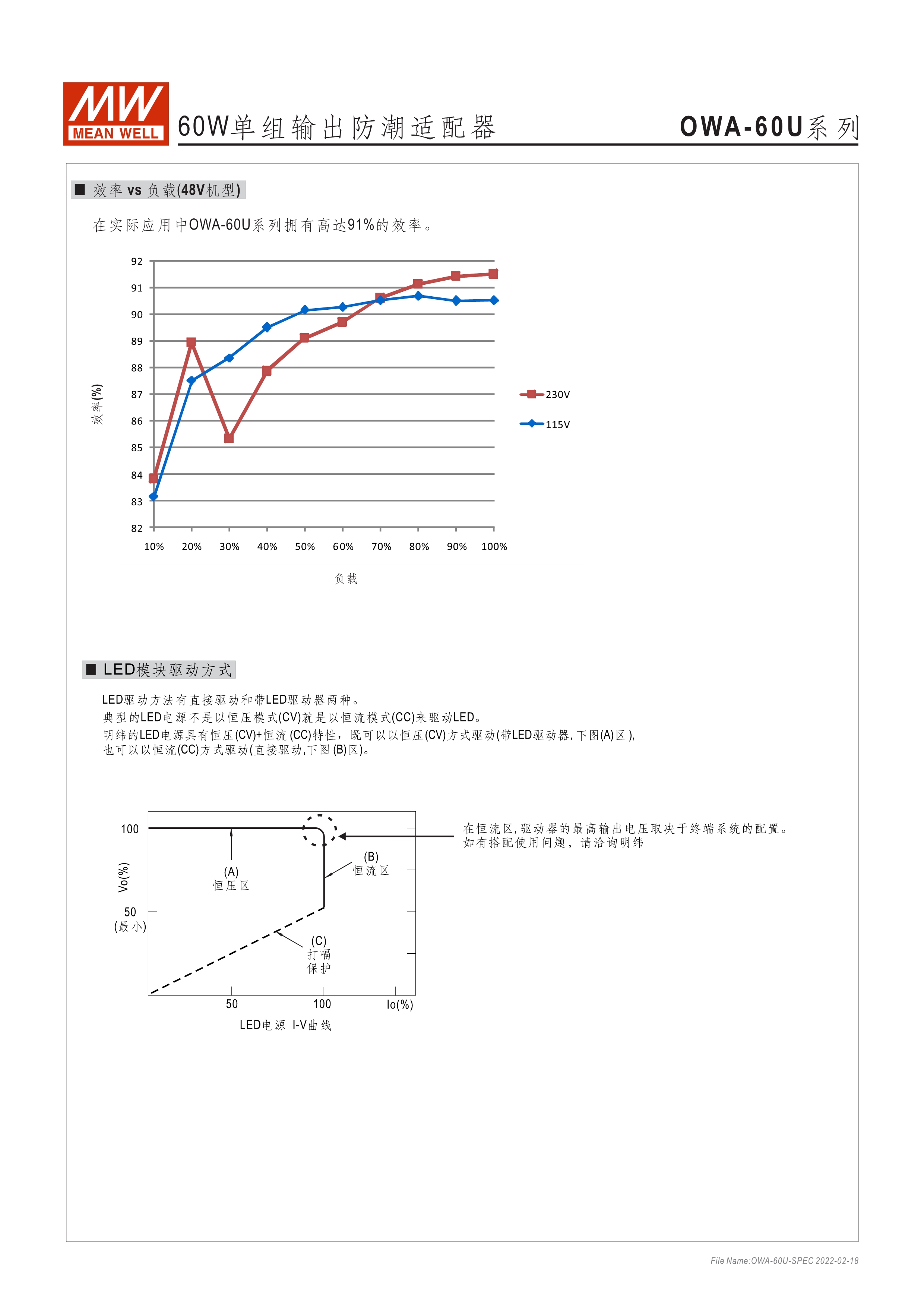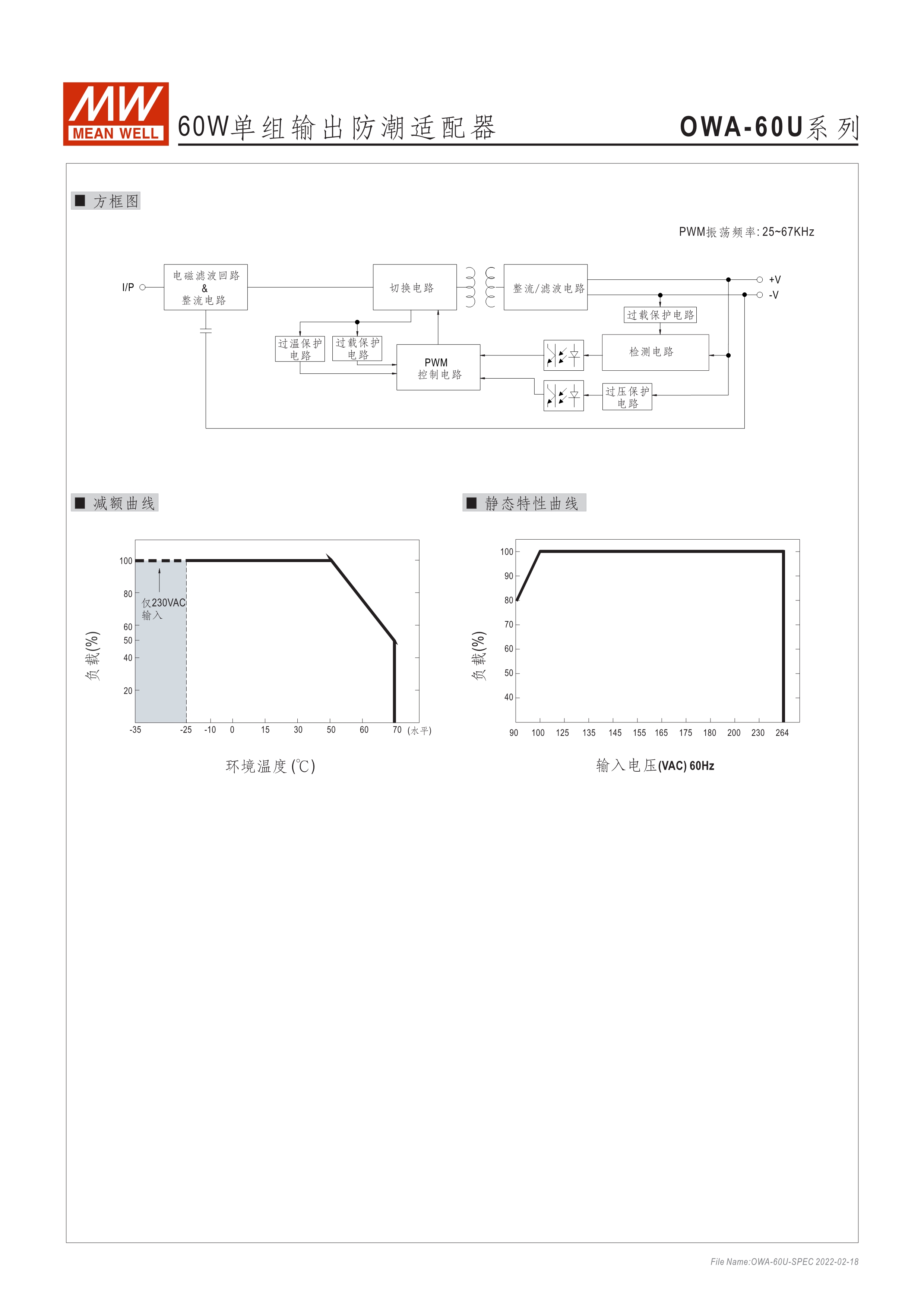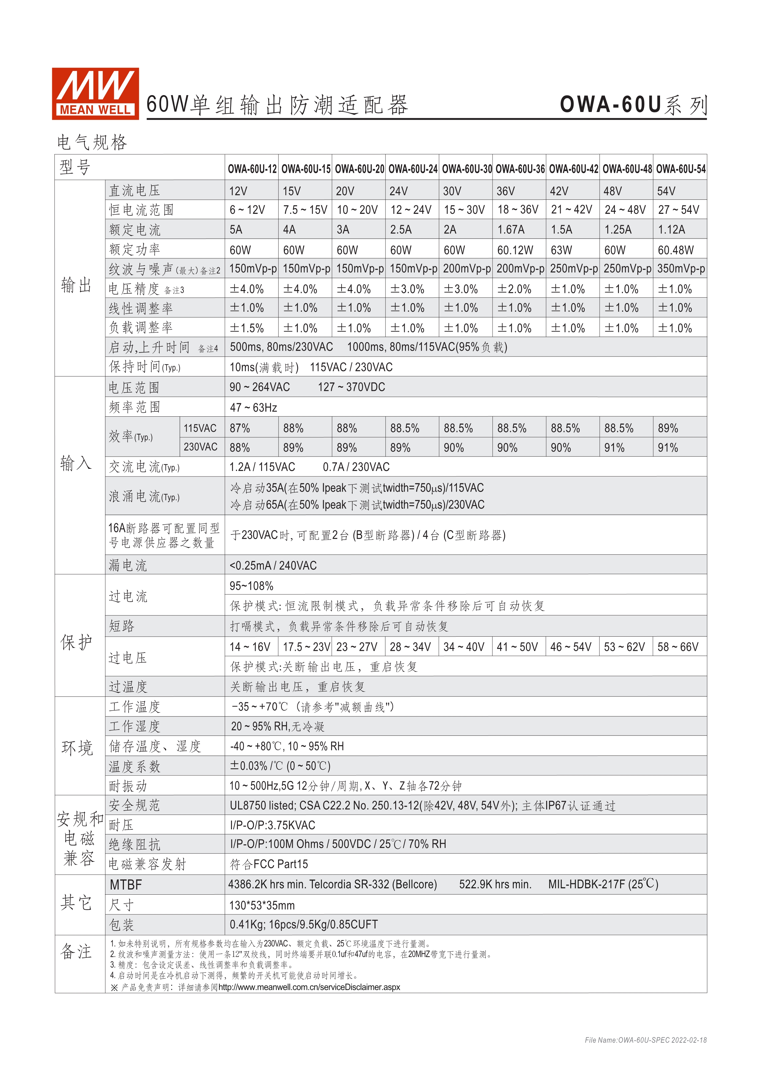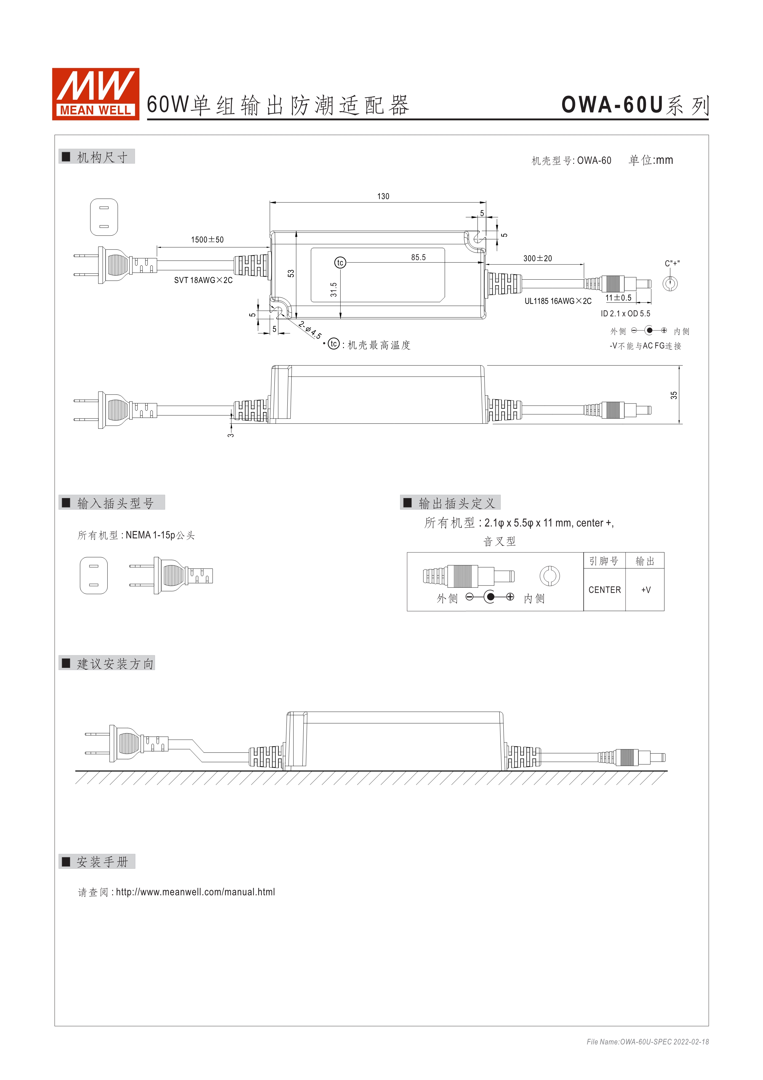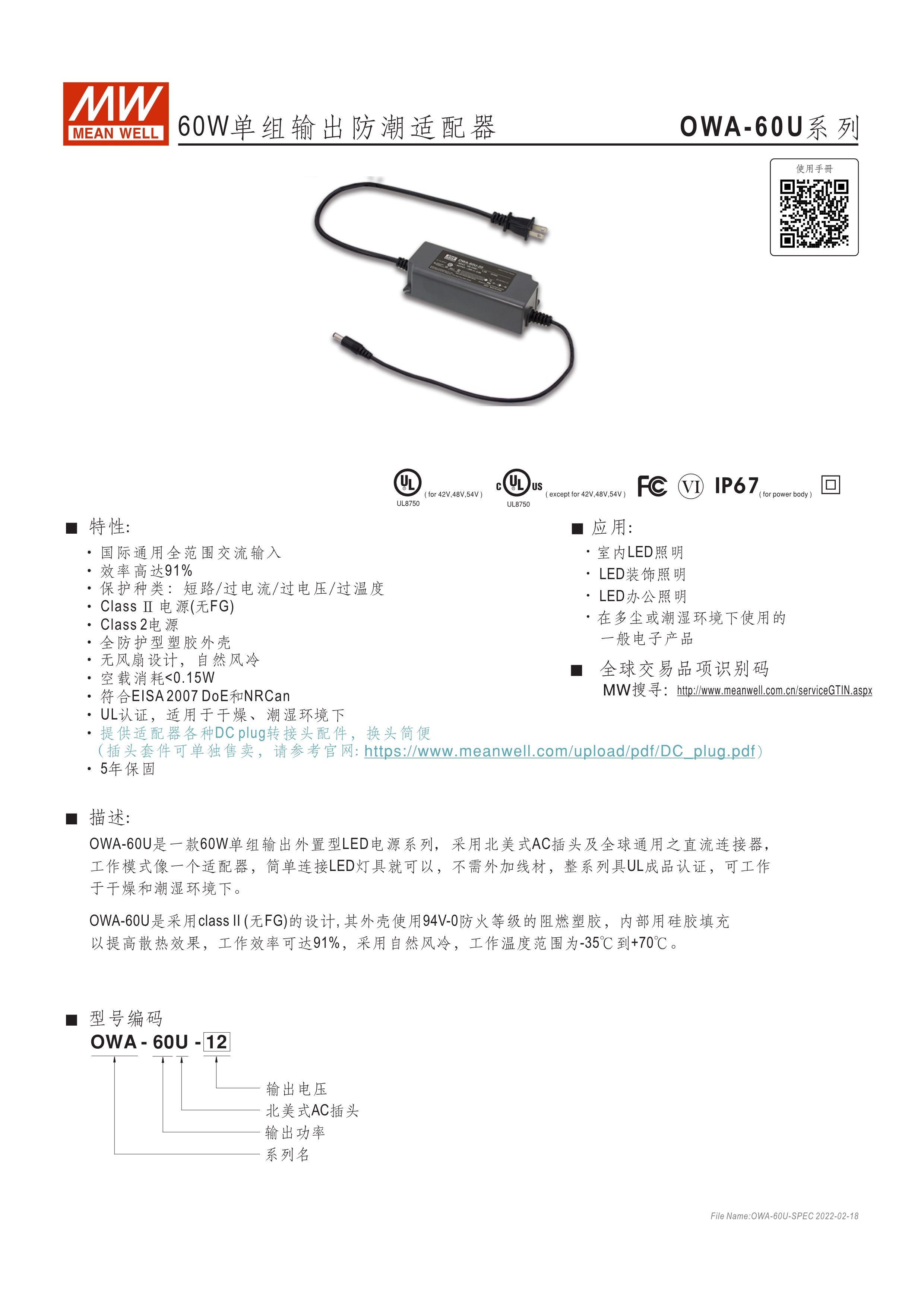 電源主體達(dá)IP67防護等級 90~264VAC交流輸入(OWA-120E為180~264VAC交流輸入) 空載損耗<0.15W 能效等級Level VI E型: 符合EU ErP 及 CoC Version 5 (OWA-120E 僅符合EU ErP) U型: 符合EISA 2007/DoE 及 NRCan Class II電源 (無FG) U型:2極美插,E型:2極歐插 多種DC輸出轉(zhuǎn)接頭可更換 5年保固期
