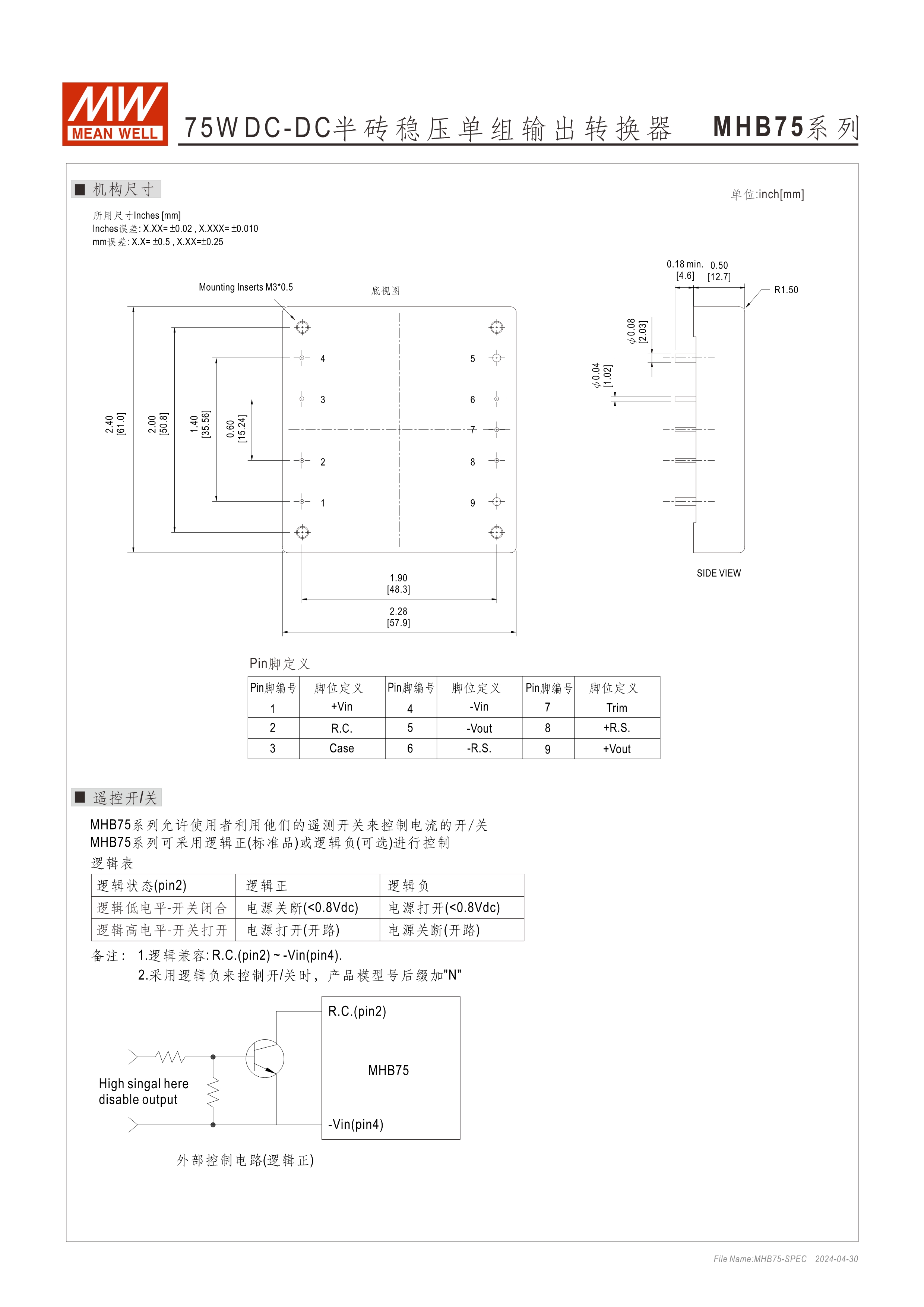 模塊型快選表 2.28” x 2.4” x 0.5”半磚尺寸 DIP封裝 2:1 寬輸入范圍 1.5KVDC 輸入/輸出隔離 內(nèi)建遙控及遙感功能 可2.5V / 3.3V / 15V 輸出 可選購(gòu)散熱片
